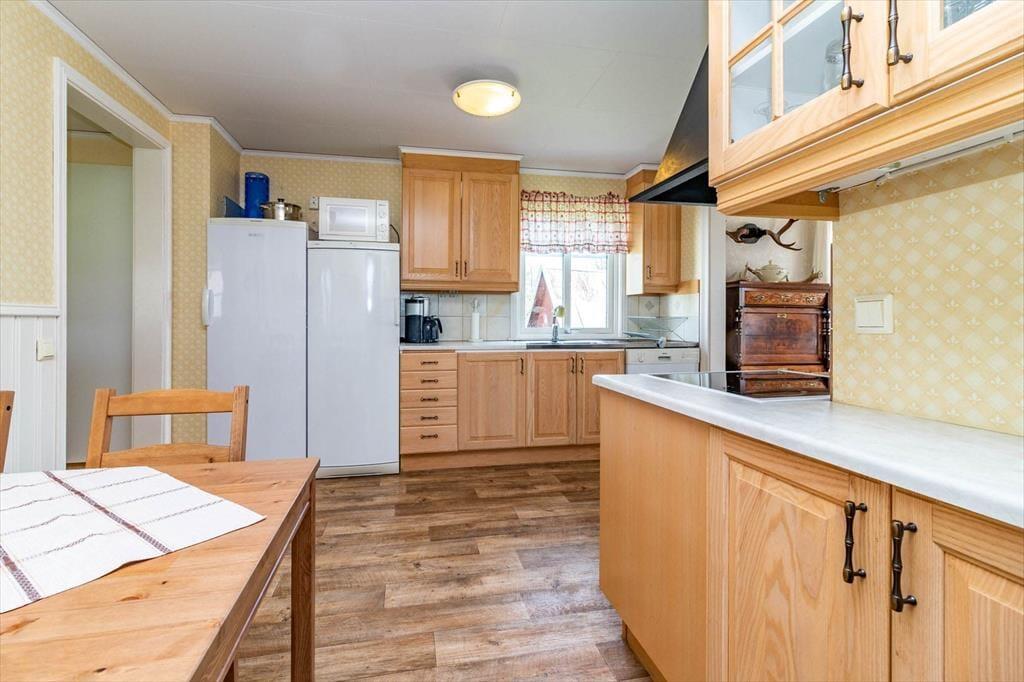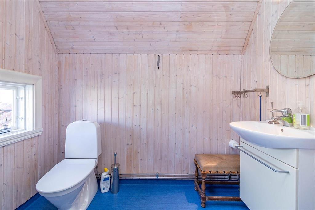 Feriehuset har ca. 140 m² og plads til op til 6 personer. Fra terrassen træder du ind i en lille entré, hvorfra husets bryggers med vaskemaskine samt badeværelse med toilet og bruser kan nås til venstre. Køkkenet er fuldt udstyret med køleskab, fryser, 4-pladers keramisk kogeplade med ovn, opvaskemaskine, mikrobølgeovn, kaffemaskine og emhætte og har en lille spiseplads. Den store spise- og stue er hyggeligt indrettet med spisebord til 6 personer, to lædersofaer, TV og pejs – brænde er inkluderet. Internet kan bruges gratis.