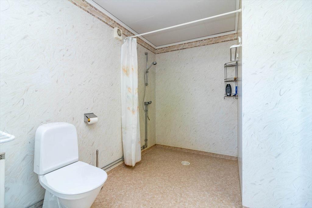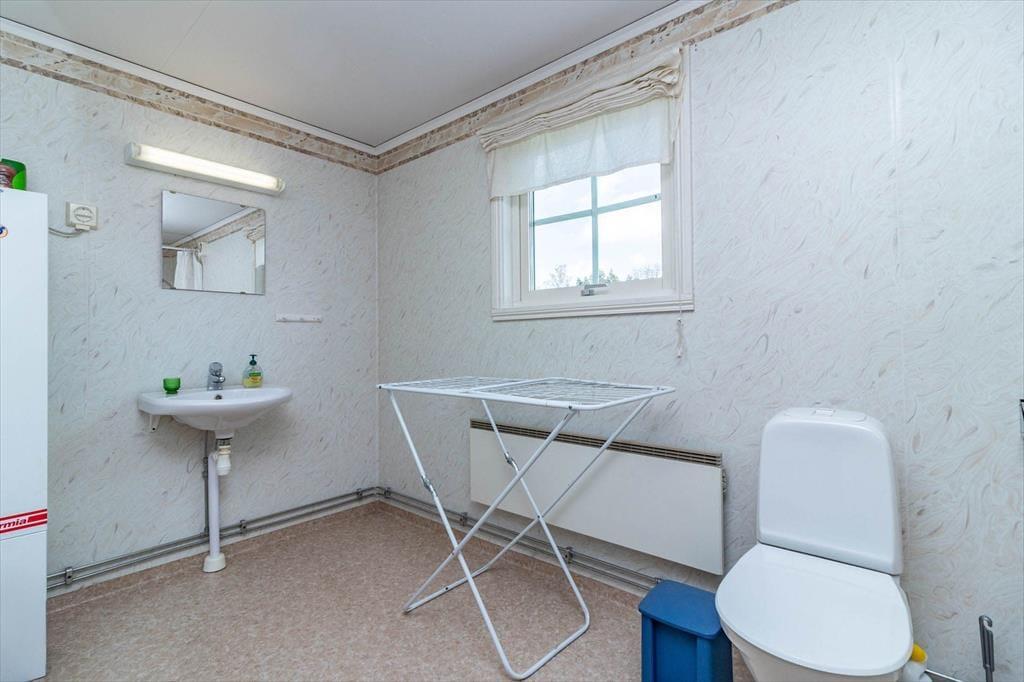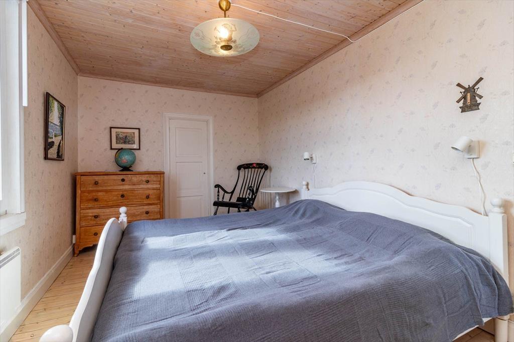 Via en gang med trappe kommer du til førstesalen med gæstetoilet og tre soveværelser: to med dobbeltseng og et gennemgangsværelse med sovesofa. Huset opvarmes med luftvarmepumpe.