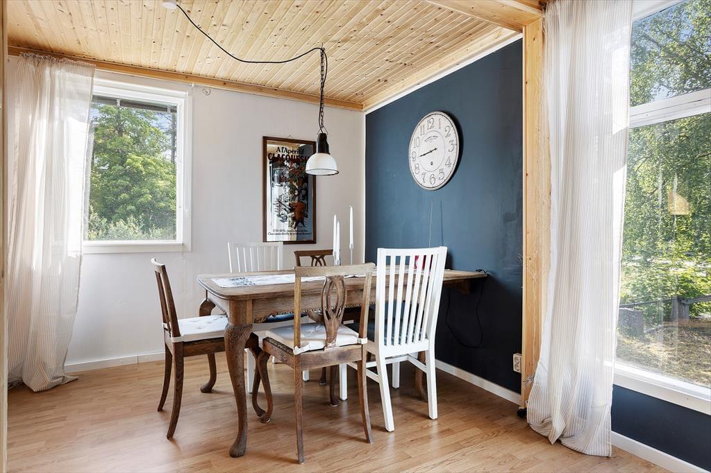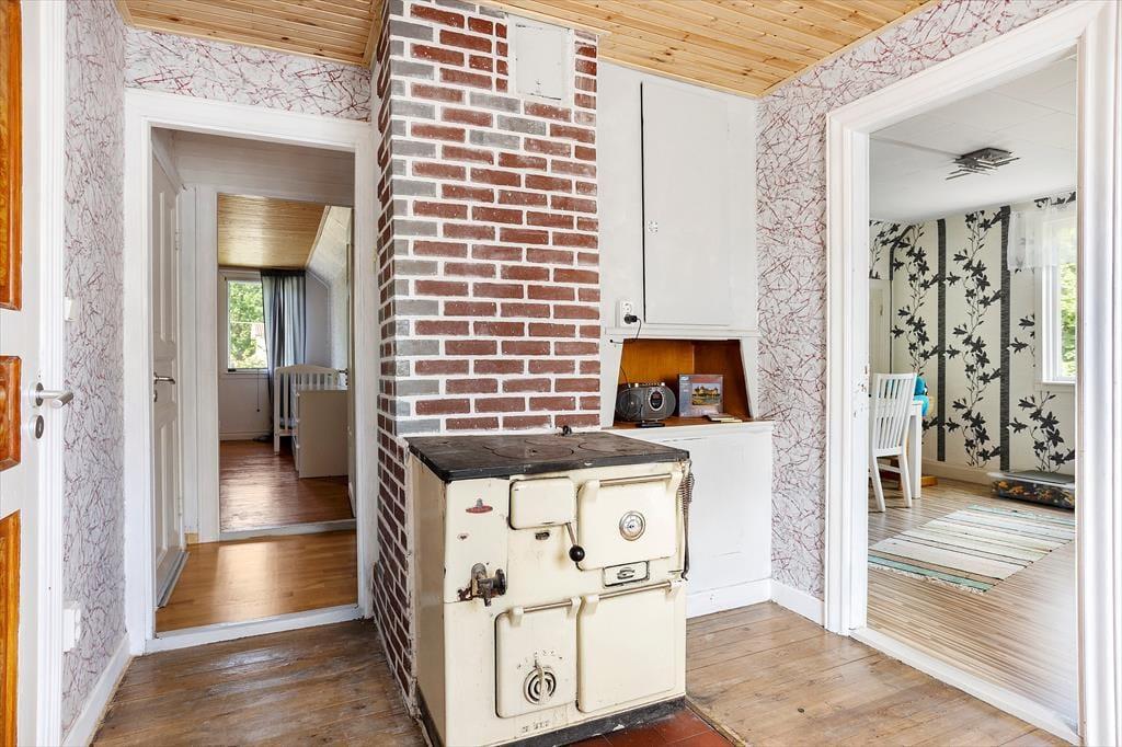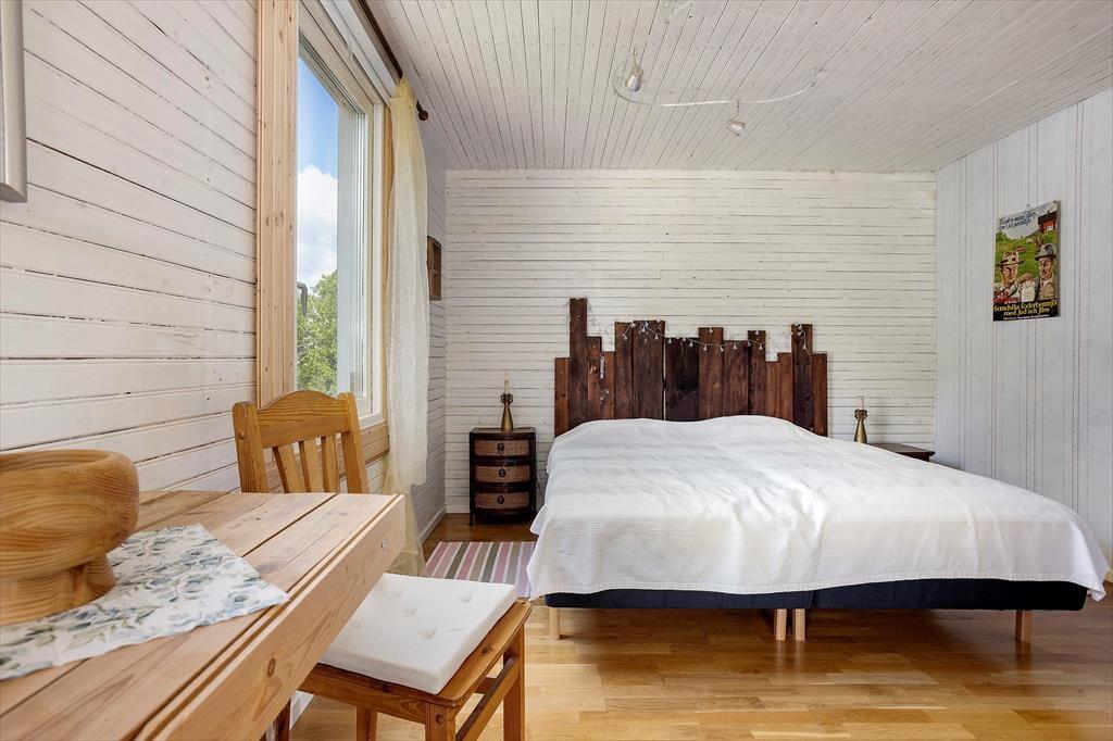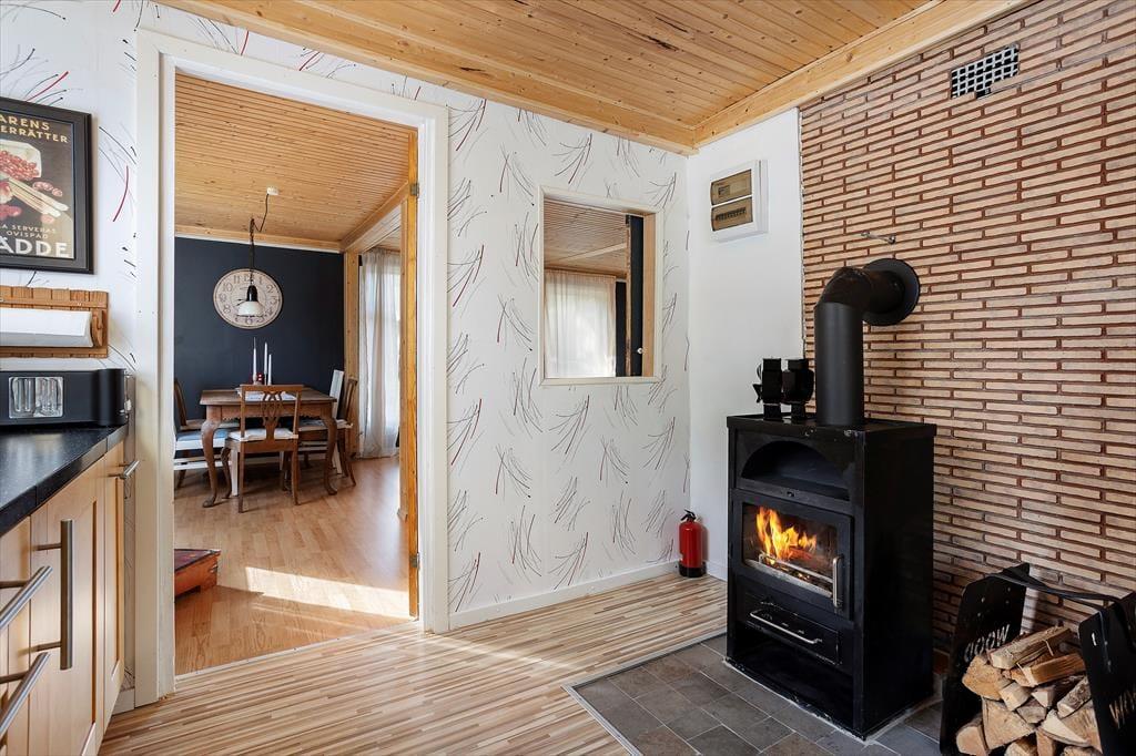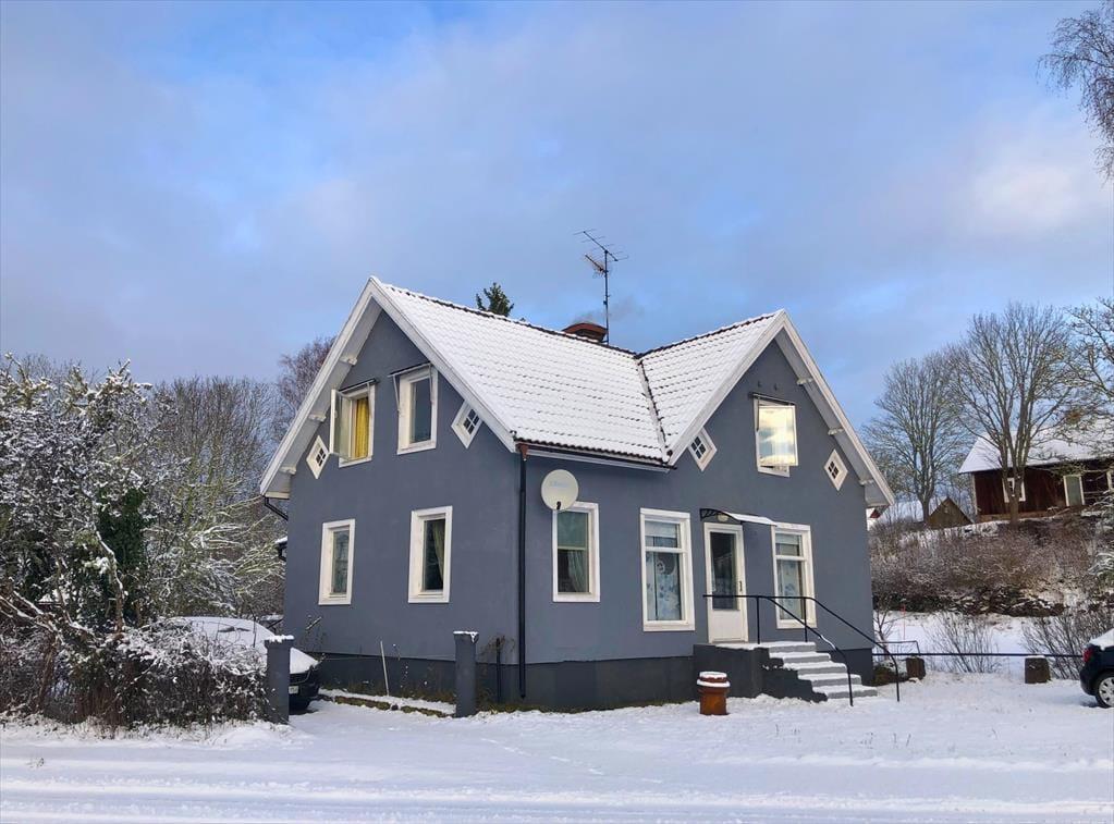 Bei dem zentral in der kleinen Ortschaft auf einem etwa 700 m² großen Gartengrundstück liegenden Ferienhaus mit einer Wohnfläche von etwa 140 m² handelt es sich um ein früheres Kolonialwarengeschäft mit dazugehöriger Wohnung, das in den Jahren 20/21 umfassend und gründlich renoviert und zum Urlaubsdomizil umgebaut wurde. Über eine kleine Eingangsterrasse betritt man das Haus und gelangt durch einen geräumigen Flur, von dem auch die Treppe ins Obergeschoss führt, in die moderne Wohnküche, ausgestattet mit Geschirrspüler, Elektroherd mit Glaskeramikkochfeld und Backofen, Kühl- Gefrierkombination, Mikrowelle und Kaffeemaschine. Von der Küche aus gelangt man zum einen in ein Badezimmer mit WC, Dusche und Handwaschbecken und auf der gegenüber liegenden Seite in ein etwa 30 m² großes kombiniertes Wohn-/Esszimmer mit Essecke, Sitzgruppe mit Smart TV an. An dieses Zimmer schließt sich das eine im Erdgeschoss liegende, mit einem Doppelbett möblierte Schlafzimmer an. Die beiden weiteren Schlafzimmer, ebenfalls mit Doppelbetten möbliert, befinden sich im Obergeschoss des Hauses; ein Kinderbett und ein Kinderstuhl stehen zur Verfügung. Im Obergeschoss gibt es außerdem einen kleines Spielzimmer mit Kinderbüchern, Lego, großer Spielesammlung und einer Schlafcouch, ein zusätzlicher Fernseher mit deutschen Programen sowie ein Lesezimmer mit kleiner Bibliothek. WLAN steht zur Verfügung und das Streamen ist ruckelfrei möglich. Das Haus hat fließend kaltes und warmes Wasser und kann elektrisch und mit dem in der Küche befindlichen Kaminofen beheizt werden. Den Gästen stehen darüber hinaus Gartenmöbel und Grill sowie Waschmaschine und Trockner zur Verfügung. Genutzt werden dürfen außerdem zwei 3-er Kanus und zwei 1-er Kajaks.