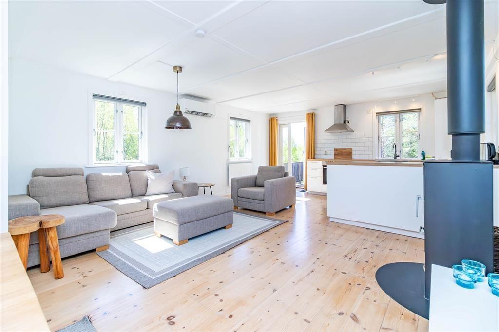 Feriehuset har ca. 76 m² og plads til op til 4 personer. Der er to soveværelser: ét med dobbeltseng og ét med enkelseng. Badeværelset har WC, bruser og vaskemaskine. Den åbne stue-, spise- og køkkenløsning skaber et indbydende rum til madlavning, spisning og afslapning. Spiseområdet har et bord med fire stole, stuen har sofa, lænestol, smart-TV og pejs, og et kontor med skrivebord fuldender komforten. Køkkenet er fuldt udstyret med 4-plade induktionskomfur, ovn, emhætte, køle- og fryseskab samt kaffemaskine. Huset opvarmes med elvarme og luftvarmepumpe. Internet er tilgængeligt via Starlink. Udendørs kan du nyde terrassen med havemøbler, grill og parkeringsplads.