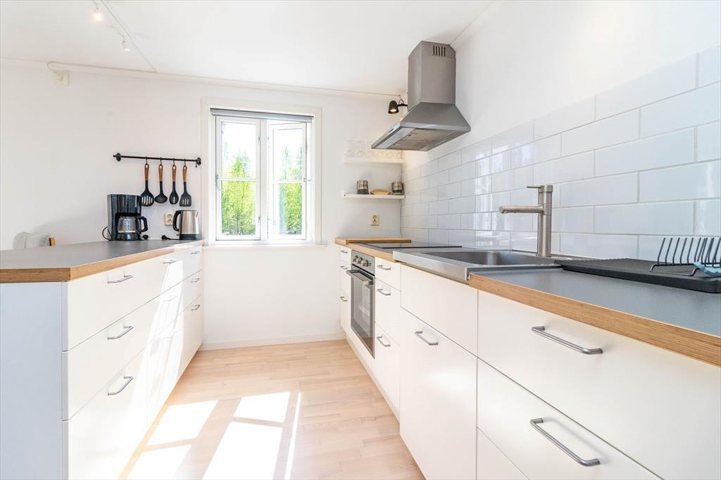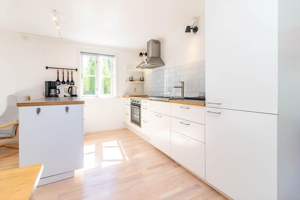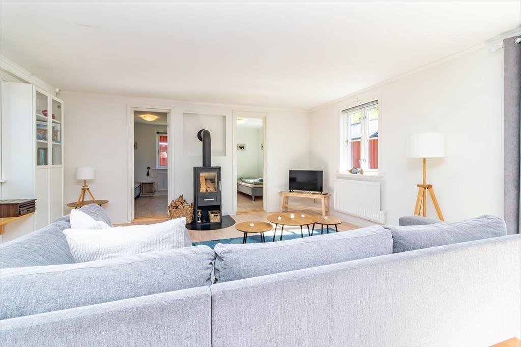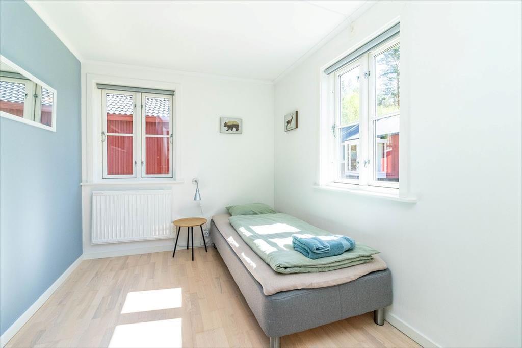 Feriehuset har ca. 93 m² boligareal og plads til op til 5 personer. Det rummer fire soveværelser: ét med dobbeltseng og tre med enkeltsenge. Badeværelset er udstyret med toilet, bruser og vaskemaskine. Køkkenet byder på alt, hvad du behøver for komfortabel selvforplejning: 4-pladers induktionskomfur, ovn, emhætte, køle/fryseskab og kaffemaskine. Spiseområdet har plads til op til seks personer, og i stuen finder du en hyggelig hjørnesofa, smart-TV, internet via Starlink og en brændeovn. Huset opvarmes derudover elektrisk. Udendørs findes der en terrasse med havemøbler, grill og parkeringsplads. På grunden står der i alt 6 kanoer og to robåde til rådighed for gæsterne i de fem feriehuse.