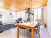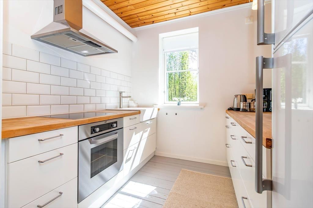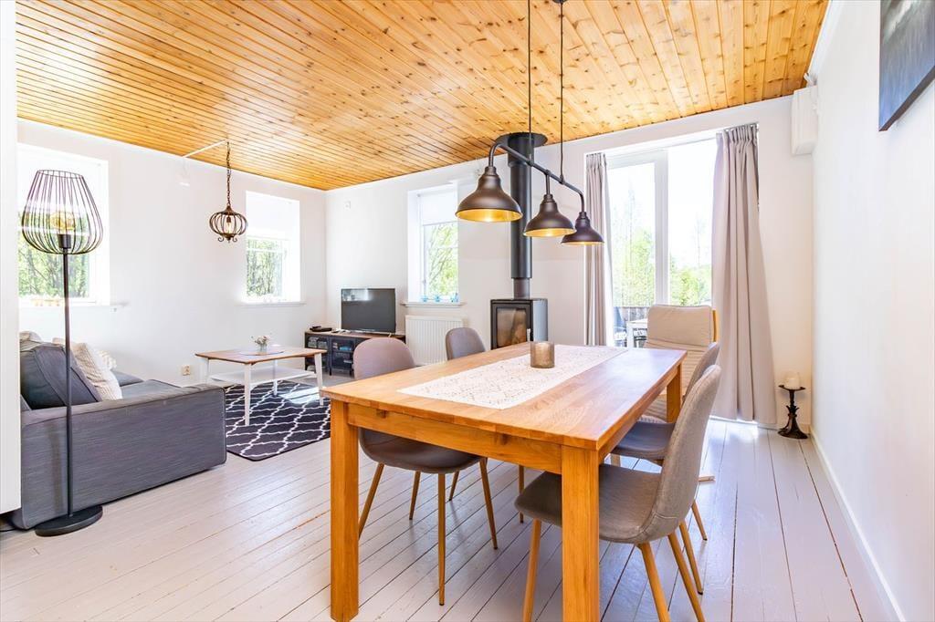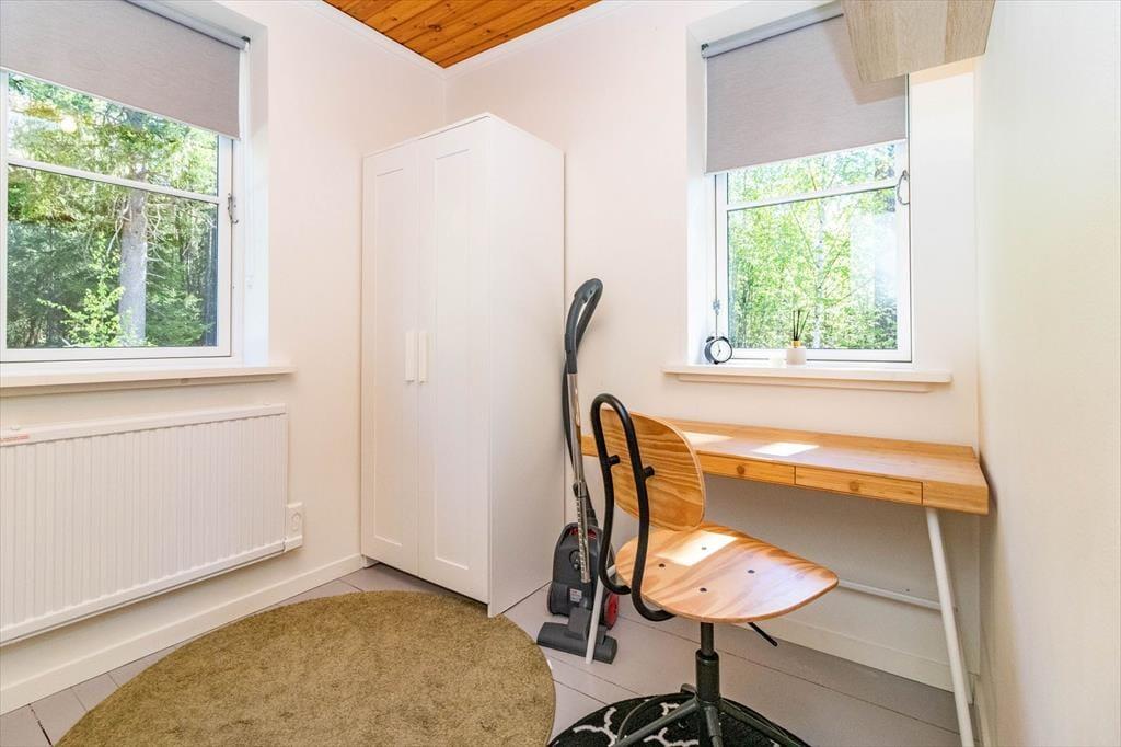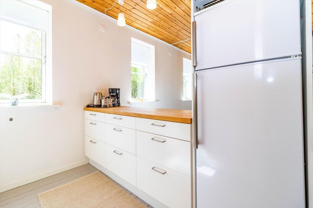 Feriehuset byder på ca. 68 m² og har plads til op til 4 personer. Du træder ind i den åbne stue- og spisestue, hvor der står et spisebord og endda et klaver. Den tilstødende opholdsstue med sofa, smart-TV og brændeovn virker lys og indbydende – særligt på kølige aftener. Herfra har du direkte adgang til terrassen med hængekøje. Køkkenet ligger ved siden af og er udstyret med et 4-pladers induktionskomfur med ovn, emhætte, køleskab med fryser og kaffemaskine. Et åbent område forbinder køkken og stue og skaber en luftig rumfornemmelse. Via gangen når du to soveværelser – et med køjeseng og et med dobbeltseng – samt badeværelset og et arbejdsværelse med skrivebord. Huset opvarmes elektrisk. Badeværelset har toilet, bruser og vaskemaskine. Der er gratis internet via Starlink. Der hører desuden en kano til huset (i alt 6 kanoer på området) samt en robåd (i alt to robåde), som kan benyttes efter aftale med de øvrige gæster. Udendørs finder du en terrasse med havemøbler, grill og parkeringsplads.
