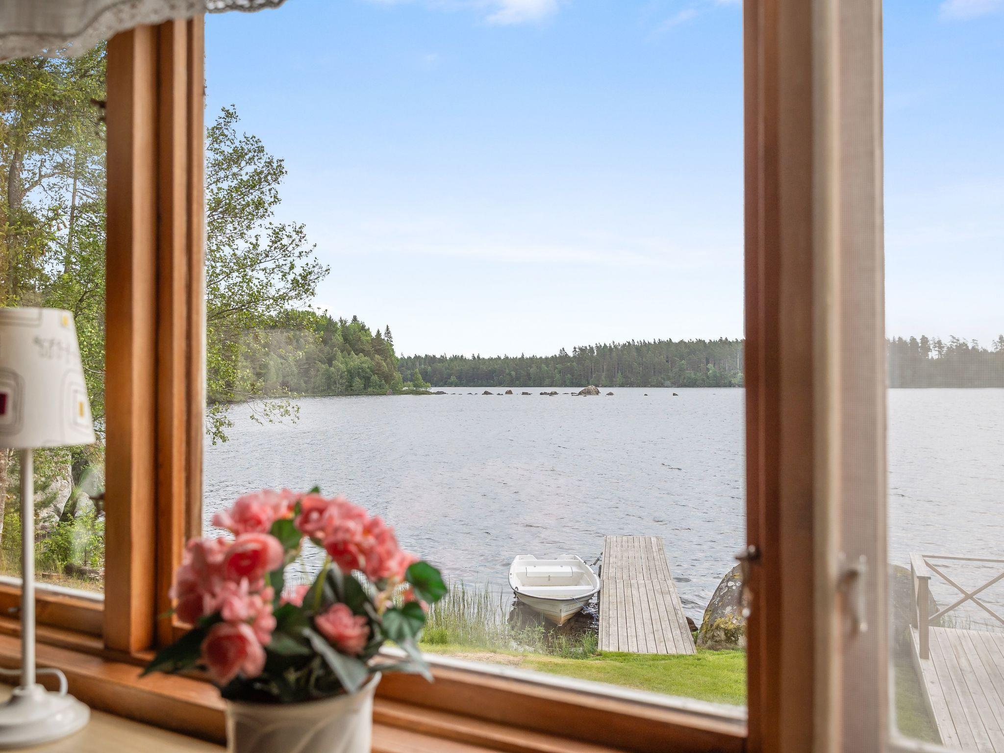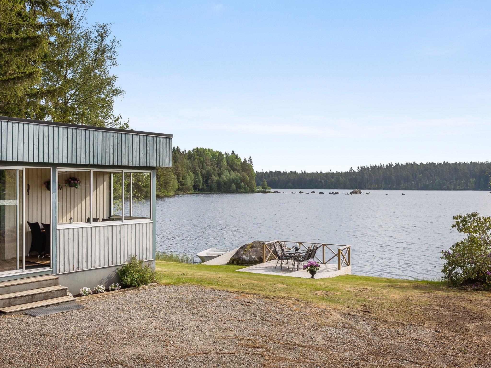 House "Sjöatorp Skogsstugan". Property composed of main house and outbuilding 5 km from the centre of Hjortsberga, 11 km from the centre of Alvesta, 27 km from the centre of Växjö, 10 m from the lake, in a cul-de-sac, in the countryside. Private: natural state property 1'000 m2 with trees, meadow. Bathing jetty. Rowing boat, parking (for 2 cars) on the premises. Shop 11 km, supermarket 27 km, bus stop 4.8 km, railway station "Alvesta" 11 km, ferry "Helsingborg" 165 km, indoor swimming pool 11 km. Golf course (18 hole) 12 km, fishing possibilities 10 m. Please note: fishing [permit required], private mooring.
