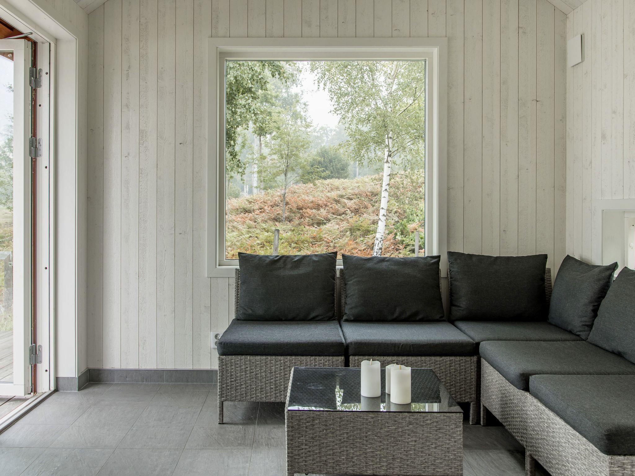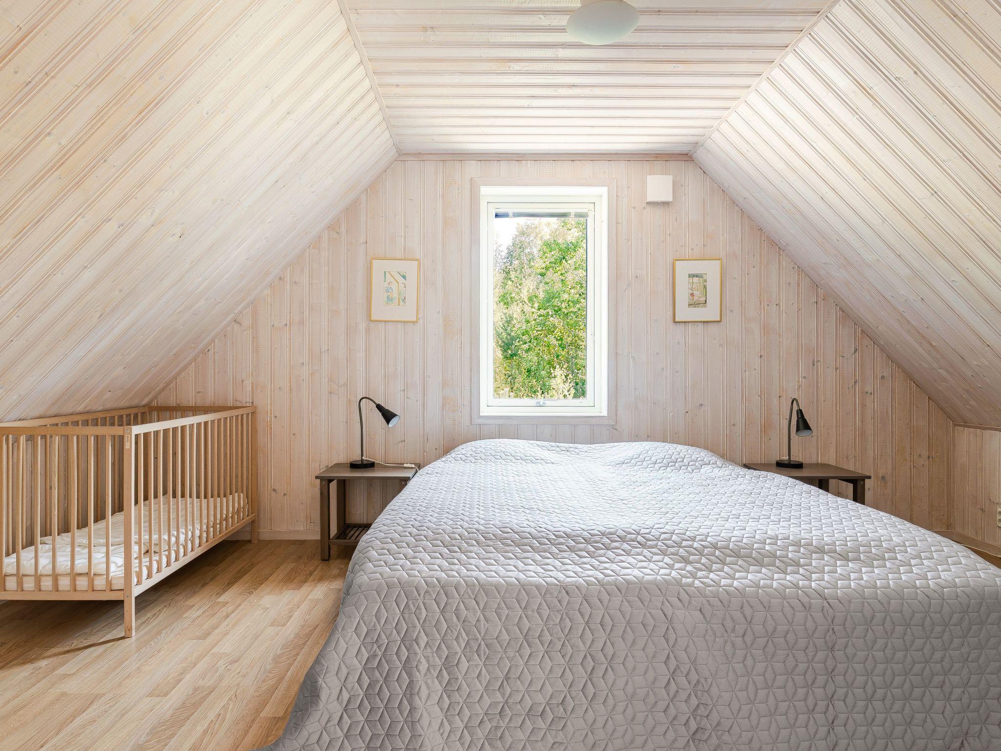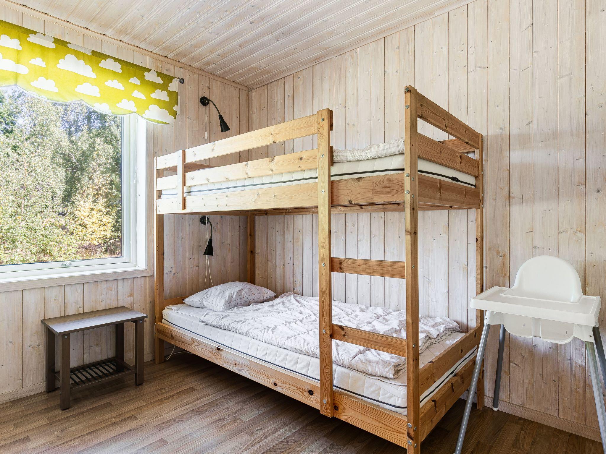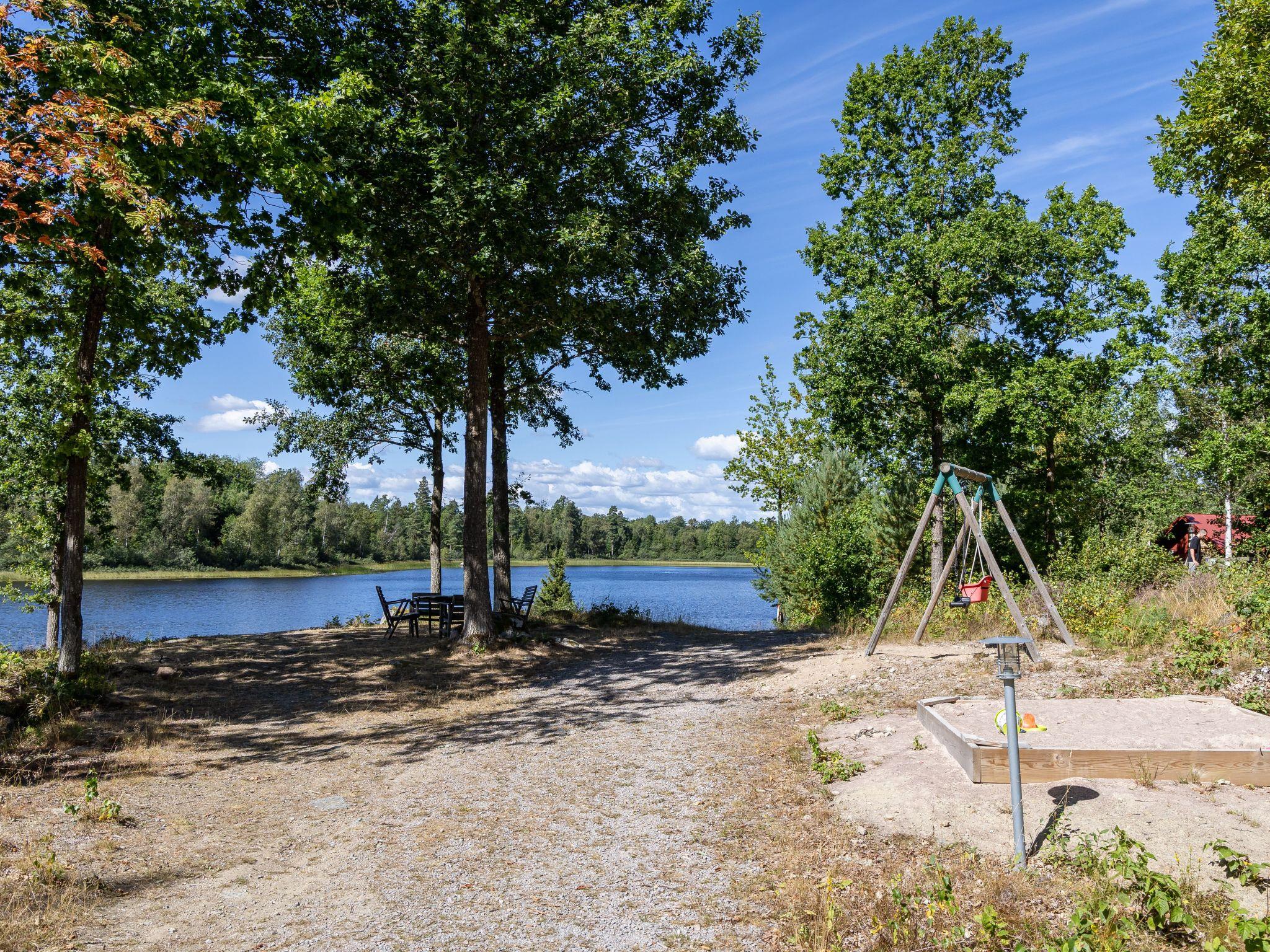 "Skogstorp", 4-room house 75 m2 on 2 levels. Modern and cosy furnishings: open living/dining room with sliding door, panoramic window with Scandinavian wood stove, dining table and DVD. Exit to the veranda. 1 room with 1 double bed. 1 room with 1 x 2 bunk beds. Open kitchen (oven, 4 ceramic glass hob hotplates, toaster, kettle, microwave, freezer, electric coffee machine). Exit to the veranda. Shower/WC. Floor heating. Upper floor: (steep stair) with sloping ceilings, 1 room with 1 double bed. Small living room with sloping ceilings with satellite TV. Parquet floors. Terrace partly roofed. Terrace furniture, barbecue. View of the lake. Facilities: washing machine, children's high chair, baby cot for up to 2 year olds. Internet (WiFi, free). Please note: non-smokers only. Smoke alarm, fire extinguisher.