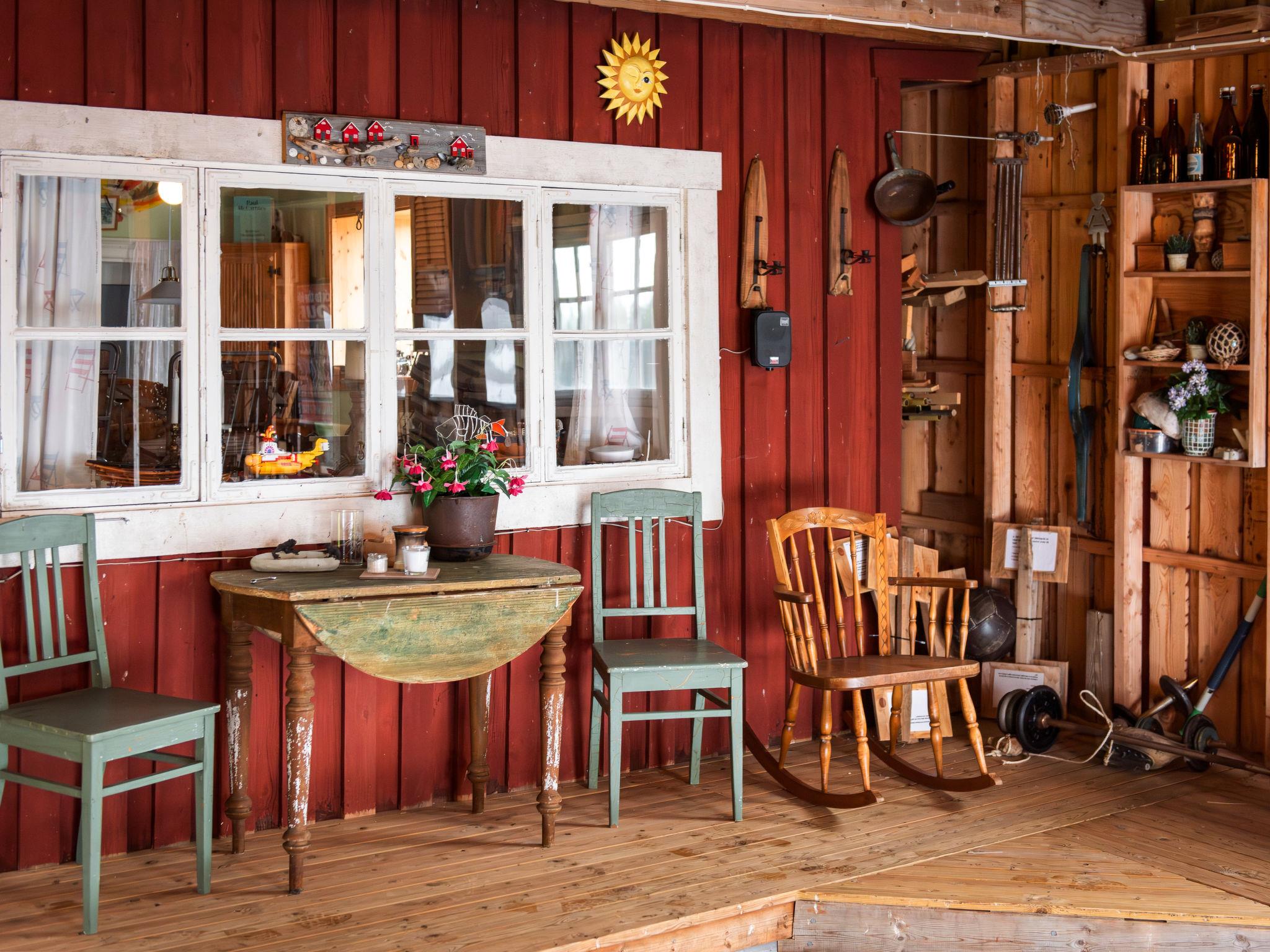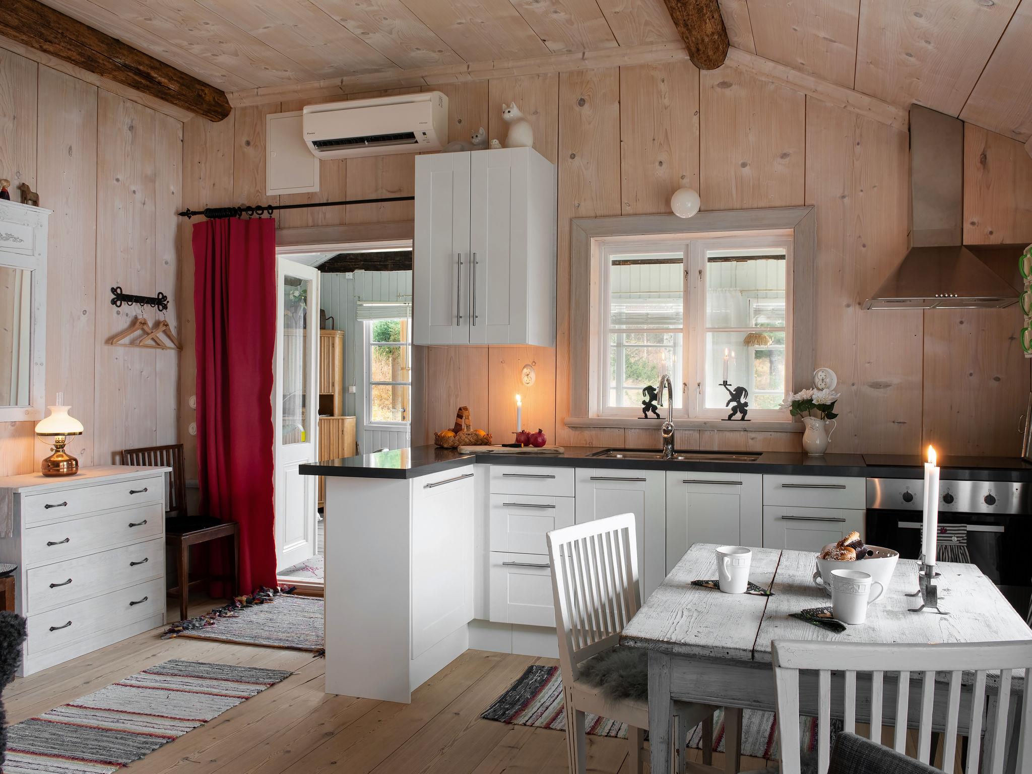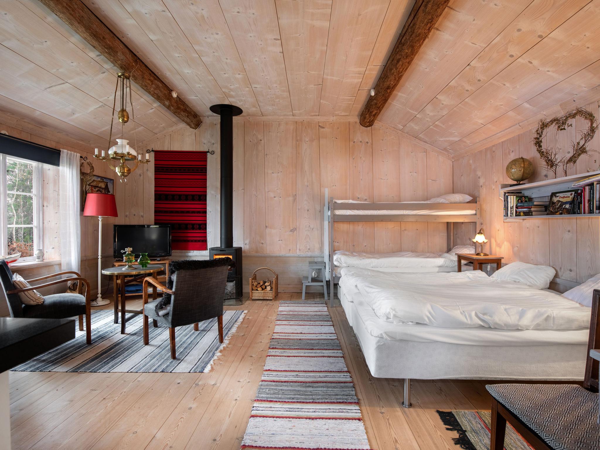"Viksjö Utsikten", 1-room cottage 60 m2. Comfortable and rustic furnishings: open living/dining room with 1 x 2 bunk beds (80 cm, length 200 cm), 1 double bed (2 x 90 cm, length 200 cm), Scandinavian wood stove, dining table and TV (flat screen). Open kitchen (oven, 4 ceramic glass hob hotplates, toaster, kettle, microwave, freezer, electric coffee machine). Sep. WC, Sauna. Electric heating, wood heating. Wooden floors. Terrace 40 m2 partly roofed. Terrace furniture, barbecue. Beautiful panoramic view of the lake. Please note: fridge without freezer, non-smoking house. Smoke alarm, fire extinguisher. Outdoor shower by the lake. Instead of an enclosed bedroom, some sleeping areas are located in an open-plan area (gallery, alcove, etc.).