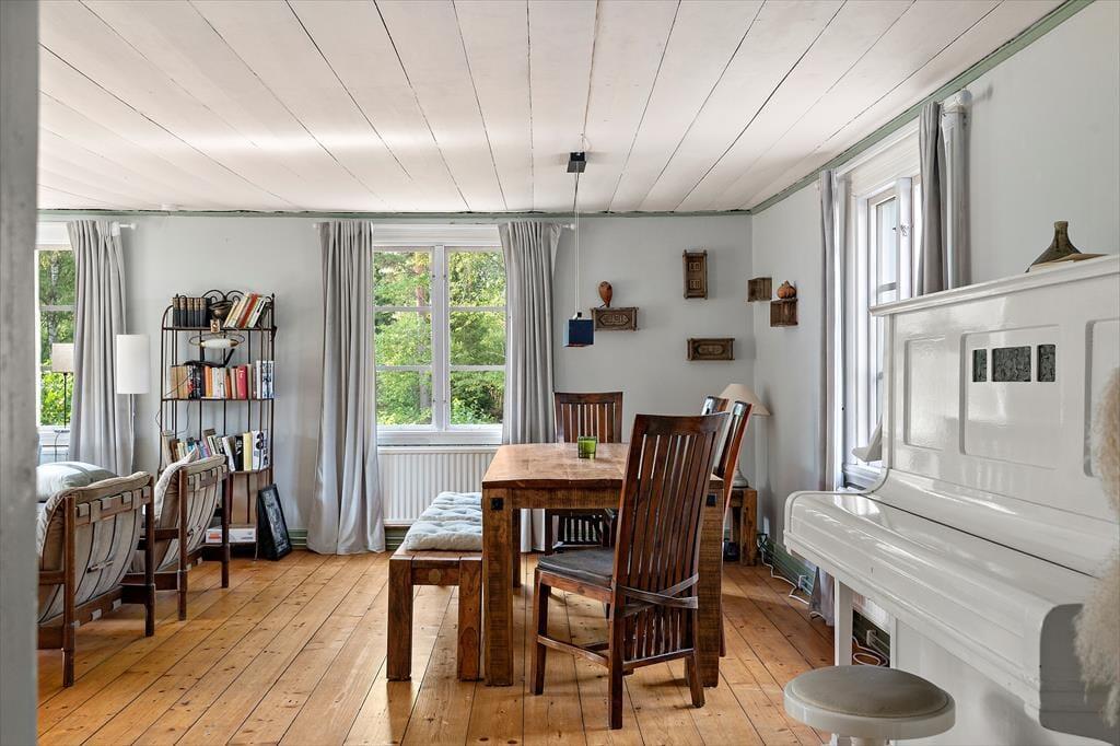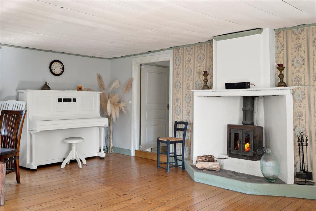 Den nuværende hovedindgang til ferieboligen befinder sig på bagsiden af bygningen. Her er der bygget en entré, som rummer et gæstetoilet, en vaskemaskine, et bruserum, varmeanlægget og en garderobe. Fra entréen kommer man ind i den typisk svenske bolig, hvor alle rum i stueetagen er forbundet med hinanden. Først træder man ind i det moderne køkken, hvor et gammelt, funktionelt brændekomfur stadig skaber en hyggelig atmosfære. Naturligvis findes der også et moderne komfur med keramiske kogeplader, en opvaskemaskine, et stort køleskab med fryser, en mikroovn og et spisebord. Fra køkkenet kommer man ind i et lille, hyggeligt gennemgangsværelse med to enkeltsenge. Fra værelset er der adgang til husets oprindelige hovedindgang, hvorfra man kan gå udenfor, tage trappen op til første sal eller gå ind i den store stue. I stuen findes en hyggelig sofagruppe, et stort spisebord, en brændeovn, et fjernsyn med svenske kanaler og ikke mindst et klaver. Fra stuen kommer man tilbage til køkkenet og afslutter dermed rundturen i stueetagen. På første sal findes fire soveværelser og et badeværelse med toilet, håndvask og to brusere – en til voksne og en til børn. I den ene fløj af første sal, som er adskilt af en ekstra gang, ligger to soveværelser med dobbeltsenge, som kan adskilles til enkeltsenge. I den anden fløj, ved siden af badeværelset, er der et soveværelse med en dobbeltseng (vandseng, medium-calm) og et mindre værelse med en enkeltseng. To yderligere sovepladser findes i det lille gæstehus. Der er desuden gratis internetadgang i huset.