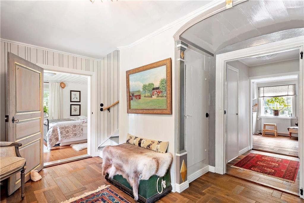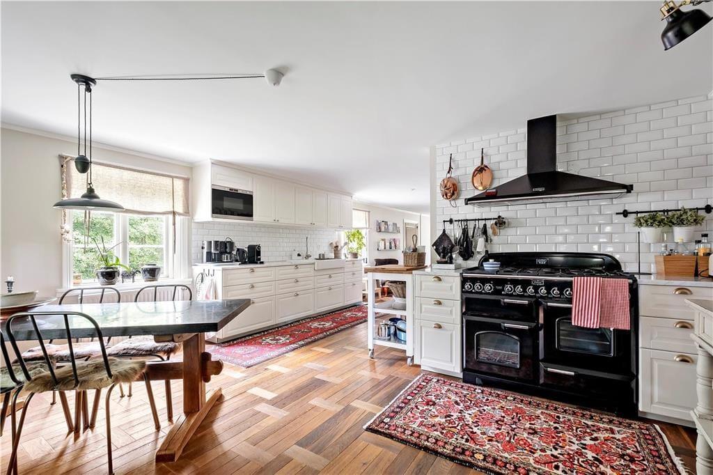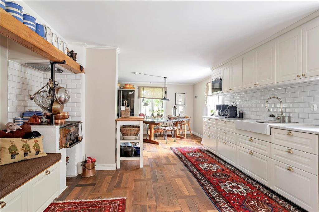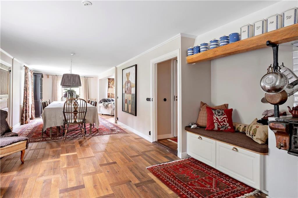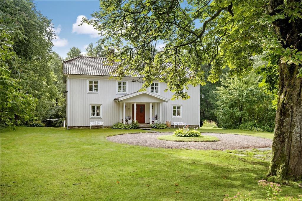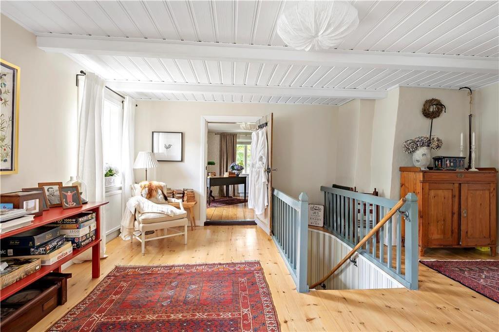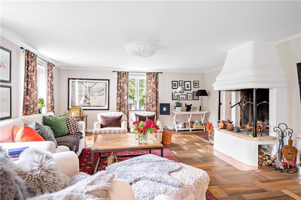 Den 350 kvadratmeter store herregård er velholdt, flot renoveret og har plads til den store familie. Fra indgangen er der adgang til den hyggelige dagligstue, som ligger i åben forbindelse til spisestuen og køkkenet. Dagligstuen er udstyret med behagelige møbler, kamin, fjernsyn og musikanlæg. I spisestuen er der et stort spisebord med plads til hele familien.