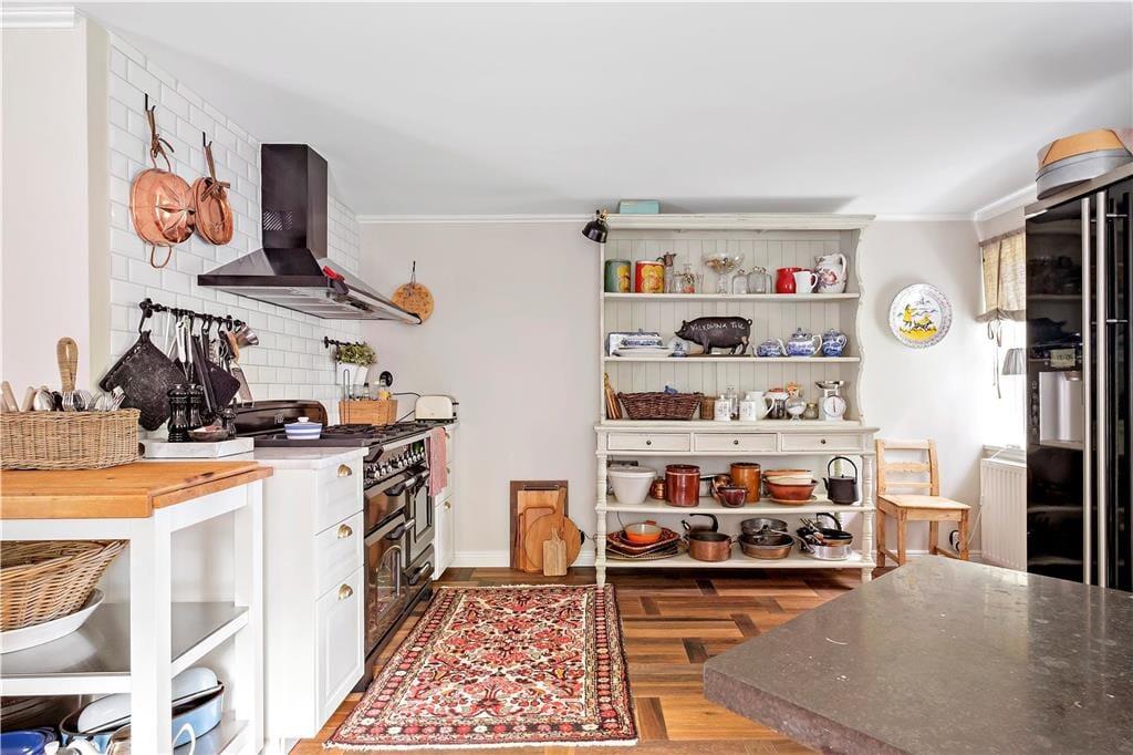 Køkkenet er moderne og godt udstyret med blandt andet gaskomfur, et stort køleskab og andre moderne faciliteter, som gør madlavningen bekvem.