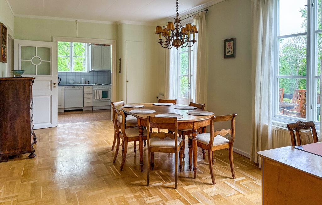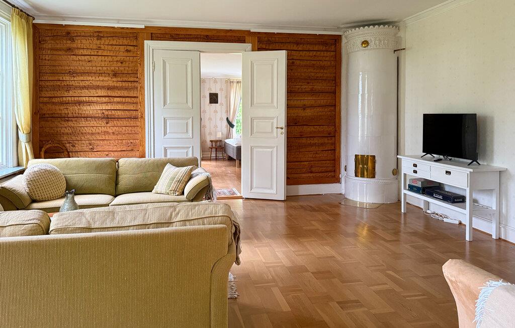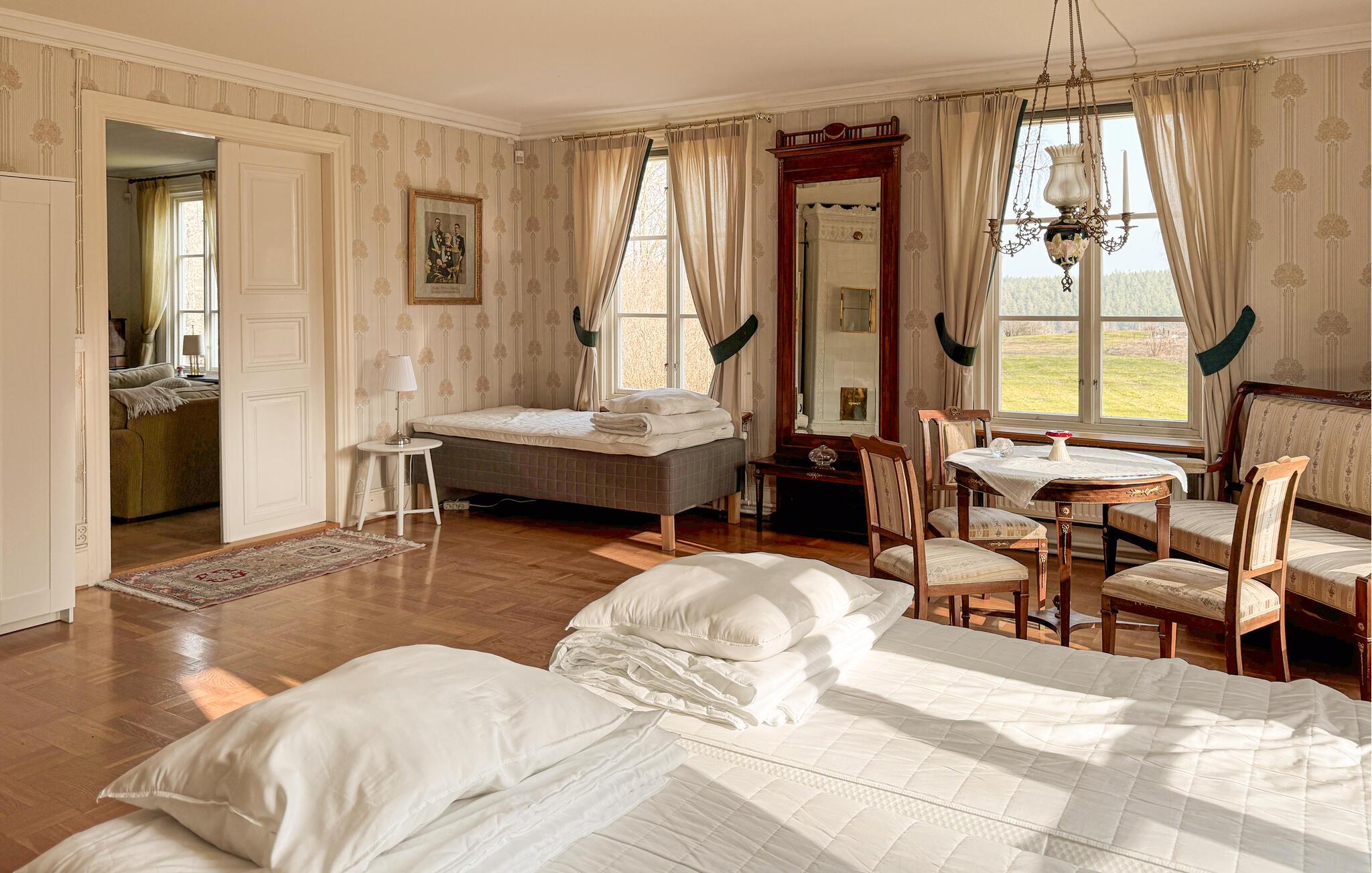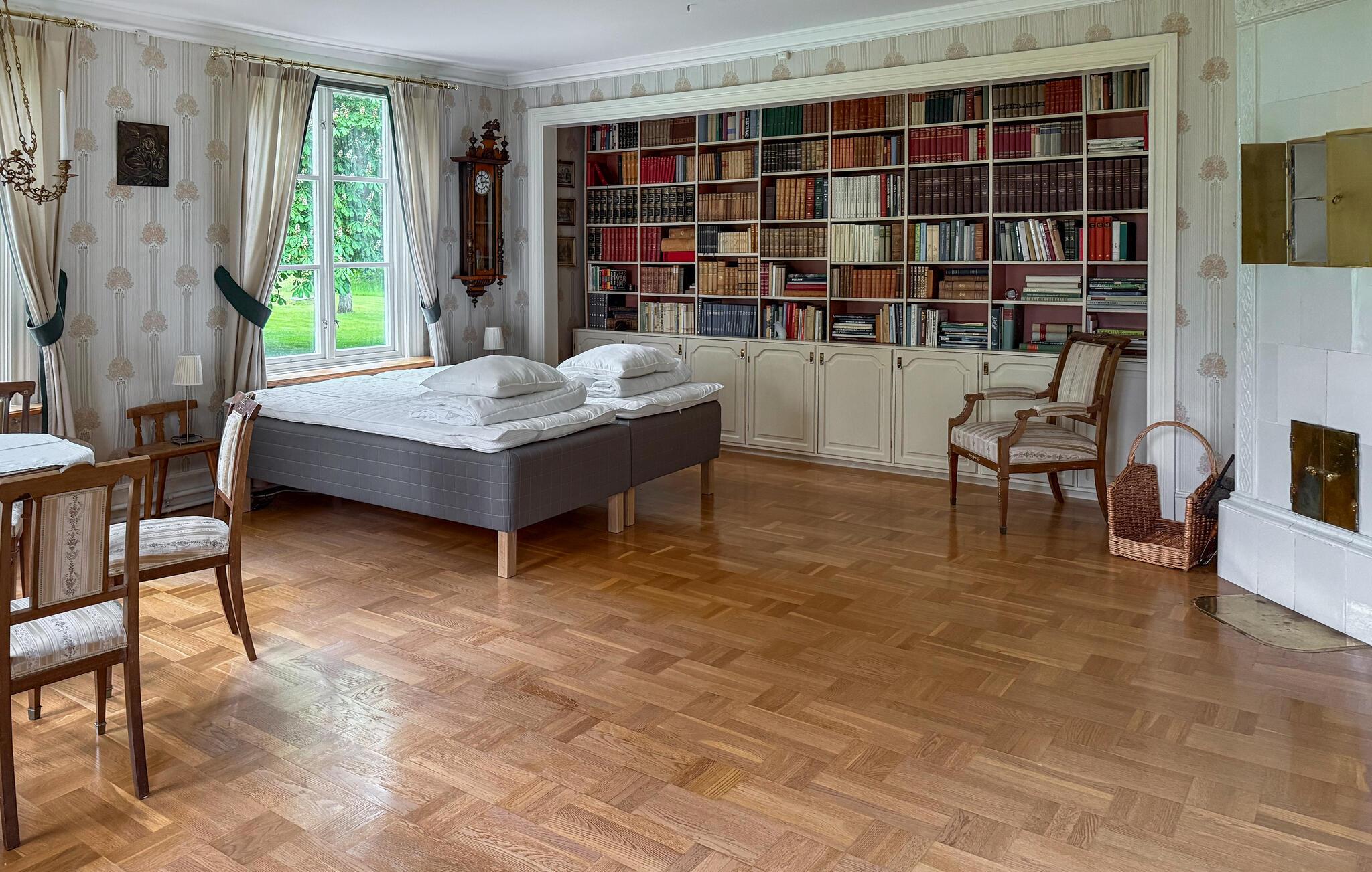 Denne lyse og komfortable lejlighed i stueetagen er en del af et smukt beliggende herregård med århundreders historie, hjemsted for prominente familier som Ribbing og Fleetwood. Historiske detaljer som smukke kakkelovne og originalt træværk skaber en behagelig atmosfære. Nyd denne atmosfære med harmoniske måltider, kig på biblioteket efter en interessant bog, brug musikrummet til at spille musik sammen, og sæt jer til hyggelige samtaler i den indbydende stue.