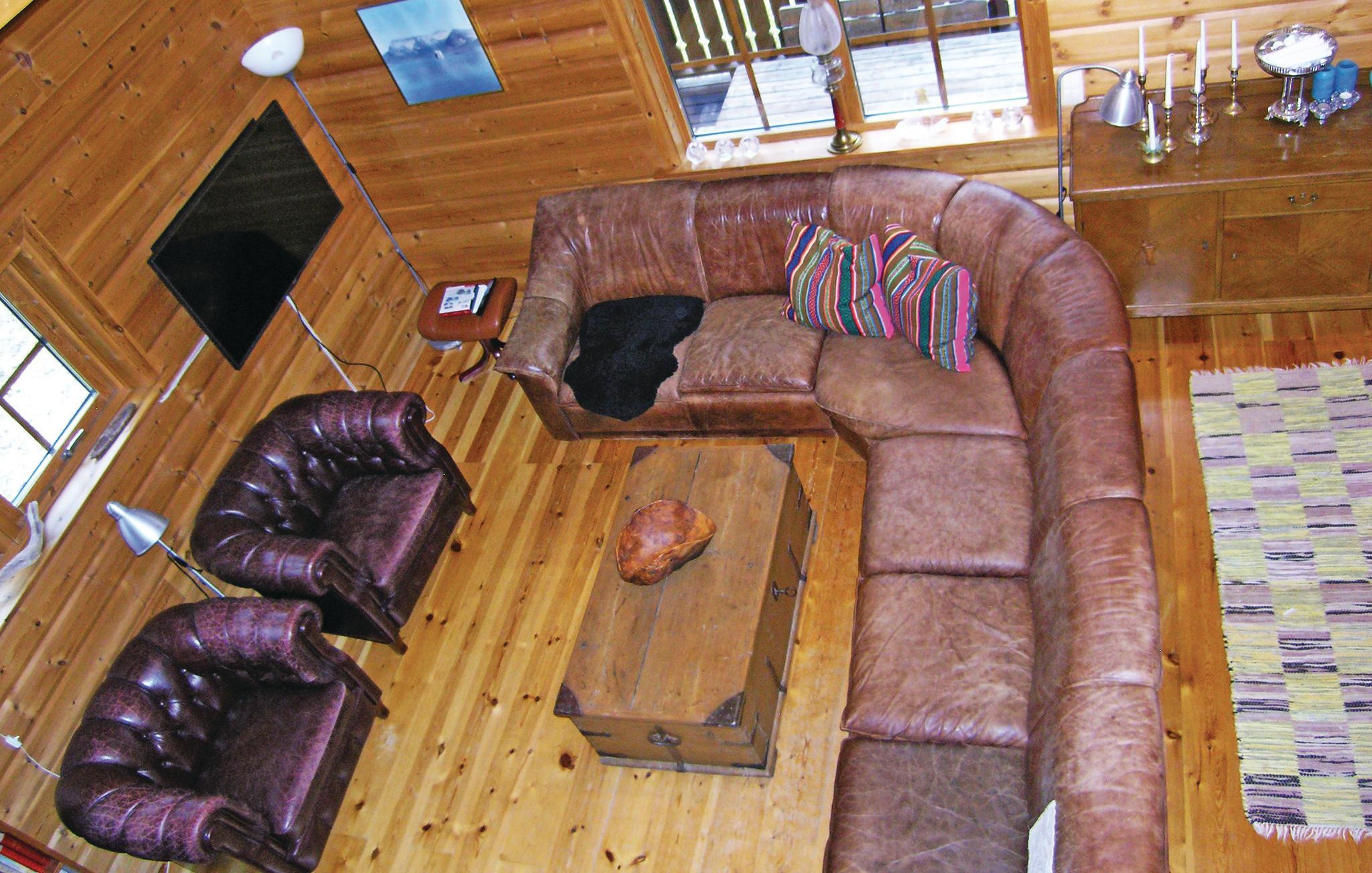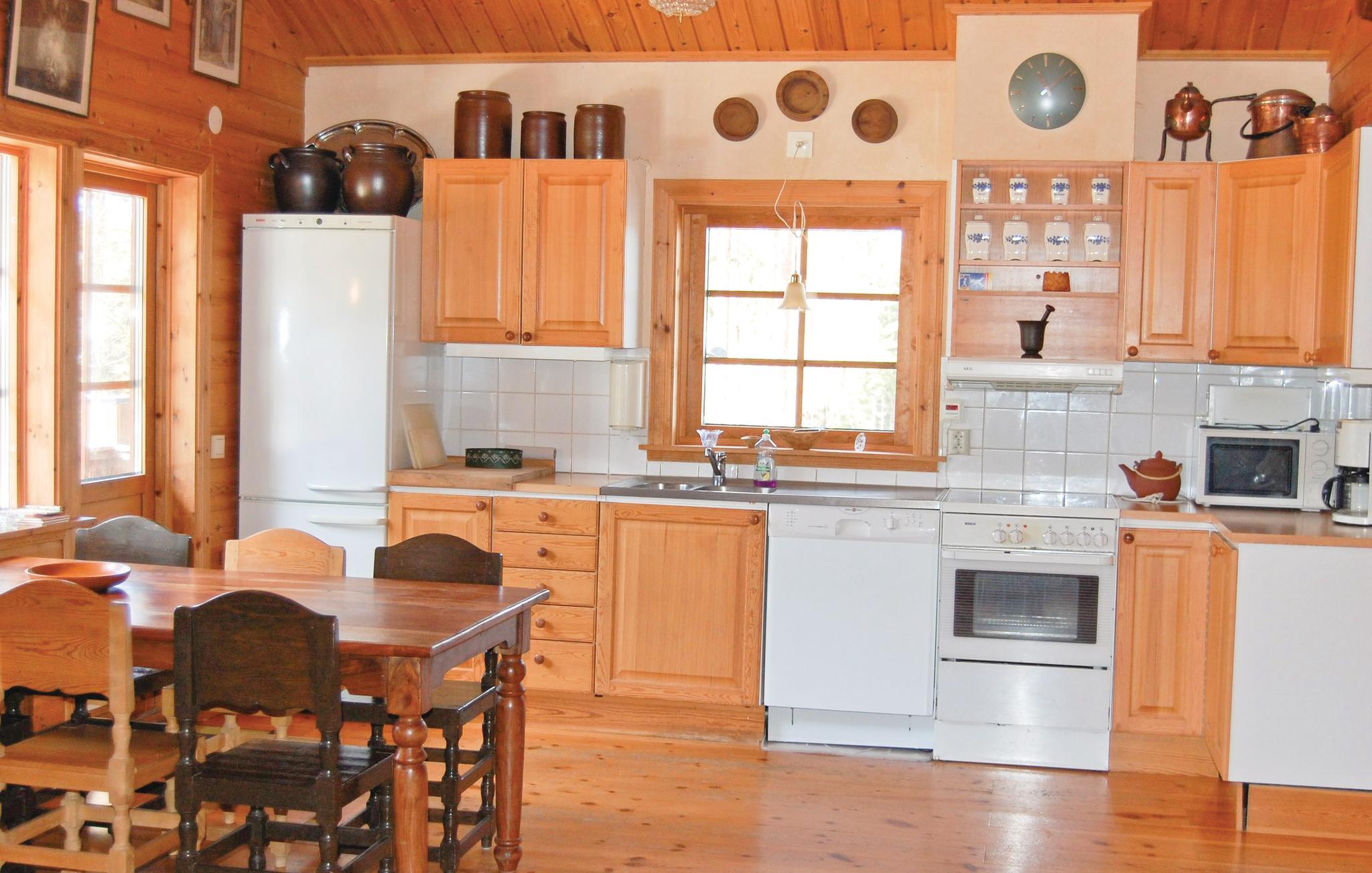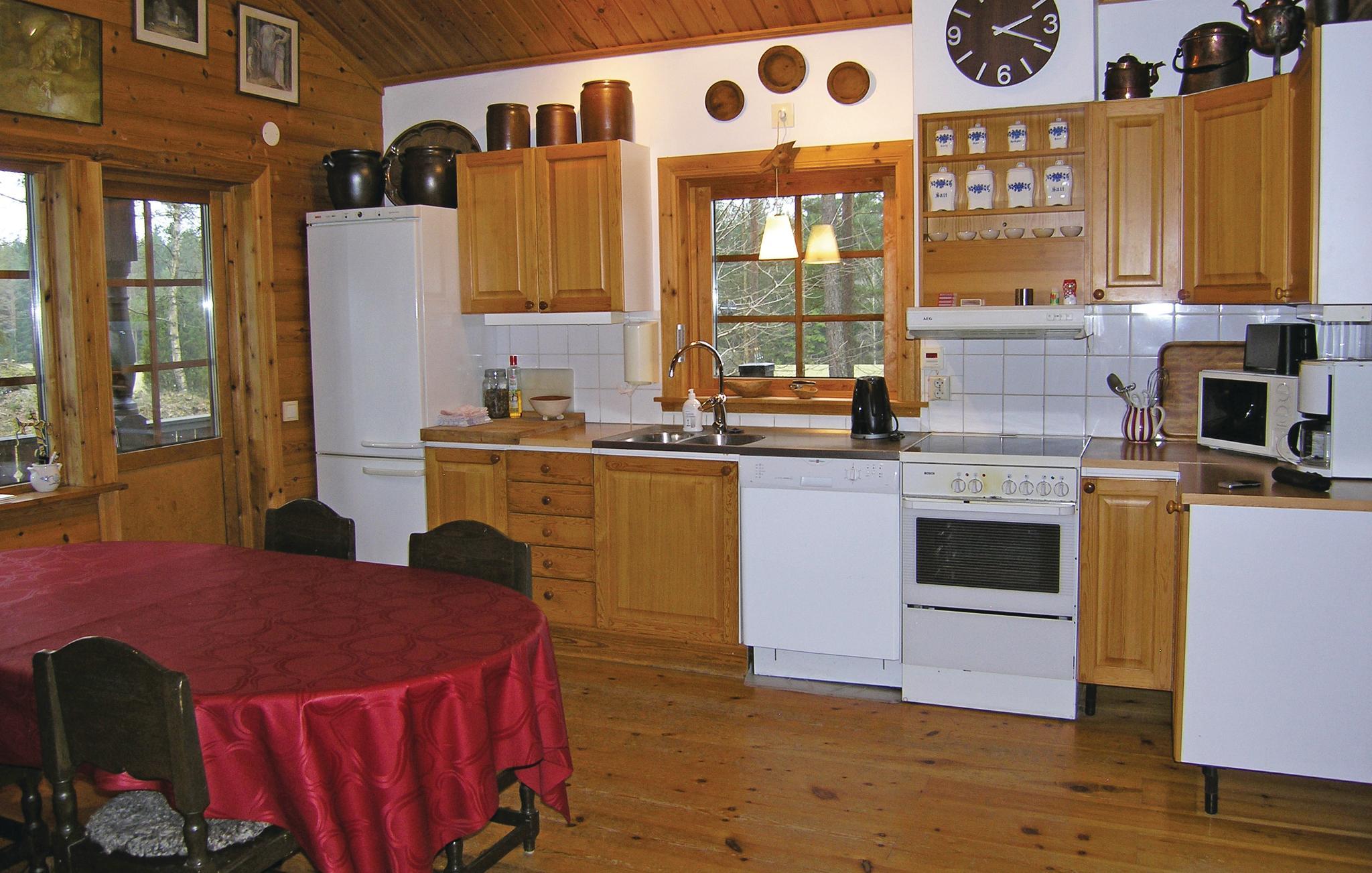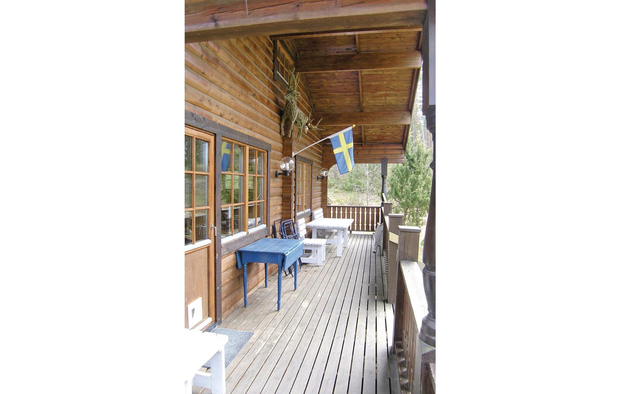 Rummeligt og hyggeligt feriehus, hvor meget af indretningen er lavet af træ. Huset ligger i nærheden af Vaggeryd er højtbeliggende og med smuk natur lige udenfor døren. Trægulv i alrummet og helt op i tagspidsen. Hyggelig brændeovn i stuen. Tennisbane 500 m. Gode bademuligheder i søen Fängen (600 m). Båden ligger på den vestlige side af Fängen ca. 2 km væk. Fin golfbane i Hook. Shopping kan foregå i Jönköping. S05696 300 m.