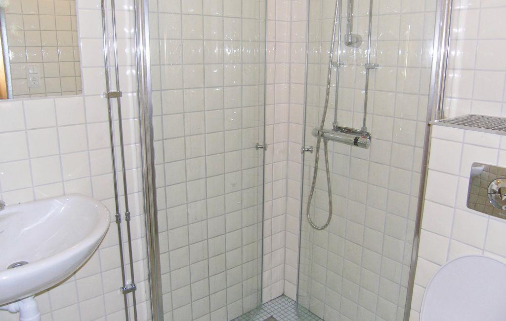 Badeværelse med toilet, brusebad og varme i gulvet. Her er også vaskemaskine.