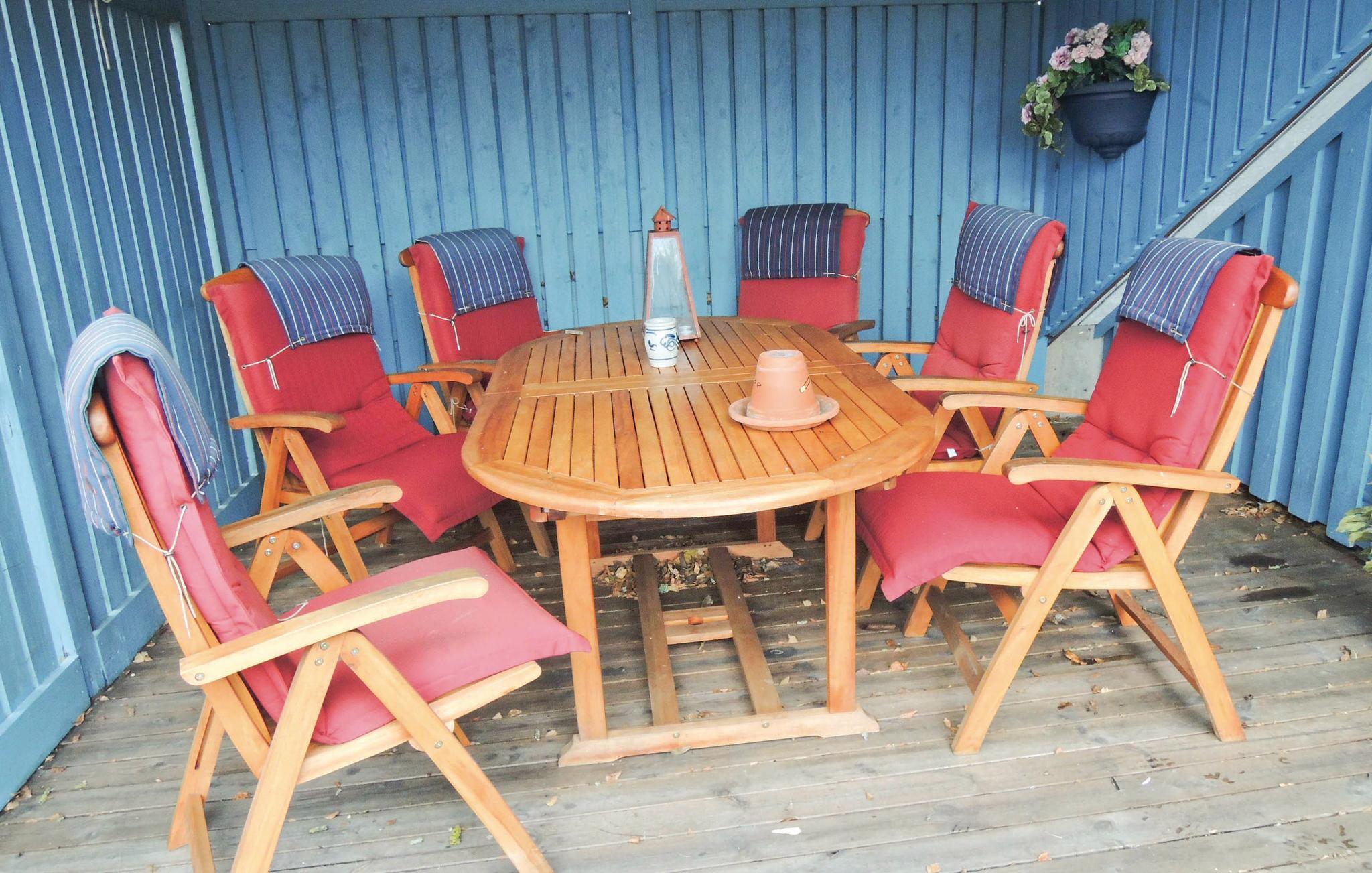 Huset har en dejlig terrasse i læ, hvor det er skønt at synke hen med en god bog eller bare nyde morgenkaffen og planlægge, hvad dagen skal byde på.