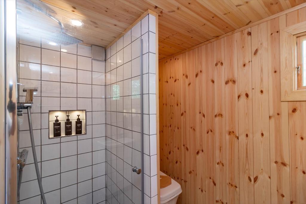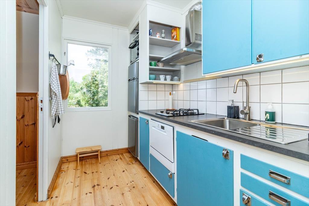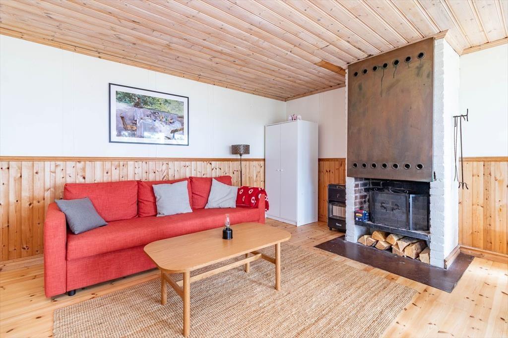 Huset har et boligareal på ca. 60 m² og plads til op til 4 personer. Via terrassen med udsigt over søen kommer du direkte ind i opholdsrummet, som er indrettet med sofa, brændeovn, gasvarmer, Smart-TV og en lille spiseplads. Sofaen kan om ønsket bruges som sovesofa.