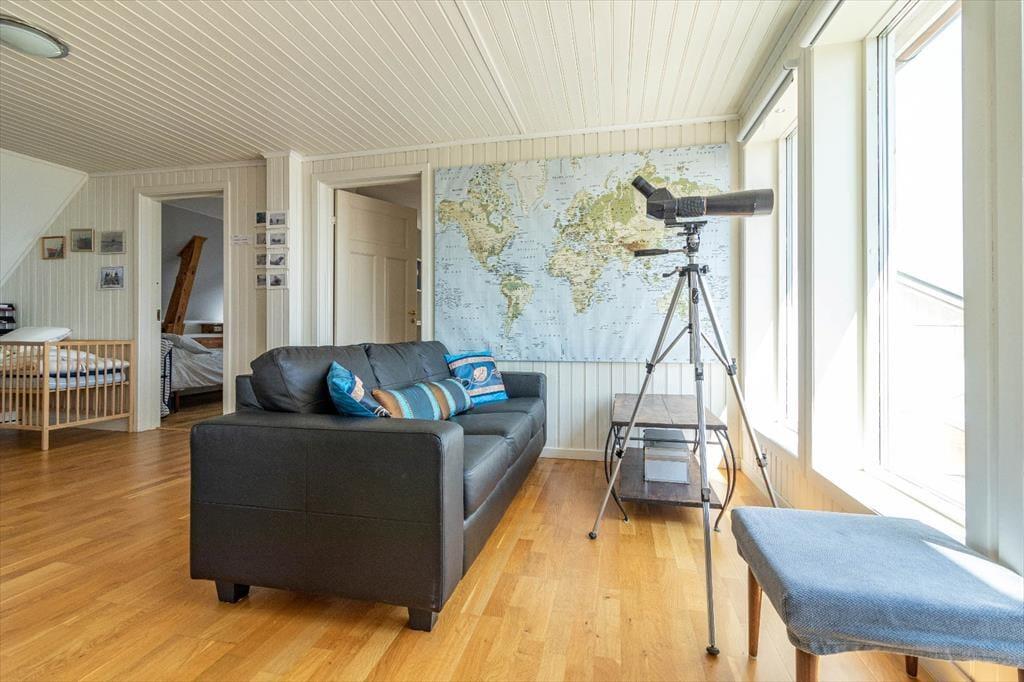 Hovedhuset tilbyder 150 m² bolig på to etager og masser af plads til afslappende dage. I stueetagen findes en hyggelig stue, et fuldt udstyret køkken med spiseplads, et badeværelse samt en glasinddækket vinterhave med fantastisk havudsigt. På førstesalen er der tre soveværelser (ét med dobbeltseng, to med hver to enkeltsenge), et gæstetoilet, en lille siddeplads i forgangen og en balkon med udsigt over havet. En barneseng står også til rådighed.