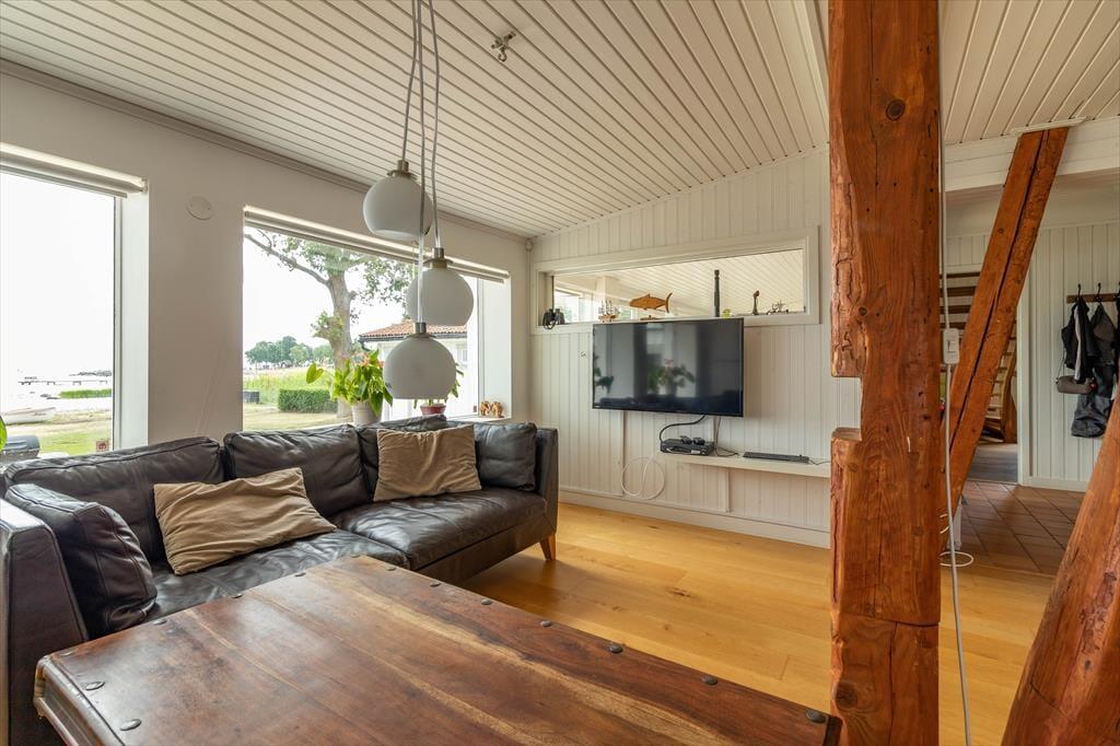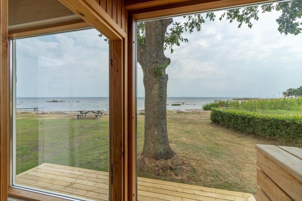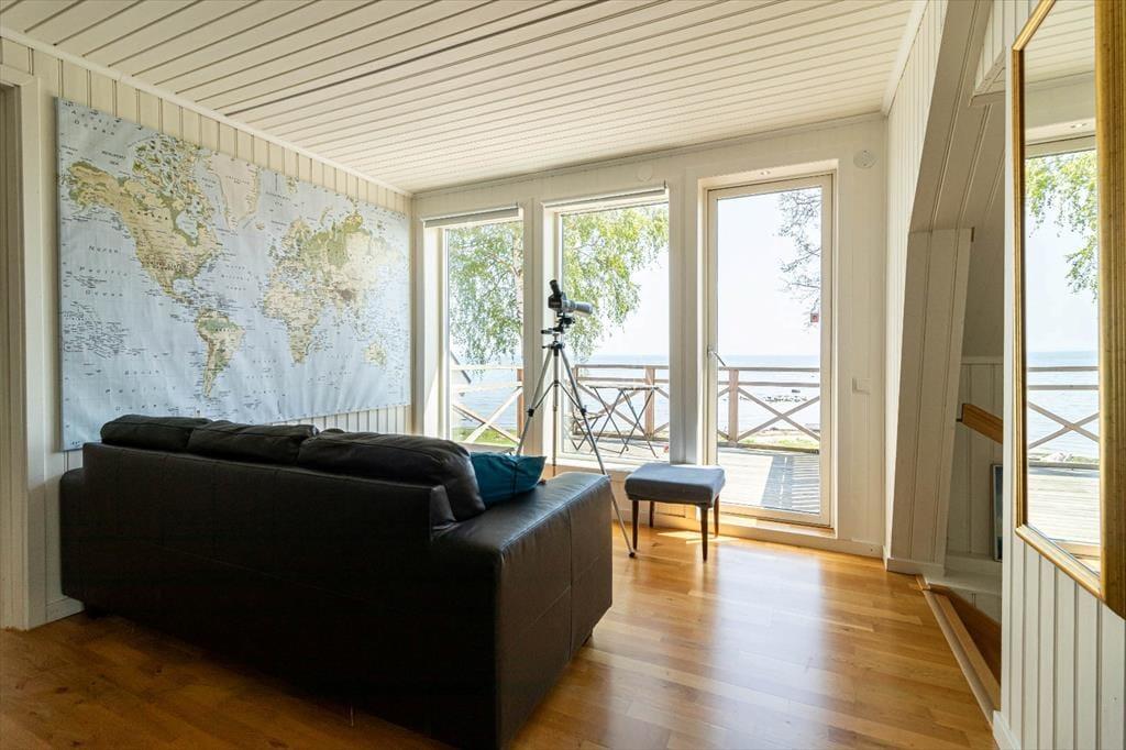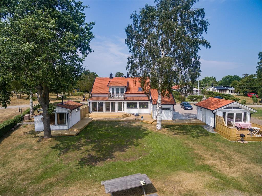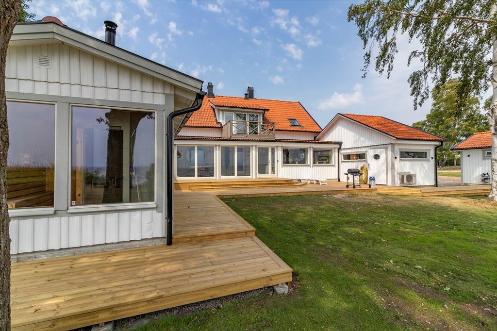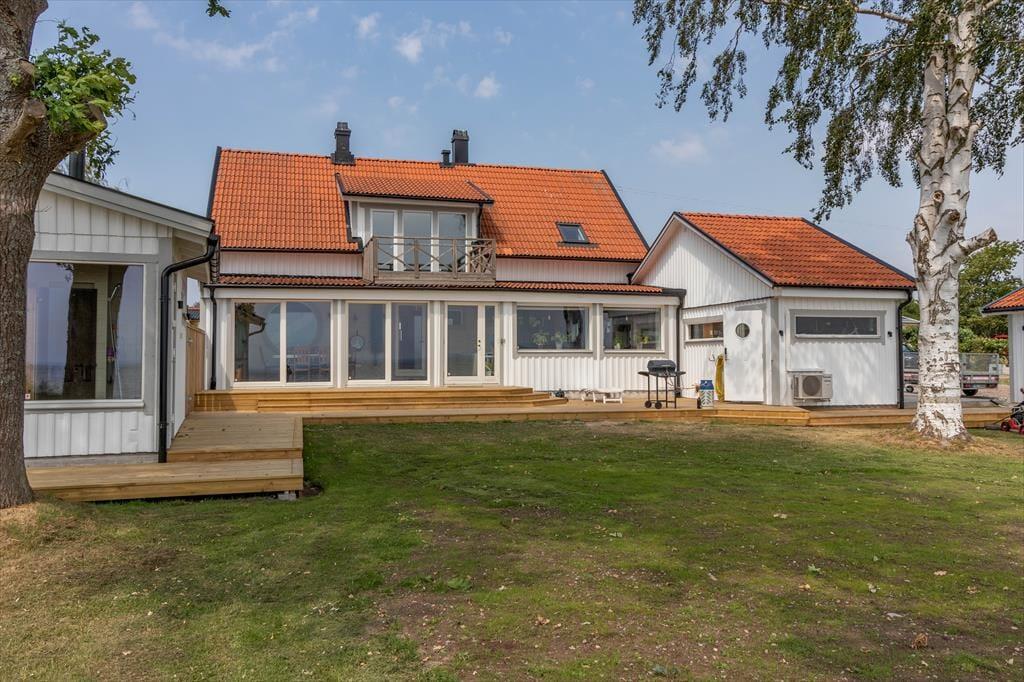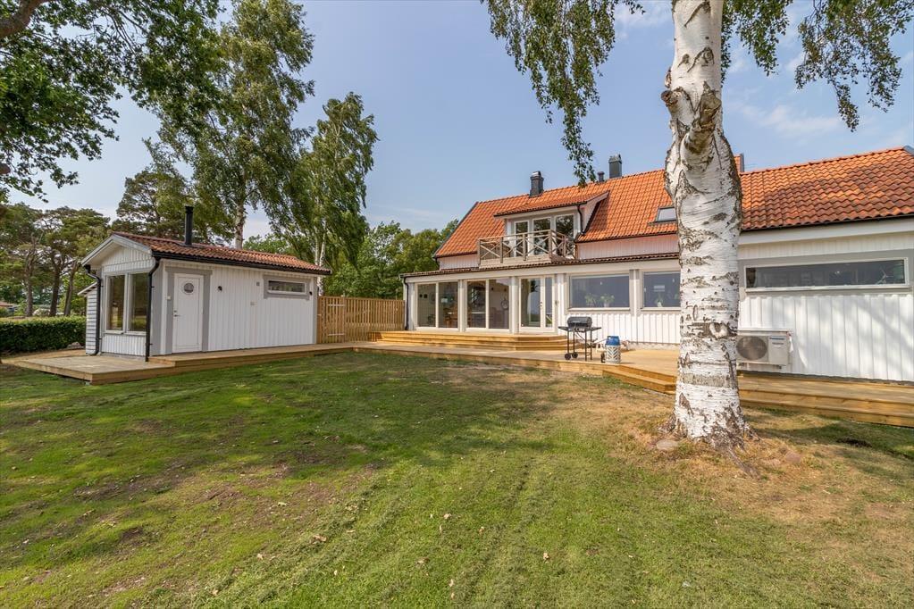 Udenfor er der en terrasse med havemøbler og grill – perfekt til hyggelige aftener ved havet. Der er parkeringsplads på grunden. Huset har desuden en træopvarmet, glasinddækket sauna vendt mod havet samt en robåd. For elbiler er der en 11 kW-wallbox, som kan benyttes mod et gebyr på 500 SEK per uge. Medbring venligst dit eget ladekabel.