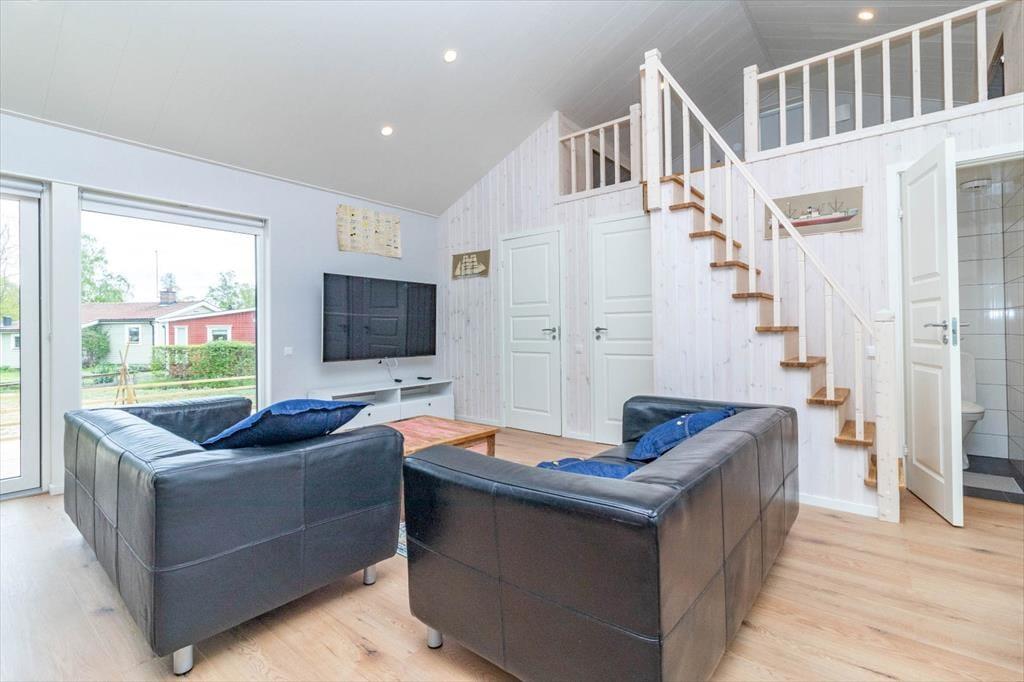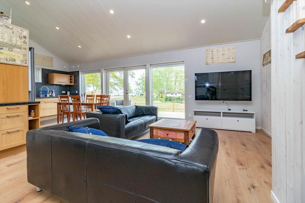 Feriehuset tilbyder ca. 75 m² bolig til op til 6 personer. Husets centrum er den åbne L-formede stue, køkken og spiseområde med store vinduer mod havsiden, som skaber en lys og venlig atmosfære. I stuen står to lædersofaer klar til afslapning, og et Smart-TV med tyske kanaler giver underholdning. Køkkenet er udstyret med alle nødvendige apparater: 4-plade induktionskogeplade, ovn, emhætte, køle- og fryseskab, opvaskemaskine og kaffemaskine. Spiseområdet har et stort bord til fælles måltider.