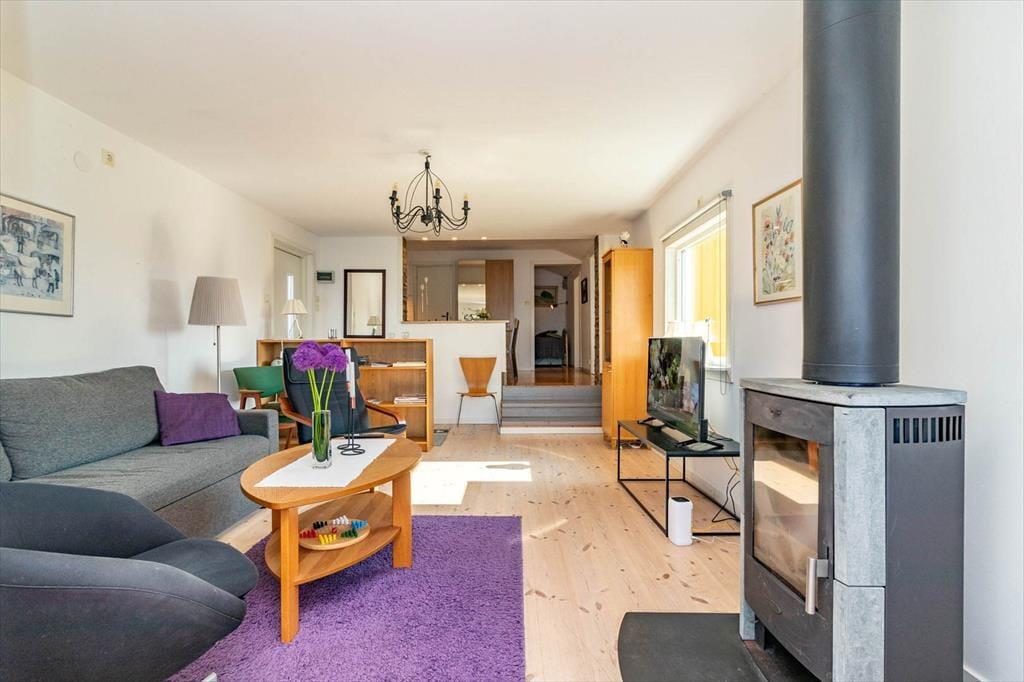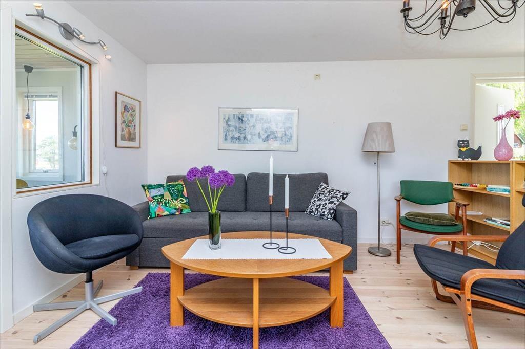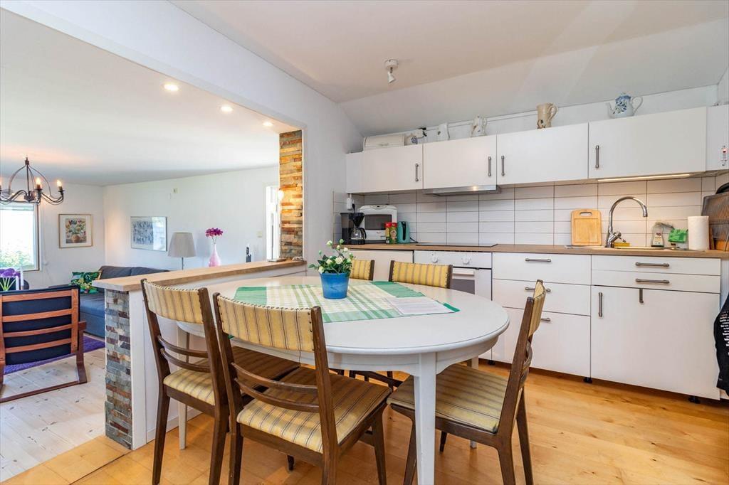 I det åbne opholds- og køkkenområde finder du en hyggelig sofa, tv med svenske og tyske kanaler samt en pejs til afslappede aftener. Køkkenet, der nås fra stuen via tre små trin, er funktionelt udstyret med 3-pladers induktionskogeplade med ovn, køleskab med fryser, mikrobølgeovn og kaffemaskine. Et spisebord fuldender køkkenområdet. Den nybyggede vinterhave fra 2023 har et spisebord med udsigt over havet og fører direkte ud på terrassen, hvor du kan nyde solnedgangen.