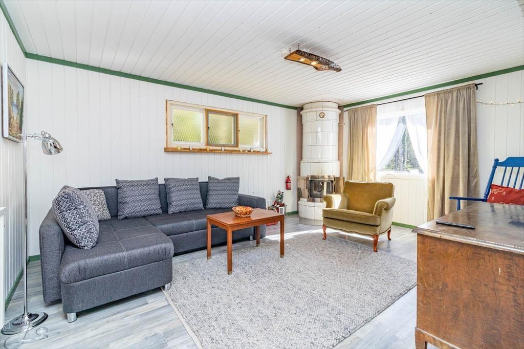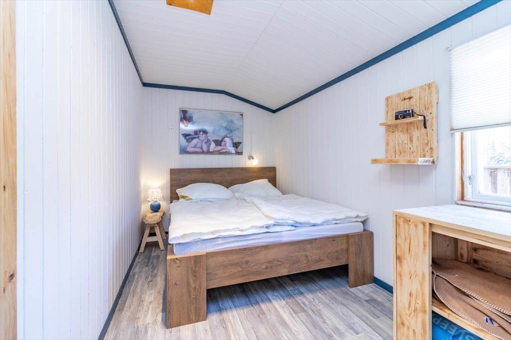 Med sine 50 m² tilbyder huset plads nok til 2 voksne og 2 børn. Over fem trappetrin kommer du til den store træterrasse, hvorfra du træder ind i entreen med garderobe. For enden af entreen ligger badeværelset med toilet og bruser. Til højre ligger køkkenet og stuen, som er åbent forbundet med hinanden. Ud over en 4-plades elkomfur, ovn, køleskab og fryser, mikroovn og kaffemaskine har køkkenet alt, hvad du behøver for at tilberede og servere almindelige retter til 4 personer. Du spiser dine måltider ved det største af de to spiseborde. Bag den store bardisk ligger stuen med en hyggelig sofa, en lænestol, en historisk pejs, der er blevet moderniseret, og et fladskærms-tv.