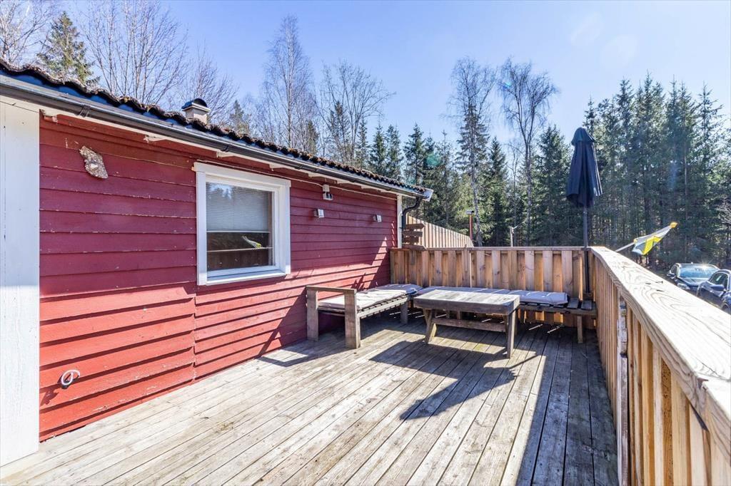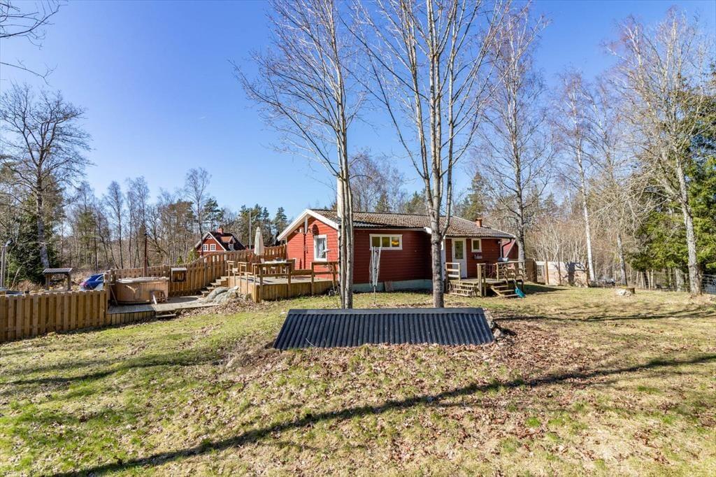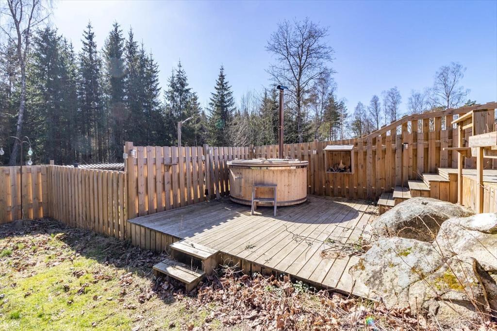 Velkommen til dette renoverede feriehus på en 3.000 m² stor, afsides beliggende grund i skoven nord for Holmsjö i Blekinge-regionen. Især ejere af op til 3 hunde (flere efter anmodning) vil være glade for, at 1.000 m² af grunden er fuldstændig indhegnet, hvilket gør huset særligt hundevenligt. I gåafstand ligger de to større søer Trehörningsjö og Ältensjö, hvor du kan tage lange gåture og cykelture, samt to små badesøer. Der er endnu et offentligt søbad ca. 5 km syd for Saleboda.