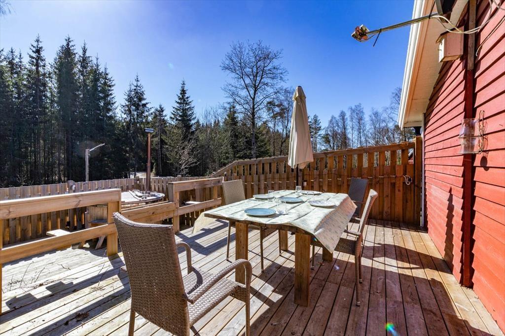 Fra køkkenet fører en dør ud til haven og til den mindre terrasse bag huset, hvor du i varmt vejr kan tænde grillen og nyde dine måltider eller en drink ved det store havebord. Der er endda en brændefyret badetønde med spabadfunktion, der indbyder til wellness-timer.