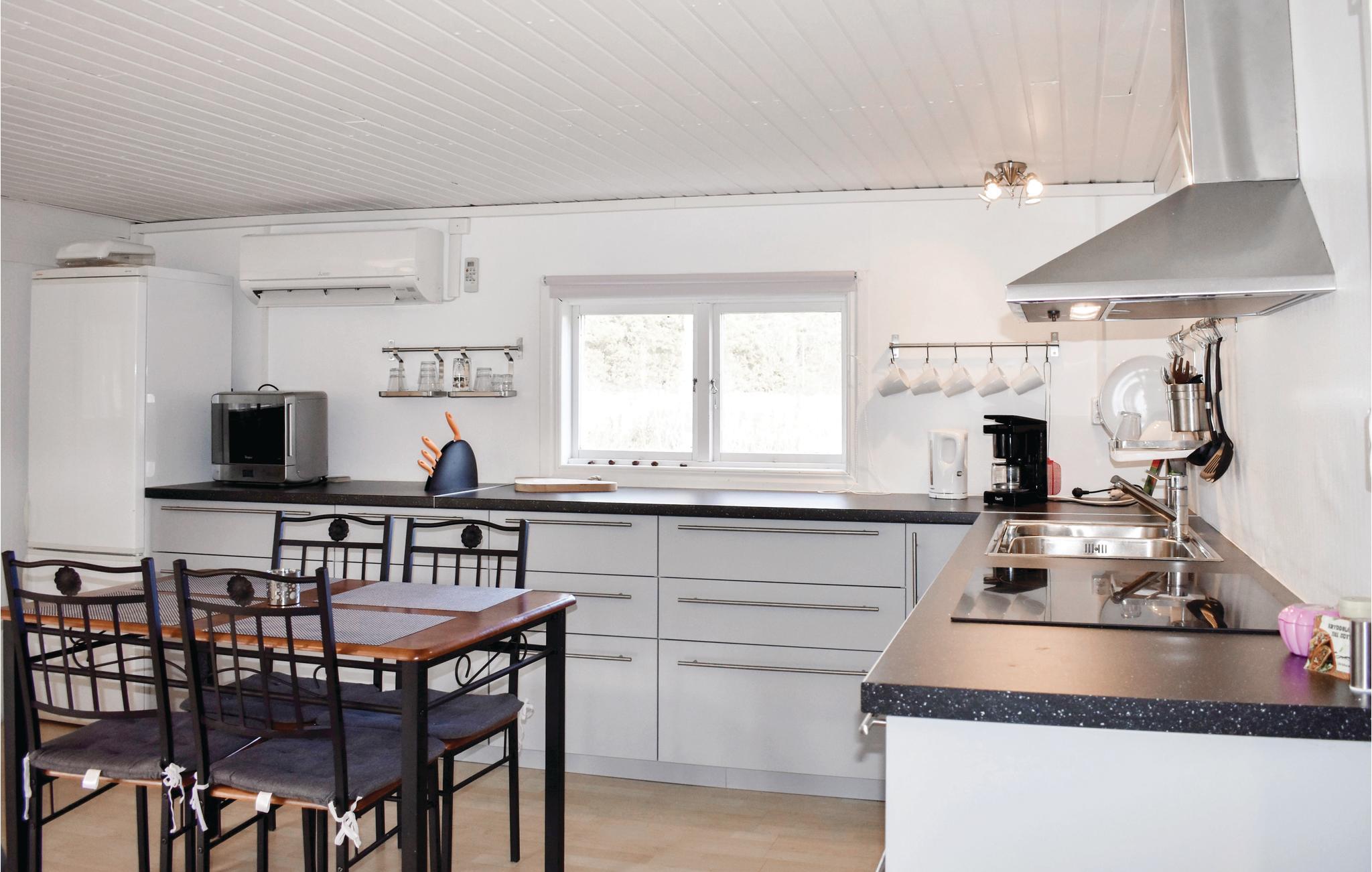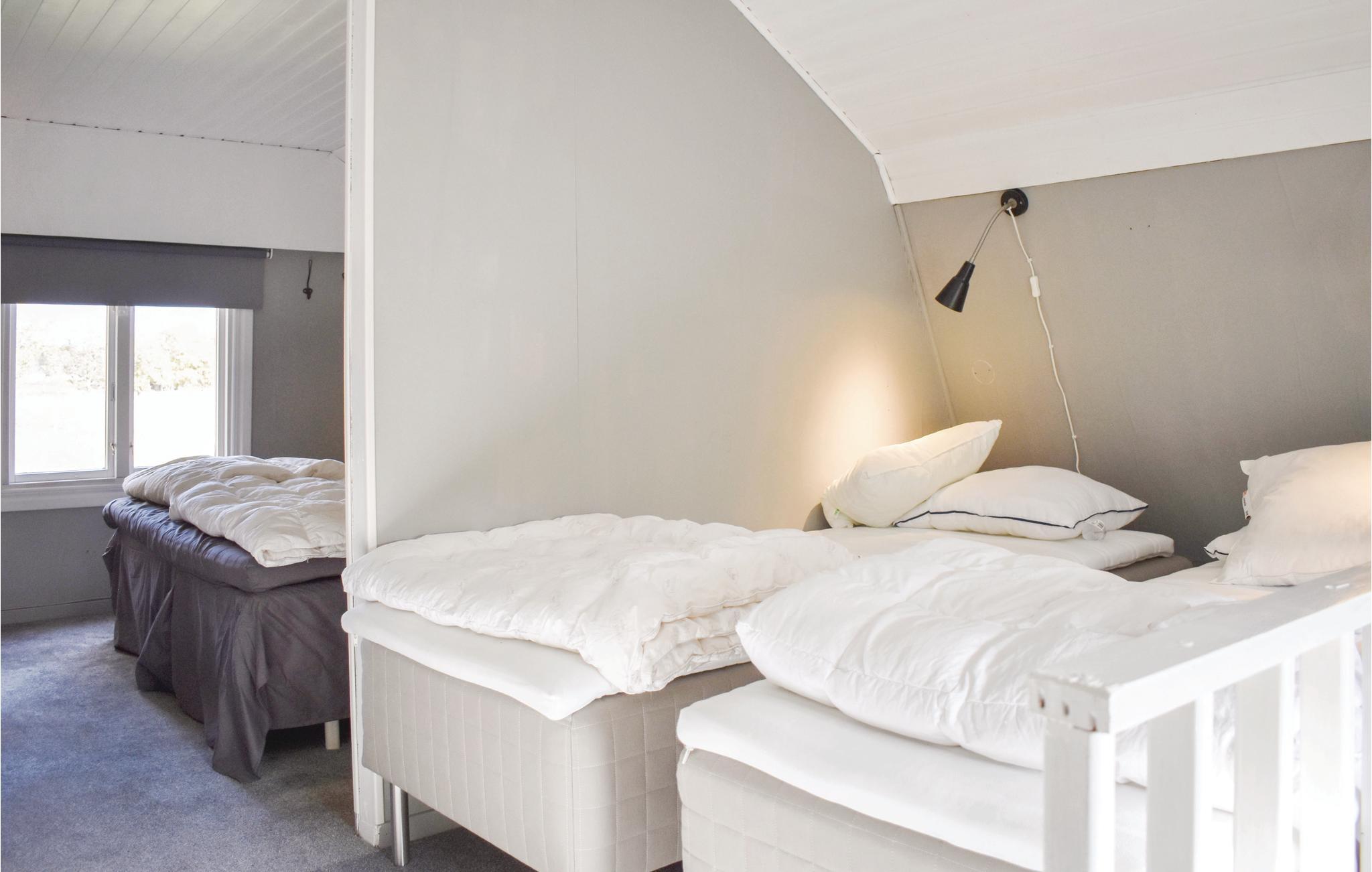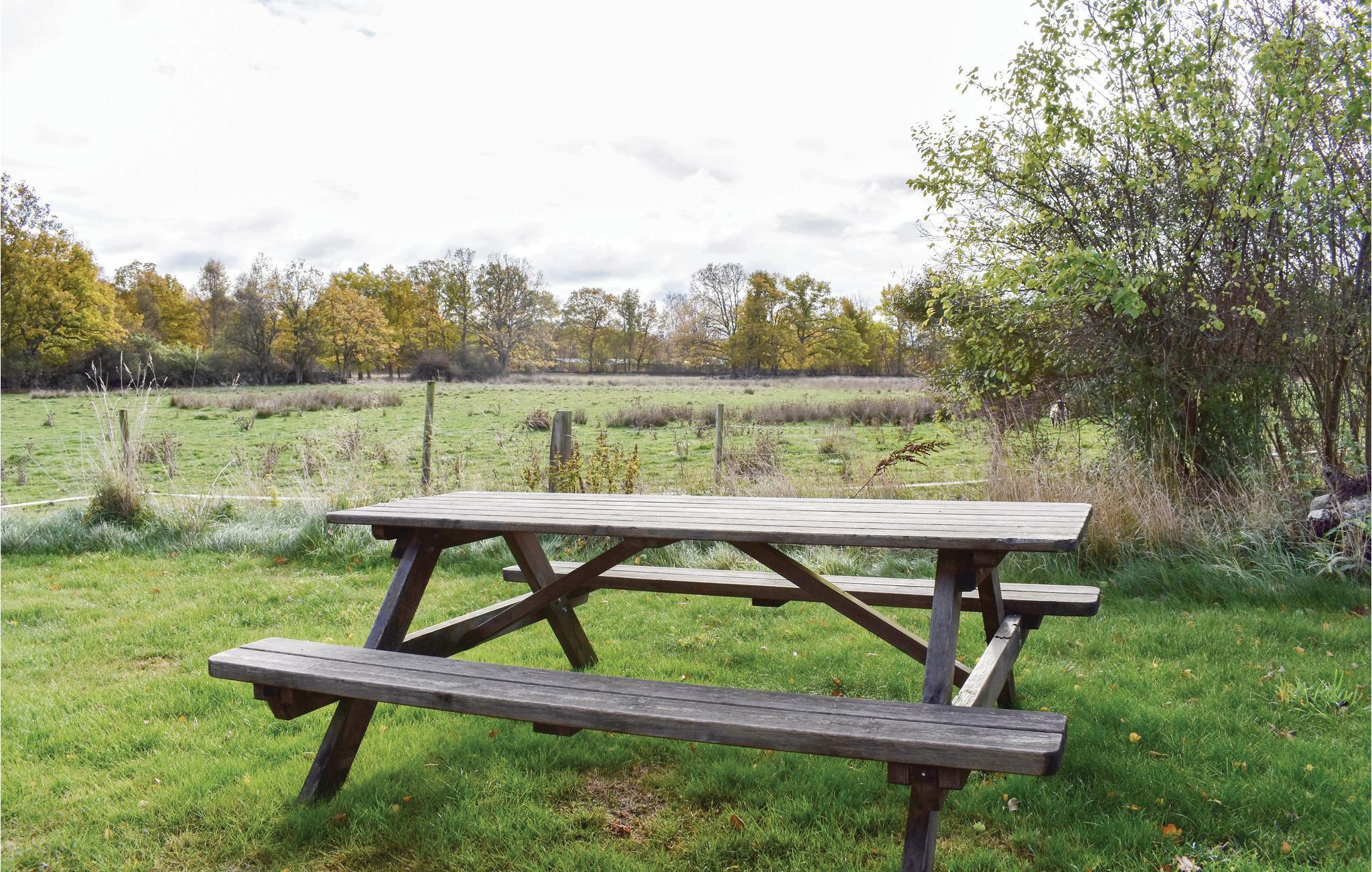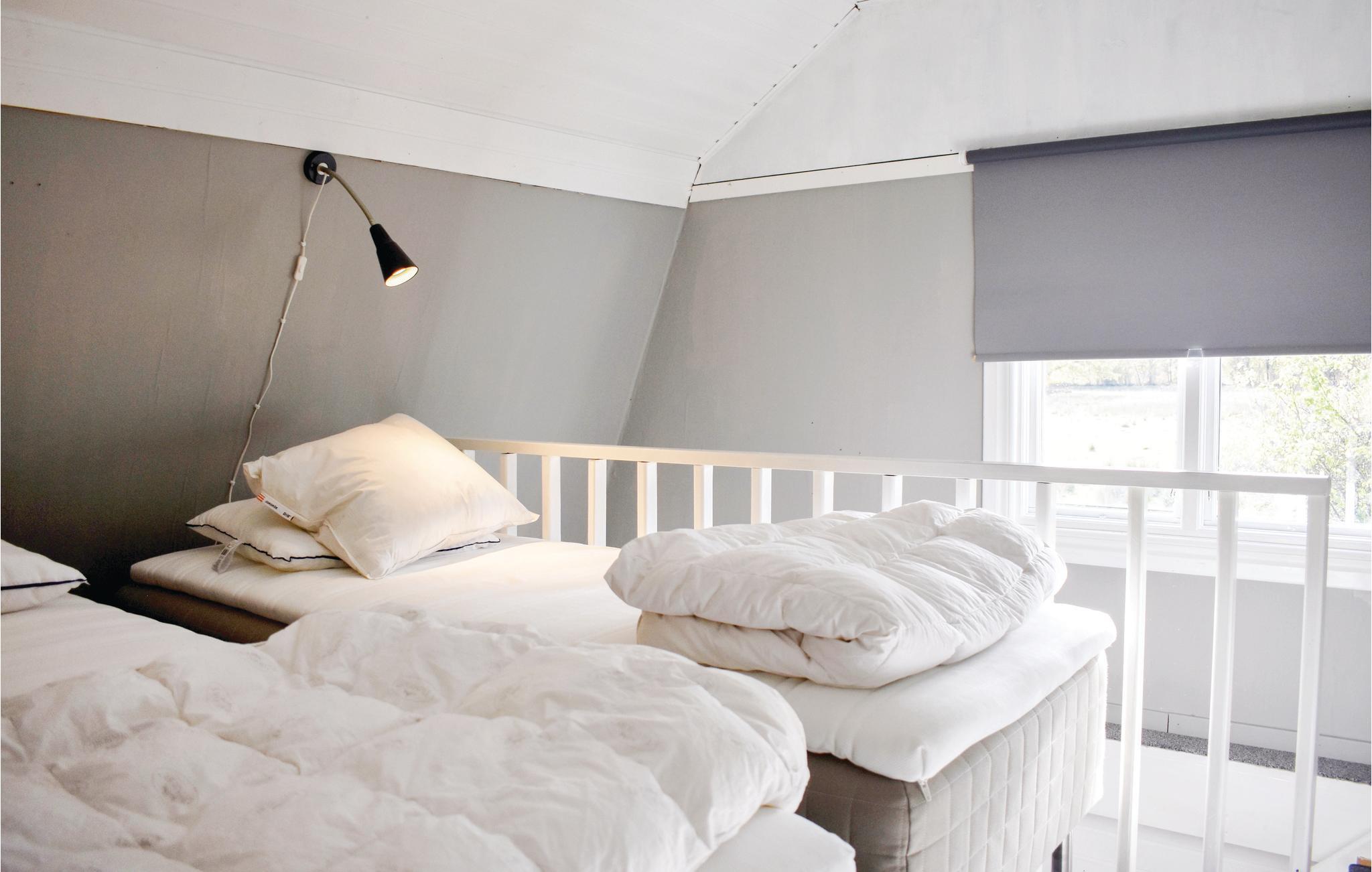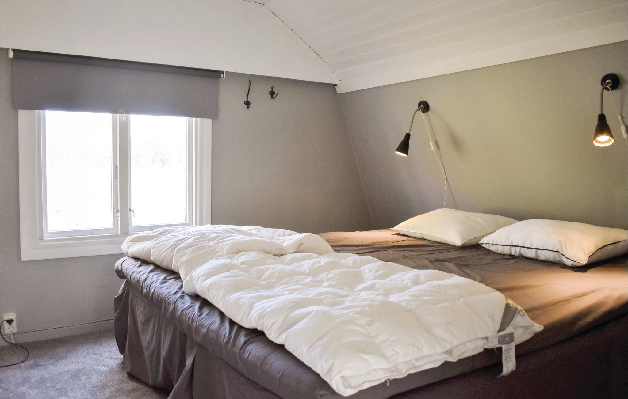 Hyggeligt sommerhus i Björkenäs uden for Jämjö i Blekinge skærgård. 300 meter til havet med sandstrand, hvor du både kan svømme og fiske. Cirka 3 km fra hytten ligger den friske, lavvandede og ikke mindst børnevenlige sø med fin sandbund. På gården er der kyllinger og svin, hvor du også kan købe friske æg. De børn, der ønsker, kan få en tur med en traktor. I Blekinge Arkipel er der masser af øer at udforske. Mange kan du køre eller cykle til, men nogle kan kun nås med båd. Enten lejer du en båd eller tager nogen af skærgårdsbåde, der sejler fra de fleste steder langs kysten. . Langs kysten er der også flere fiskerygere og/eller restauranter. For eksempel på Kristianopel. Placeringen af sommerhuset nær Karlskrona giver dig nærhed til både Kalmar, Öland og Glasriket. Børnegård, Marinemuseet i Karlskrona eller sælsafari på Olsängs Sælsafari er andre dejlige udflugtsmål. Soveværelse nummer to er et gennemgangsværelse. Ved boligens skel græsser får.