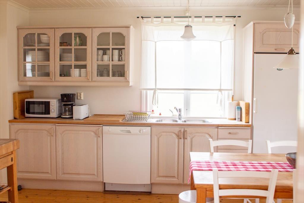 Det rummelige sommerhusområde omfatter hovedhuset med cirka 120 m² beboelsesareal samt to hyggelige gæstehuse på henholdsvis cirka 30 m² og 25 m². I alt står 8 sengepladser til rådighed, fordelt på flere soveværelser i de tre bygninger. I hovedhuset finder du to soveværelser – det ene med to enkeltsenge, som kan sættes sammen til en dobbeltseng, kakkelovn og balkon, og det andet med to enkeltsenge. En barneseng kan lånes efter aftale. I gæstehusene er der hver to yderligere senge. To badeværelser – et i hovedhuset og et i gæstehuset – begge med toilet og bruser, sikrer komfort, også ved fuld belægning. Der er desuden vaskemaskine i vaskerummet. I hovedhuset finder du et fuldt udstyret køkken med stor brændeovn, køle-/fryseskab, opvaskemaskine, mikrobølgeovn, kaffemaskine og brødrister. I den rummelige opholdsstue inviterer en sofa til afslapning, og her findes et fjernsyn. Særligt charmerende: den store kakkelovn og spisestuen med fantastiske panoramavinduer og udsigt over søen.