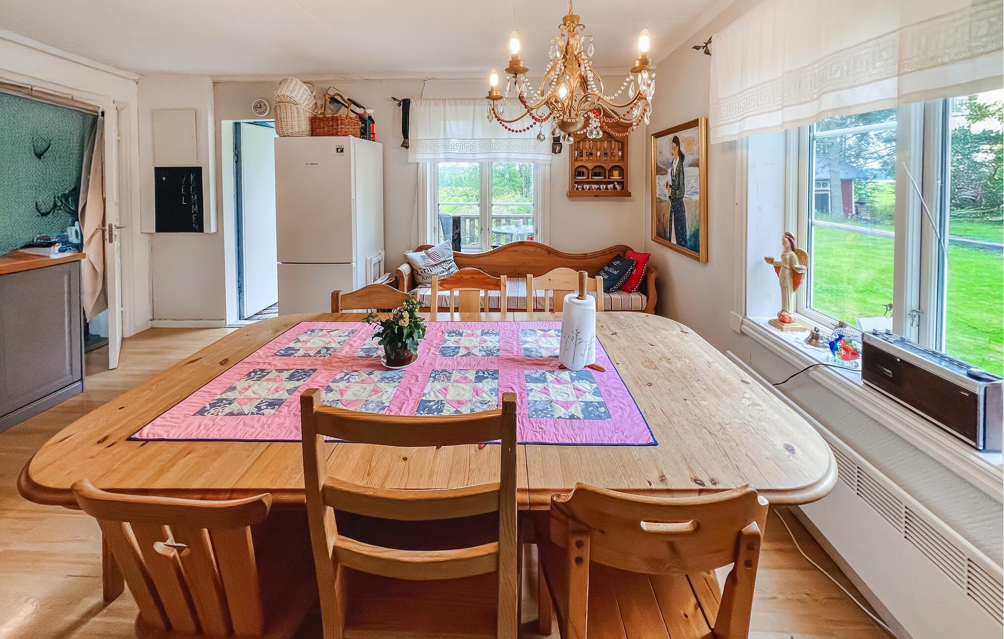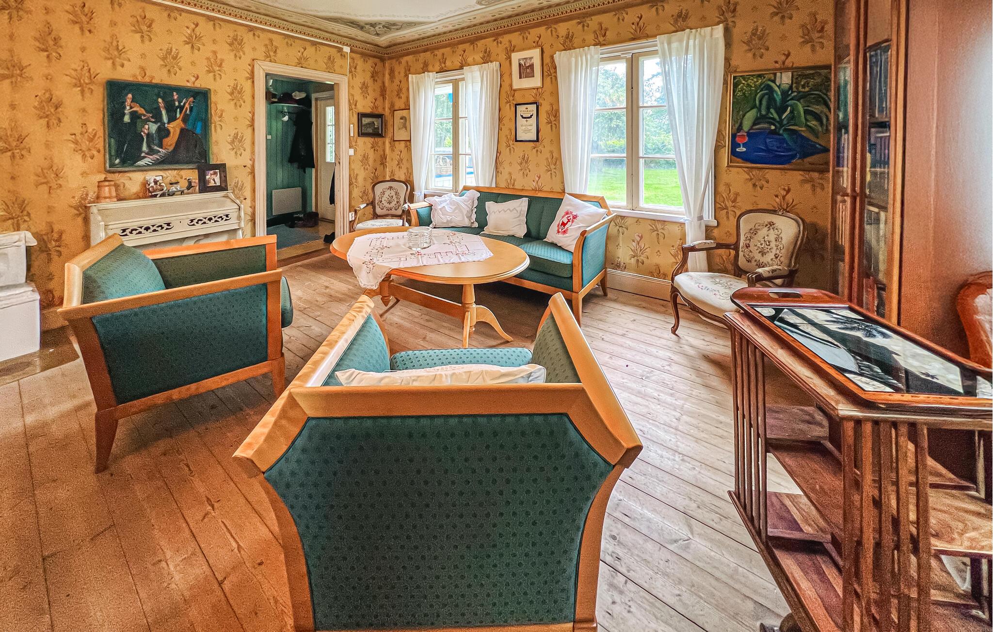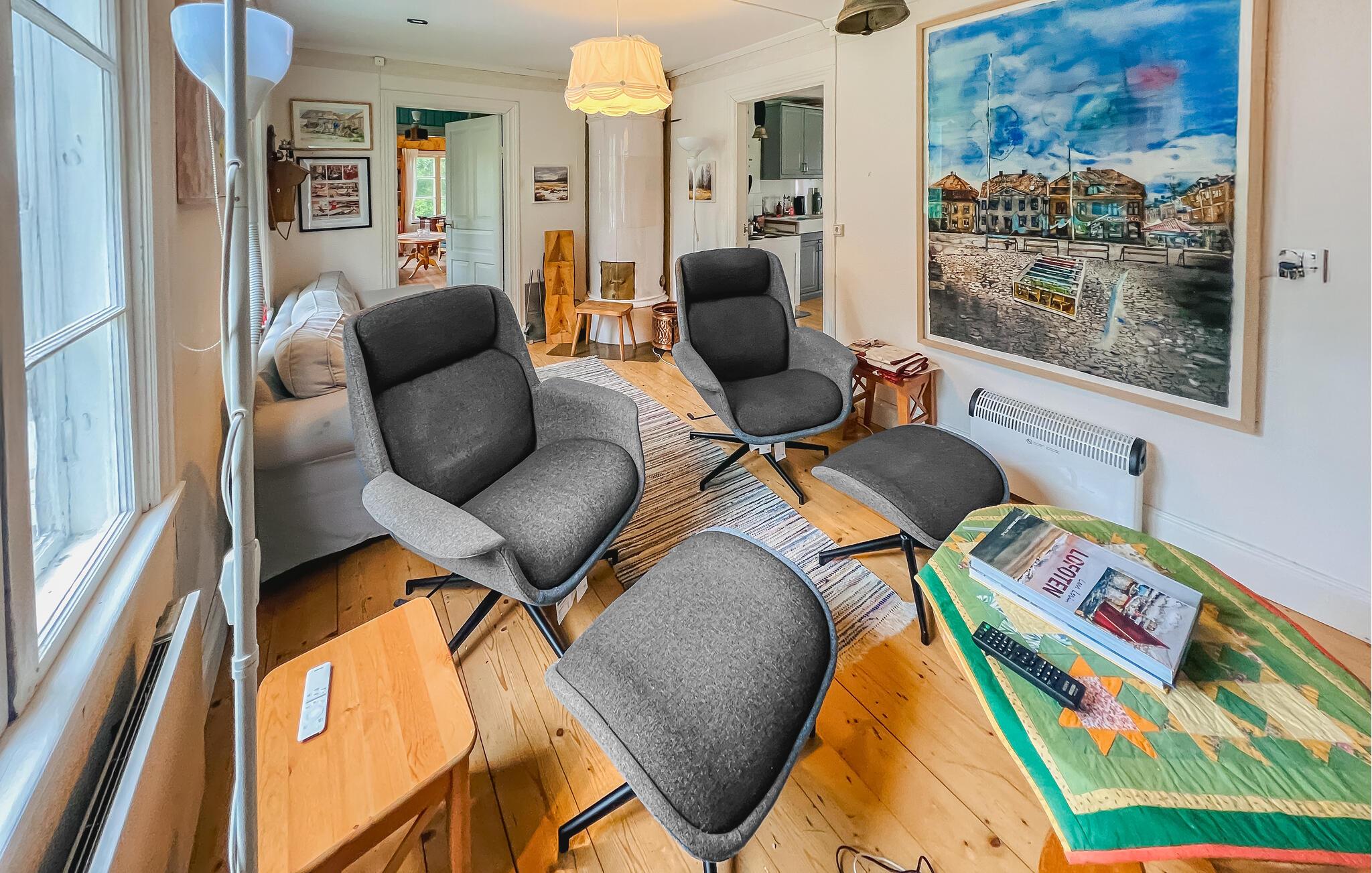 Bliv betaget af det smukke interiør i dette rummelige feriehus. Her kan I spise, lege og slappe af i en hyggelig atmosfære med nostalgisk charme. Glæd jer til harmoniske måltider og muntre spilleaftener med familien, forkæl jer selv med afslappende øjeblikke i saunaen og drag fordel af de mange indbydende steder at læse eller snakke.
