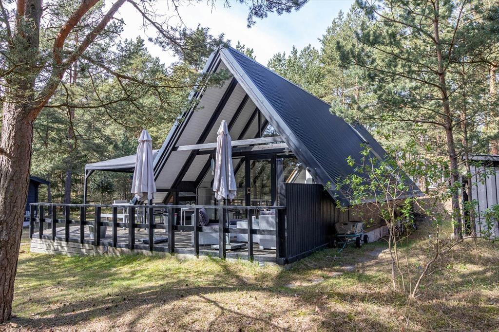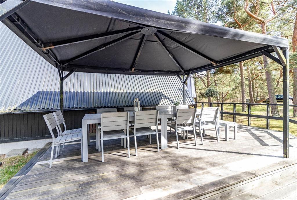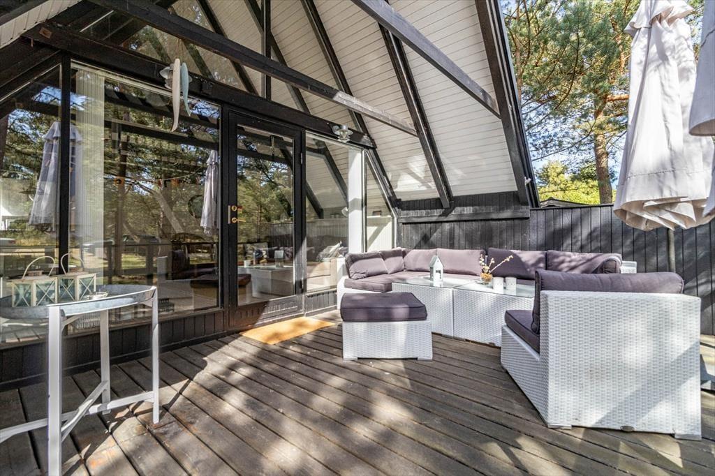 Varme dage og lange sommeraftener kan nydes på træterrassen, som omkranser huset på to sider, med sidde- og loungemøbler. Solshelme og pavillon samt husets tag, der dækker et par kvadratmeter foran hoveddøren, giver beskyttelse mod sol og regn.