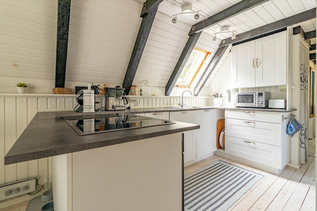 Køkkenet ligger åbent i forbindelse med opholdsområdet og har, udover et firepladet keramisk komfur, ovn, køleskab og fryser, opvaskemaskine, mikrobølgeovn, elkedel og kaffemaskine, alt hvad du behøver til at tilberede og servere almindelige retter til op til 6 personer. Du spiser dine måltider ved det lange spisebord til 6 personer i opholdsområdet.