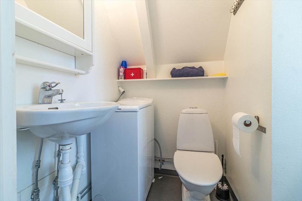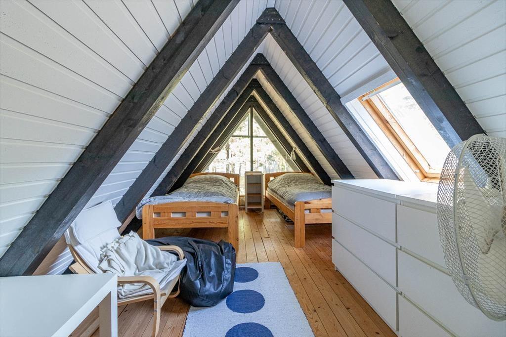 Modsat køkkenet ligger det første soveværelse med en køjeseng. Gennem køkkenet kommer du til en gang, hvorfra du til højre finder det andet soveværelse med dobbeltseng, og til venstre badeværelset med toilet, bruseniche og vaskemaskine. De resterende to sovepladser findes på hemsen over køkkenet med to enkeltsenge, som nås via en (stejl) trappe af træ fra opholdsområdet. Her skal man være forsigtig, da trappen ikke har gelænder mod opholdsområdet.