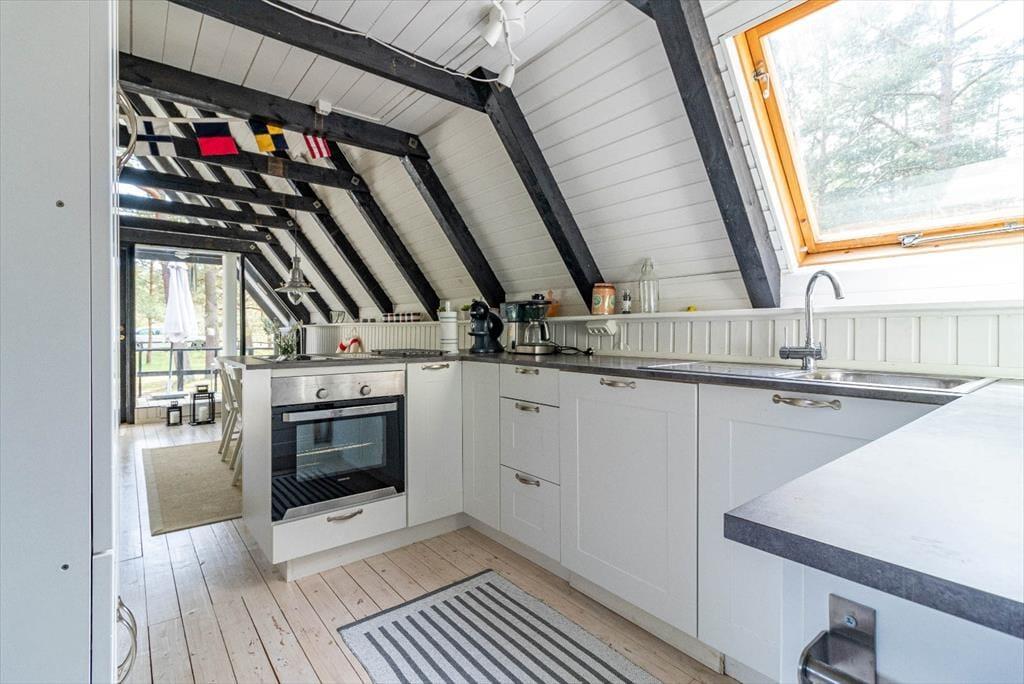 På ca. 70 m² tilbyder dette renoverede feriehus plads til op til 6 gæster. Husdyr er også velkomne. Når du træder ind i huset, befinder du dig i det åbne kombinerede opholds- og køkkenområde med højt til loftet, som takket være den fuldglaserede front har et fremragende lysindfald. Rummet er indrettet med en komfortabel sovesofa, et fladskærms-tv med svenske kanaler og en dvd-afspiller. Der er også hurtigt internet (100/100).