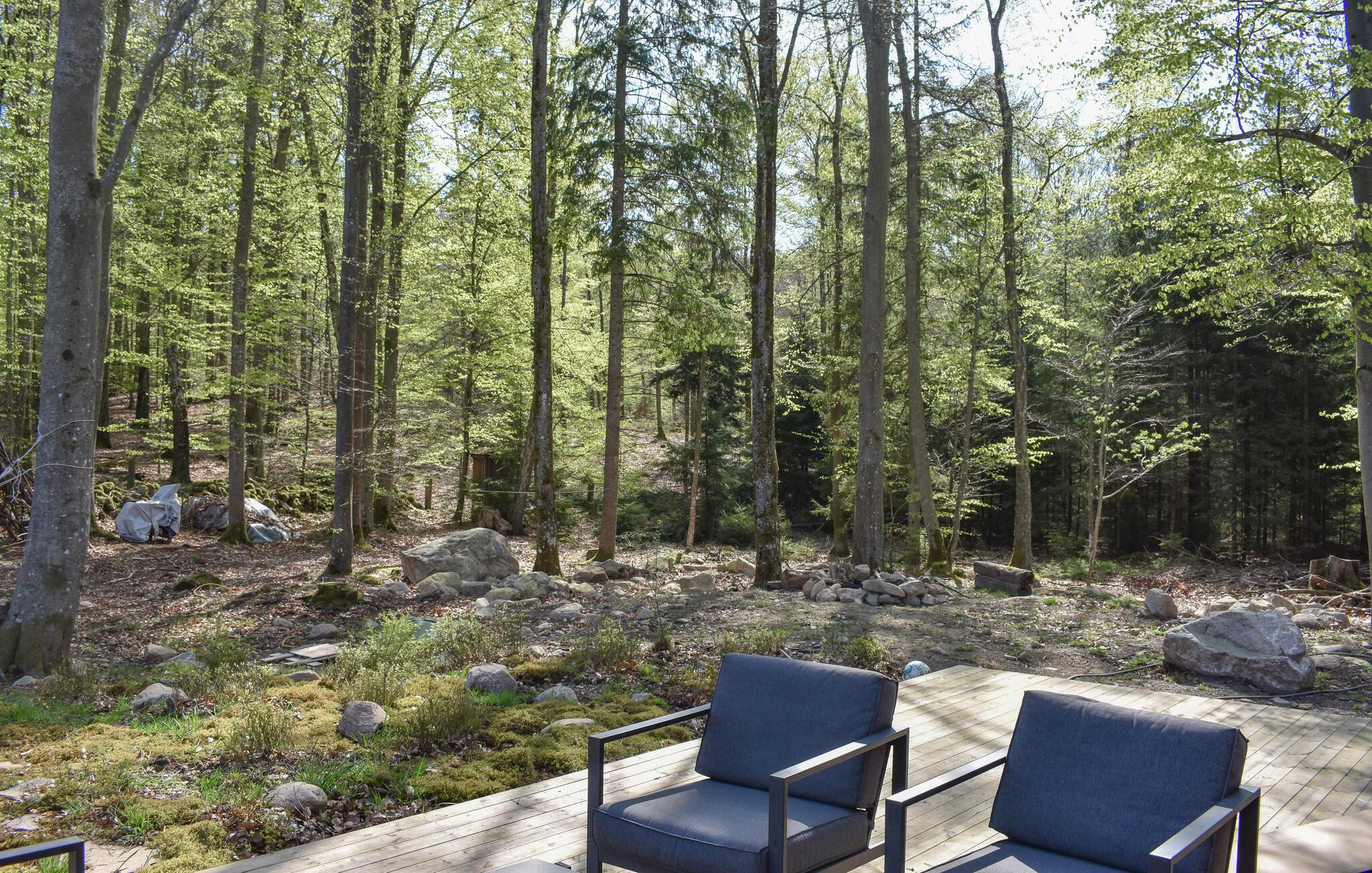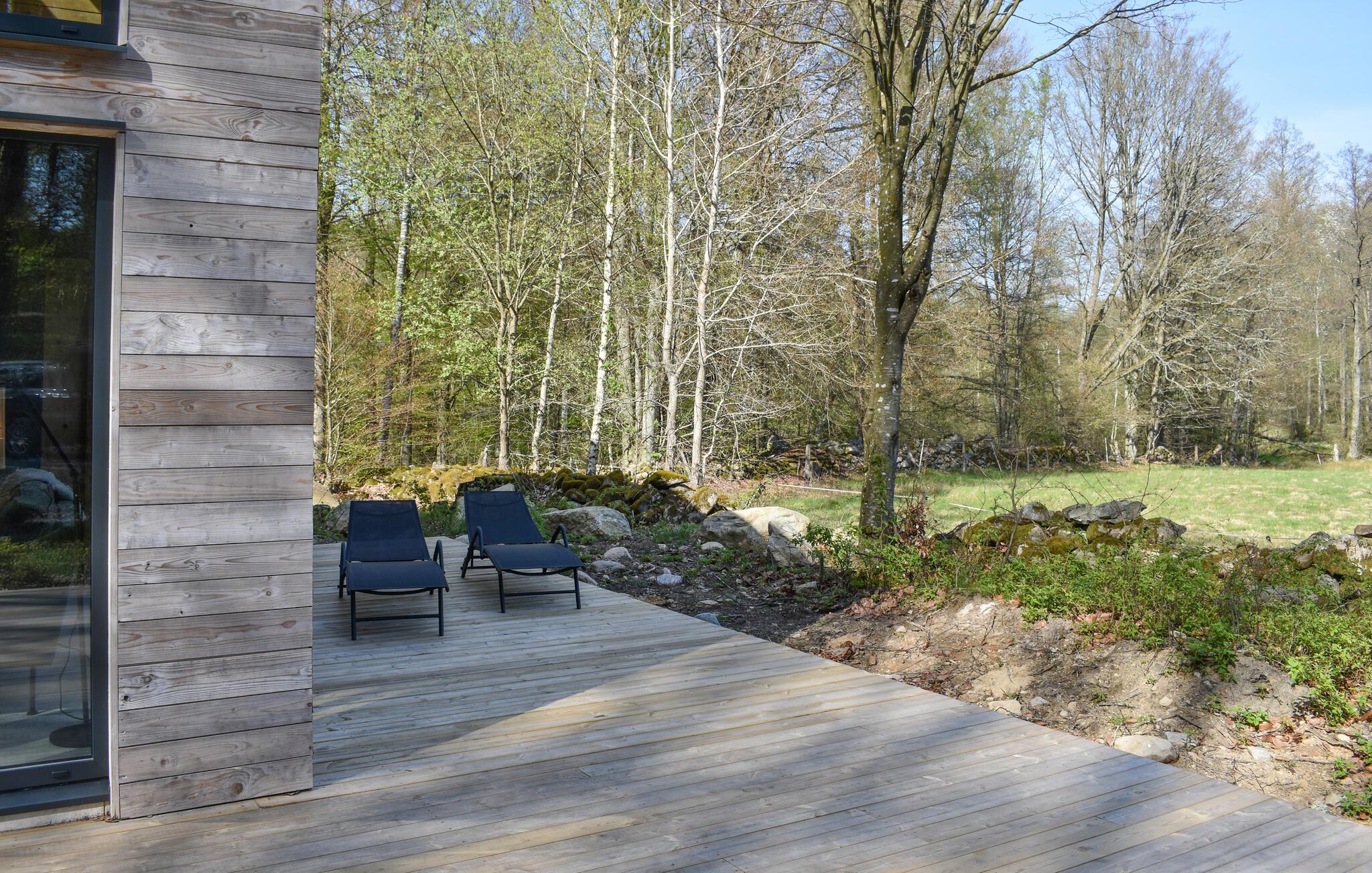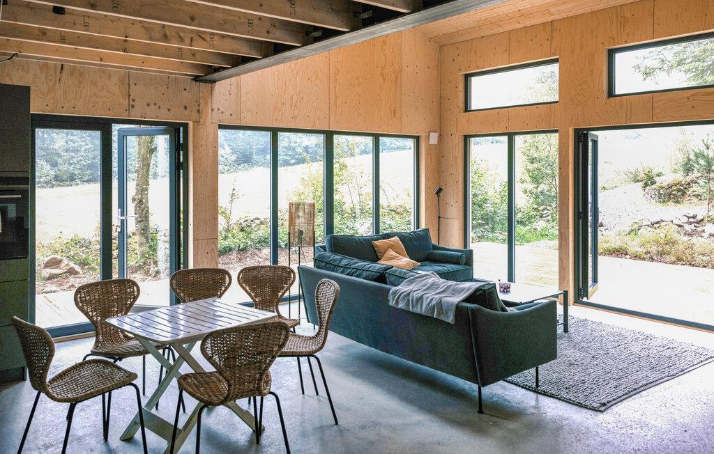 Velkommen til dette moderne hus, der ligger virkelig smukt i naturen og med sin flotte facade nærmest går i et med de skovklædte omgivelser. Huset er komfortabelt indrettet med gode møbler og vidunderlige vinduespartier, der giver udsigt til omgivelserne og lader dagslyset sive uforstyrret ind i den åbne stue. Efter en dag i naturen kan I hygge jer med et lækkert måltid mad, nyde udsigten og runde af med en velfortjent tur i saunaen og svede de sidste bekymringer ud af kroppen.