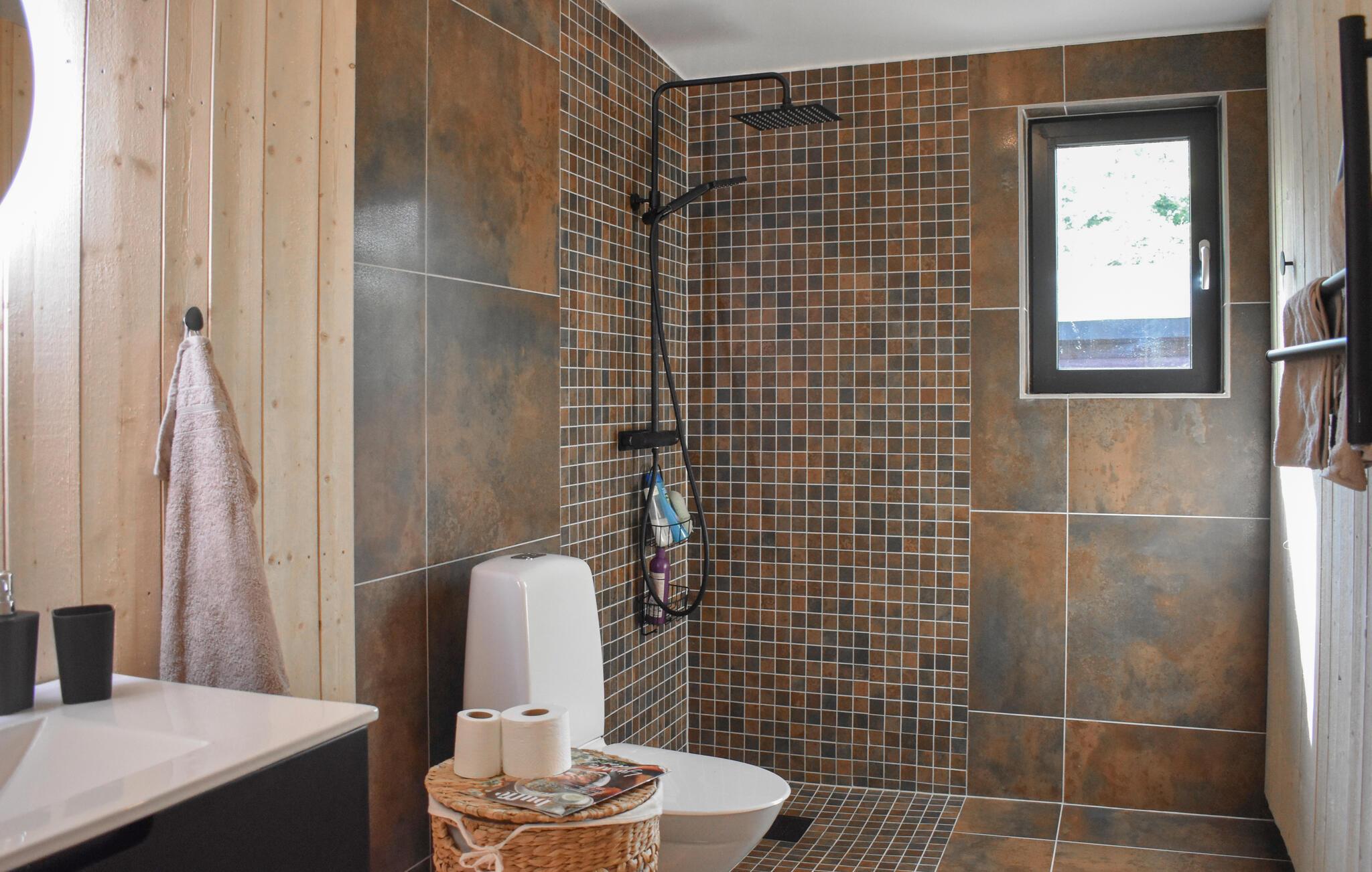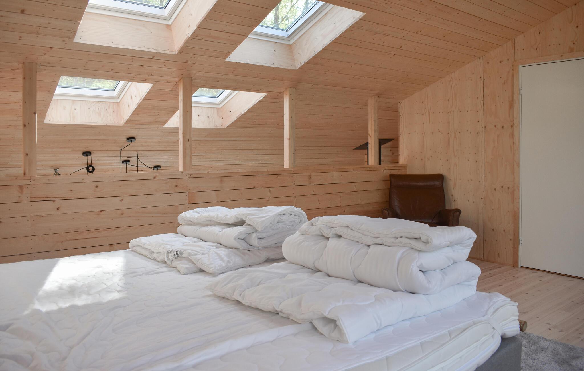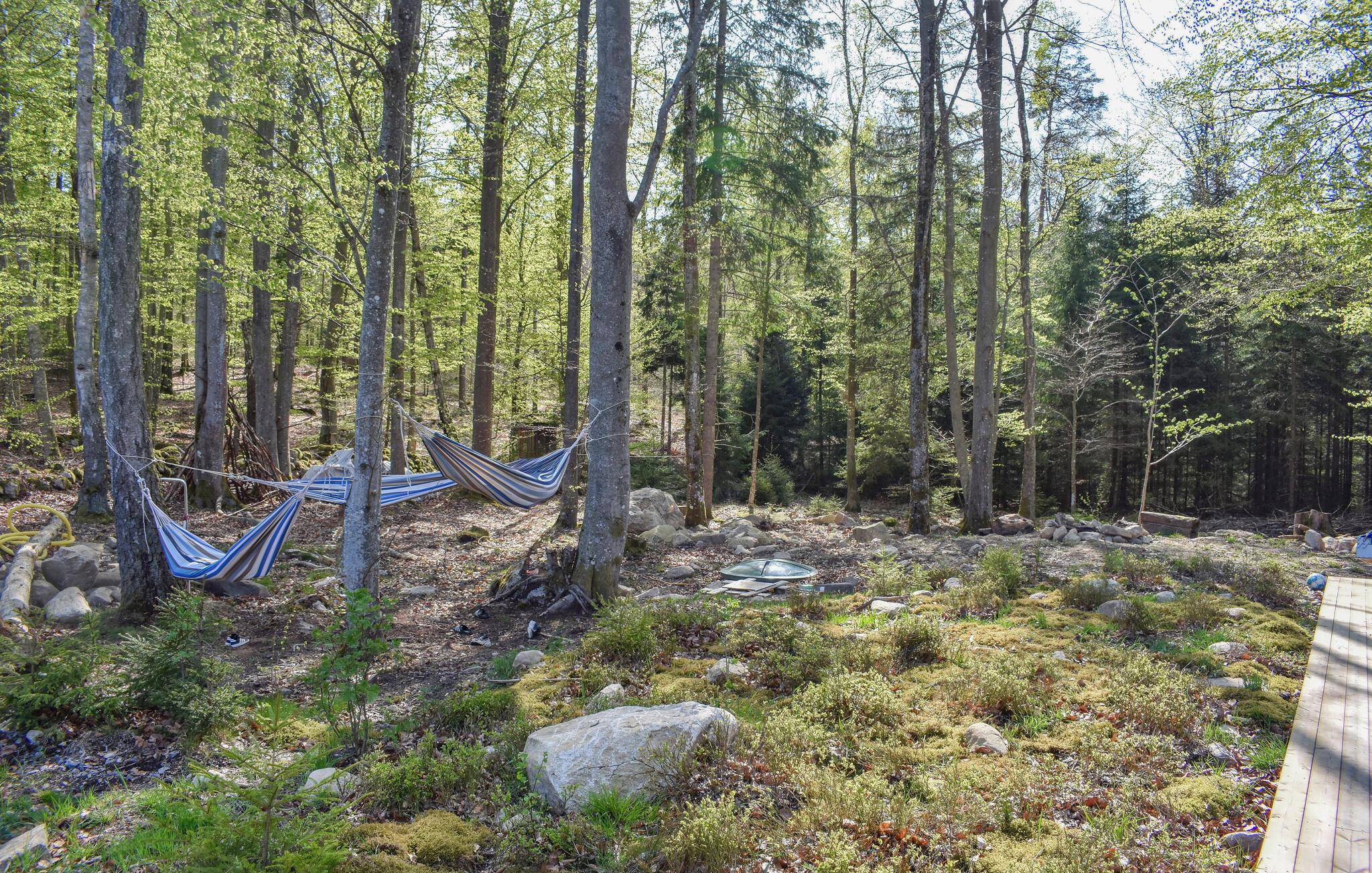 Velkommen til dette moderne hus, der ligger virkelig smukt i naturen og med sin flotte facade nærmest går i et med de skovklædte omgivelser. Huset er komfortabelt indrettet med gode møbler og vidunderlige vinduespartier, der giver udsigt til omgivelserne og lader dagslyset sive uforstyrret ind i den åbne stue. Efter en dag i naturen kan I hygge jer med et lækkert måltid mad, nyde udsigten og runde af med en velfortjent tur i saunaen og svede de sidste bekymringer ud af kroppen.