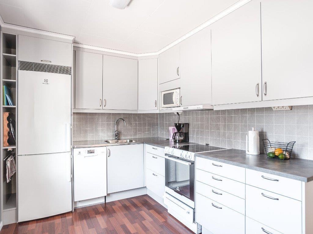 Køkkenet er godt udstyret med bl.a. mikroovn og opvaskemaskine, så de huslige opgaver kan klares hurtigt. Badeværelset har toilet, brusekabine og vaskemaskine.
