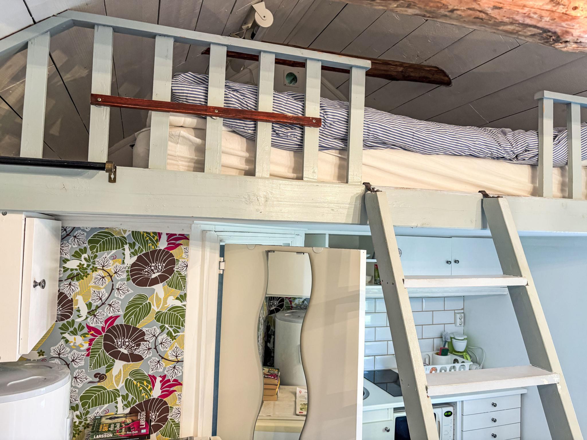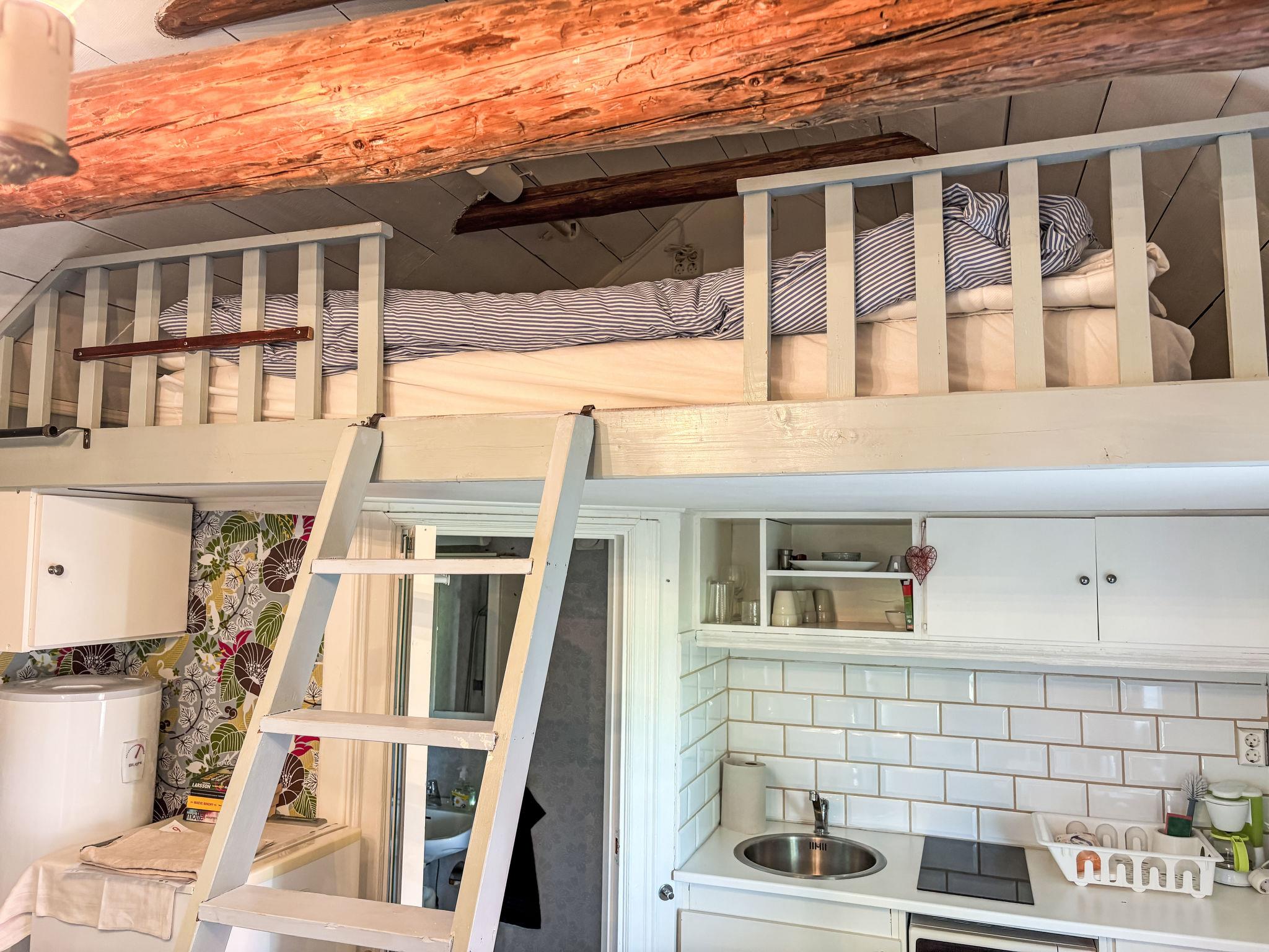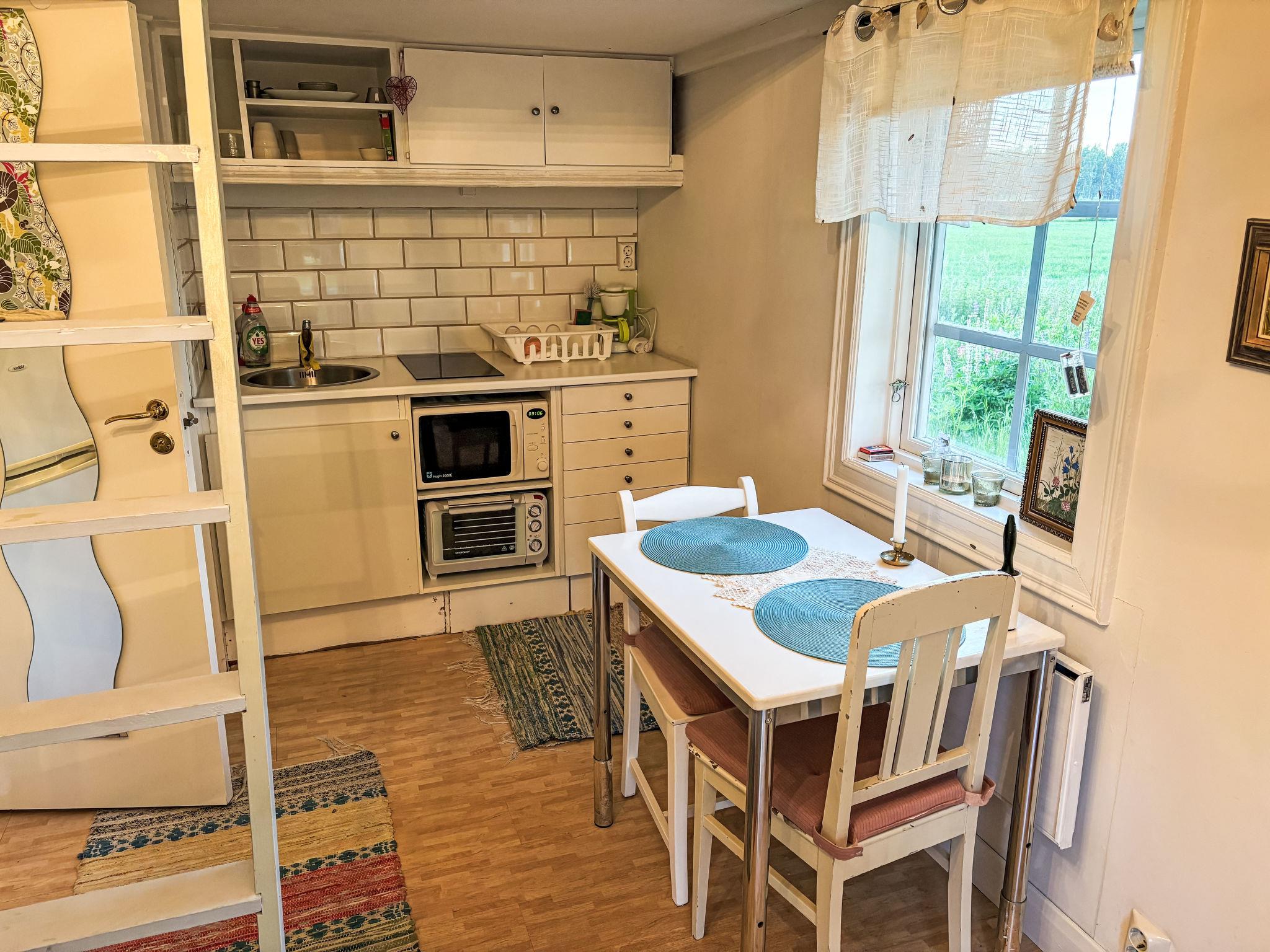 "Skyberga Torp Lilla stugan", 1-room house 10 m2. Bright, very comfortable and cosy furnishings: open living/dining room with open-hearth fireplace. Kitchenette (2 induction hot plates, freezer, electric coffee machine) with dining table. Shower/WC. Heating. Upper floor: (steep stair) sleeping alcove with sloping ceilings with 1 double bed (180 cm, length 200 cm). Beautiful view of the countryside and the forest. Please note: non-smoking house. Maximum 1 pet/ dog allowed. Private entrance, smoke alarm, fire extinguisher. Instead of an enclosed bedroom, some sleeping areas are located in an open-plan area (gallery, alcove, etc.).
