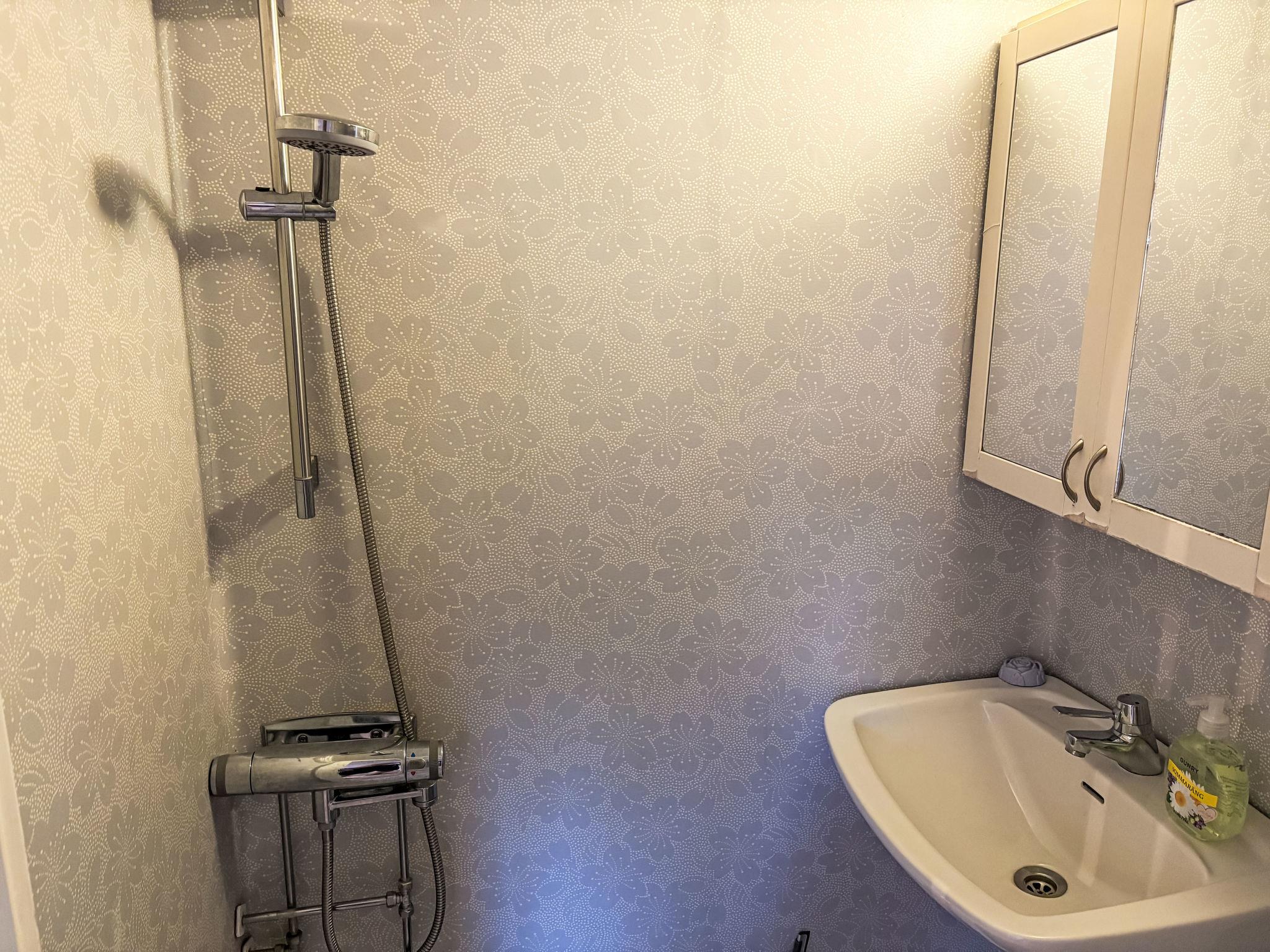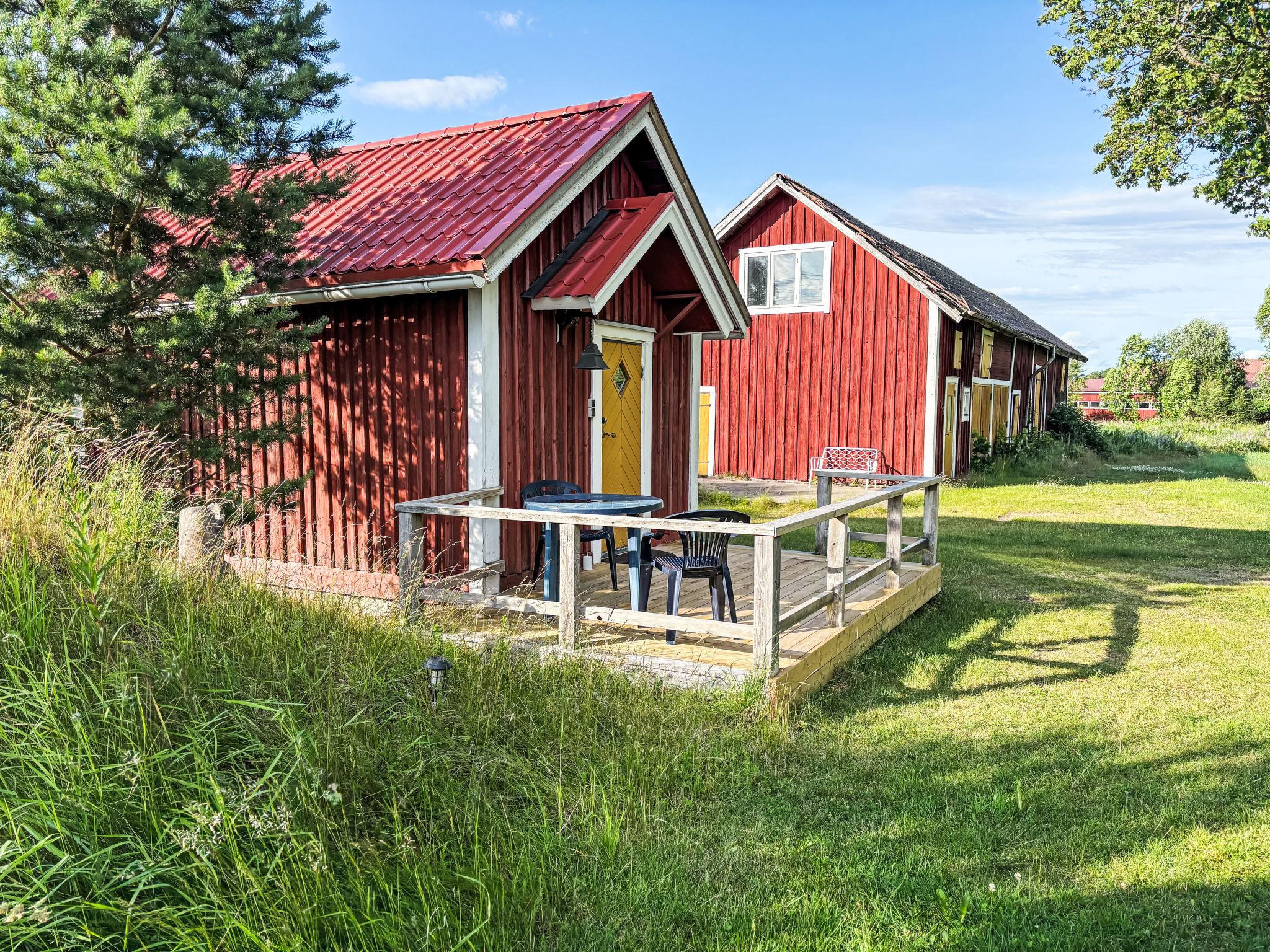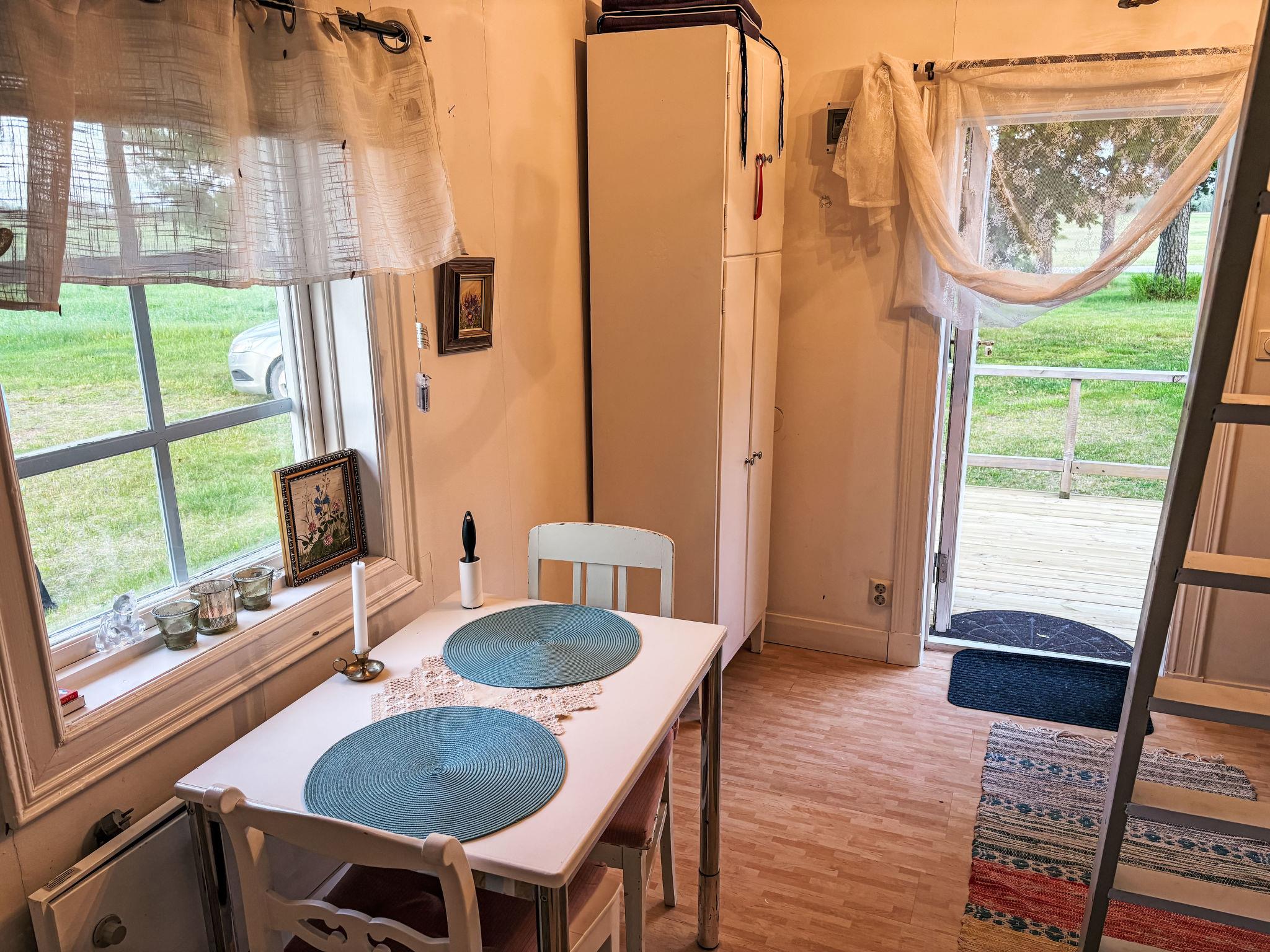 "Skyberga Torp Lilla stugan", 1-room house 10 m2. Bright, very comfortable and cosy furnishings: open living/dining room with open-hearth fireplace. Kitchenette (2 induction hot plates, freezer, electric coffee machine) with dining table. Shower/WC. Heating. Upper floor: (steep stair) sleeping alcove with sloping ceilings with 1 double bed (180 cm, length 200 cm). Beautiful view of the countryside and the forest. Please note: non-smoking house. Maximum 1 pet/ dog allowed. Private entrance, smoke alarm, fire extinguisher. Instead of an enclosed bedroom, some sleeping areas are located in an open-plan area (gallery, alcove, etc.).