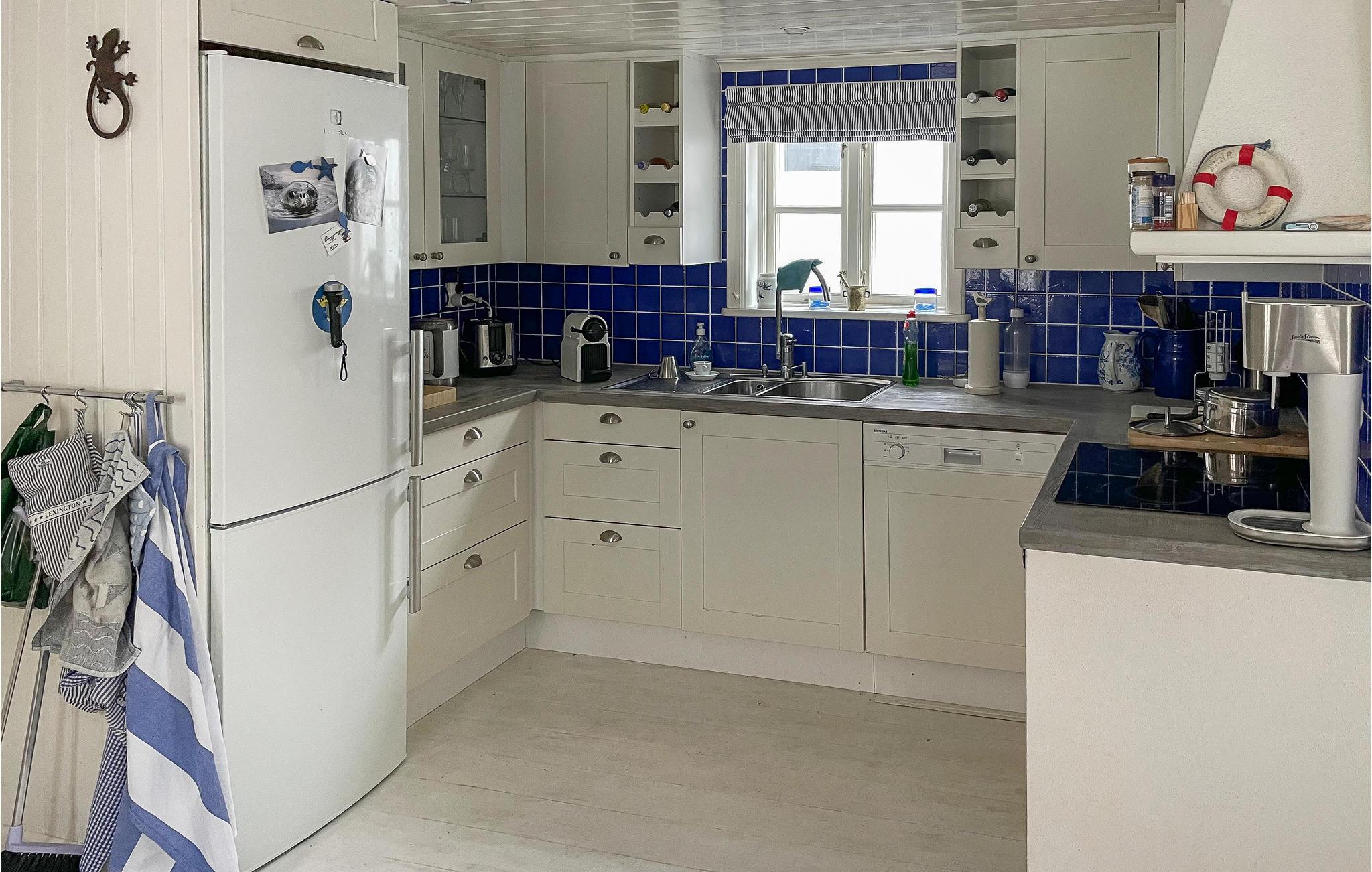 Velkommen til dette feriehus, som byder på de ideelle rammer for en afvekslende feriedage. I det lyse, hyggeligt indrettede to-etagers hus formidler de blå farvedetaljer på fin vis nærheden til havet. Her kan I nyde tiden sammen med jeres familie, uanset om I laver mad sammen, spiller spil eller smækker fødderne op ovenpå en dejlig dag. I vil bestemt også tilbringe mange timer udenfor, hvor I kan indtage morgenmaden og den lækre grillmad. I kan selv bestemme, om det skal være på altanen eller terrassen. Gå til havet og snup en forfriskende morgendukkert.