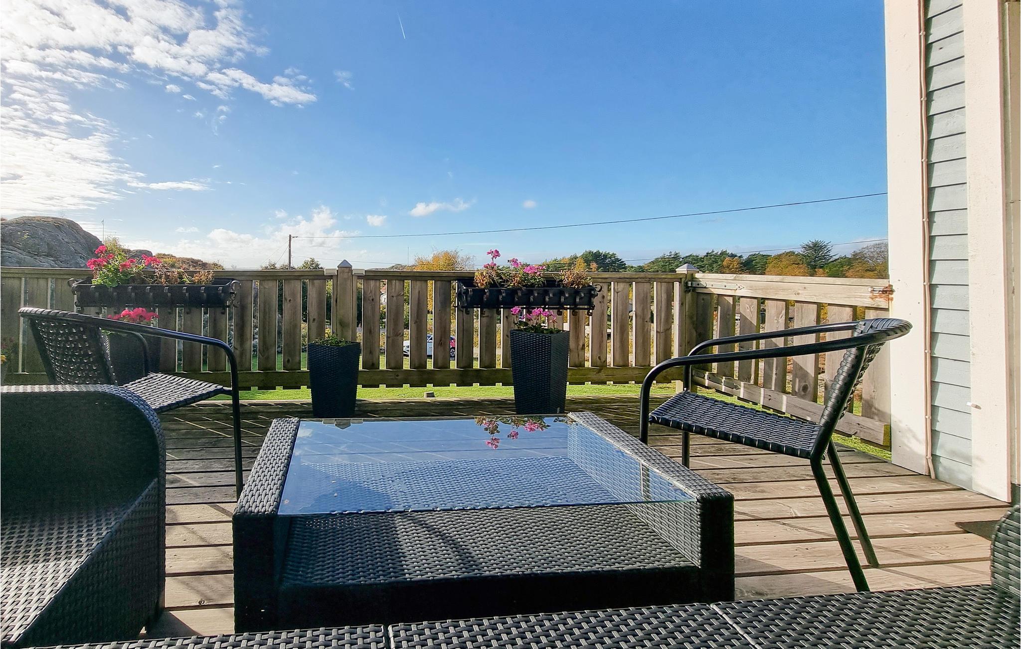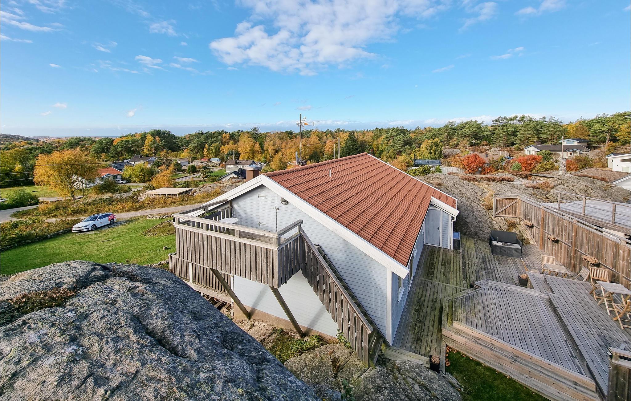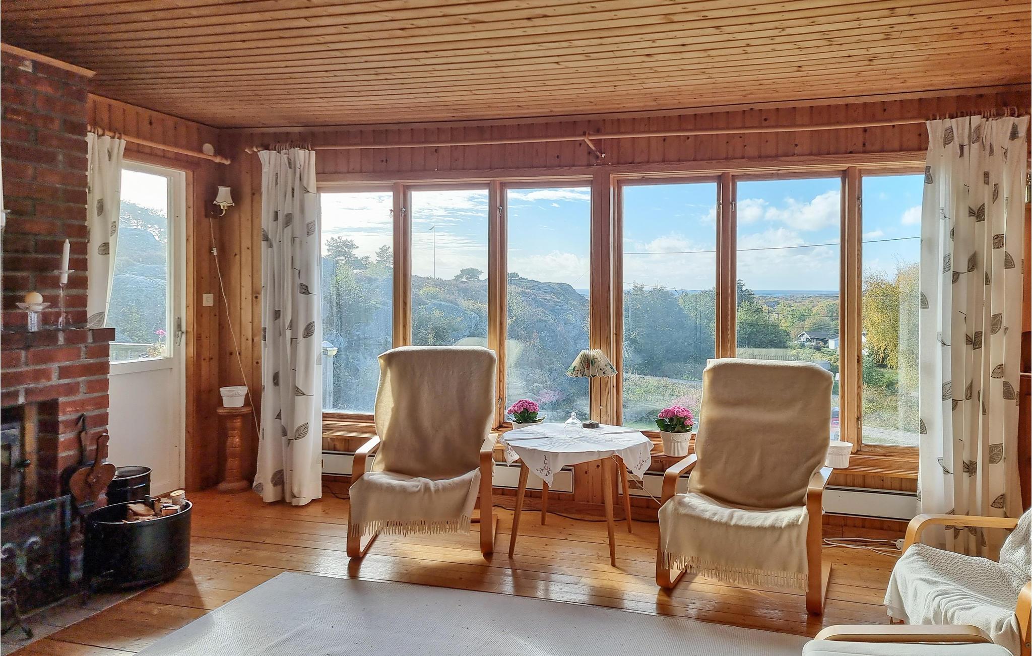 Dette hyggelige sommerhus har en fantastisk beliggenhed på en stor klippefyldt naturgrund på øen Tjörn. Nyd den lyse stue med sine store vinduespartier og pejsen, der giver ekstra varme til kølige aftener. Efter en begivenhedsrig dag kan I nyde den atmosfæriske udsigt over landskabet fra terrassen eller fra stuen.