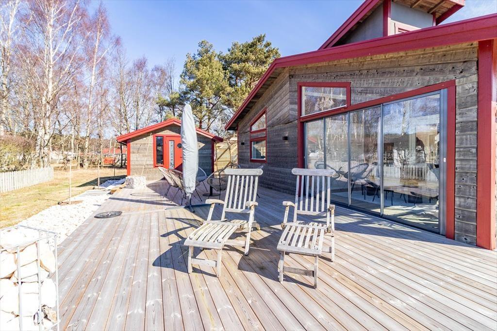 Feriehuset ligger i et sommerhusområde på Hallands vestkyst. Den dejlige sandstrand “Skummeslövsstrand” nås nemt til fods på ca. 900 m eller i bil på ca. 1,2 km. Nærmeste kiosk/pizzeria/minigolfbane ligger 500 m væk. Der er 2 km til Skummeslövs centrum, hvor der findes en ICA-butik, restauranter, pizzeriaer samt et bageri med friskbagt brød dagligt.
