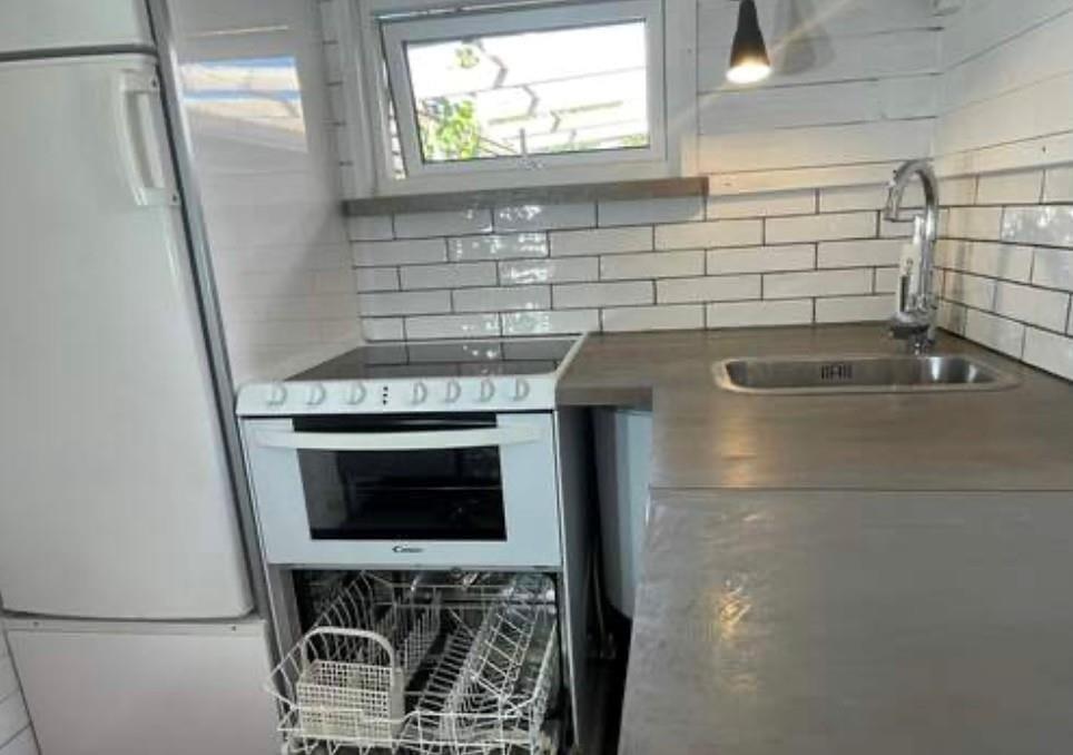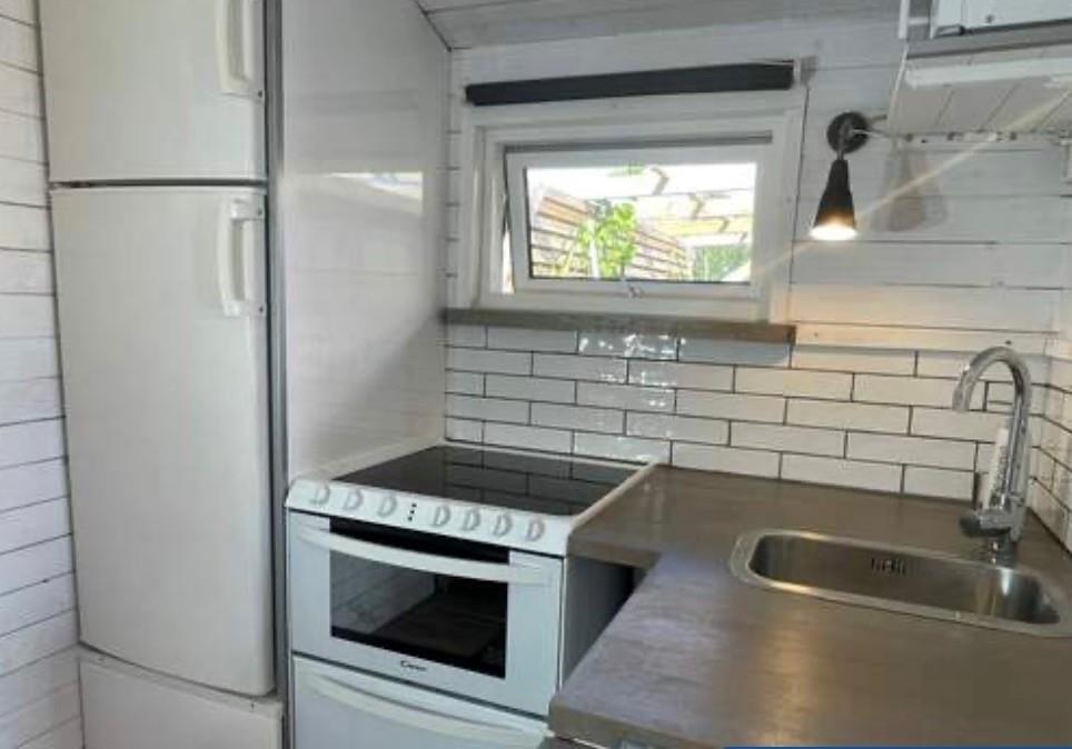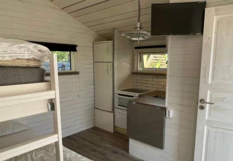 I det lille gæstehus er der plads til maksimalt 3 personer på 15 m². Man træder direkte ind i det kombinerede opholds-, køkken- og soveområde. Køkkenet er udstyret med komfur, ovn, opvaskemaskine, køle-/fryseskab, mikrobølgeovn, kaffemaskine og elkedel. Der er også TV.