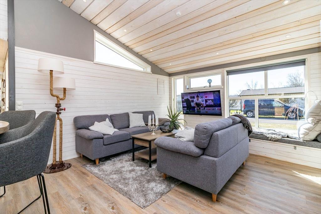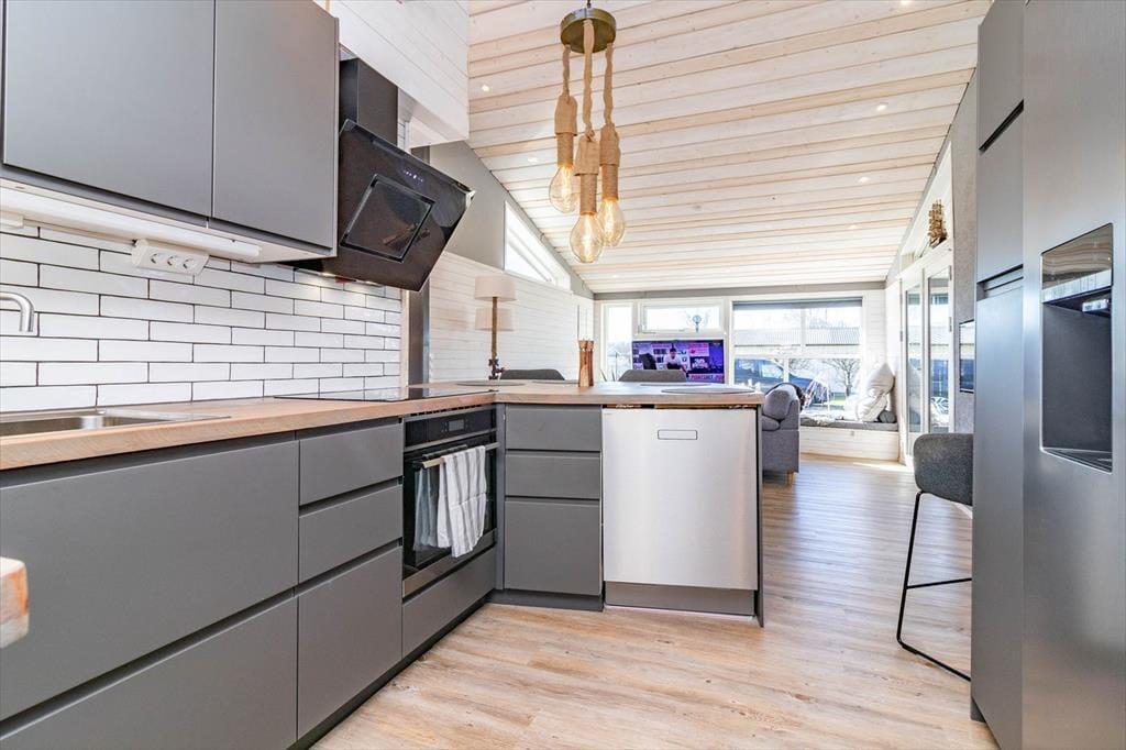 Den åbne planløsning mellem stue og køkken er hyggeligt indrettet med to sofaer, TV med Chromecast, brændeovn samt internet (inkluderet). Køkkenet er fuldt udstyret med induktionskogeplade med 4 zoner, ovn, køle-/fryseskab med ismaskine, vinkøleskab, opvaskemaskine, mikrobølgeovn og emhætte.