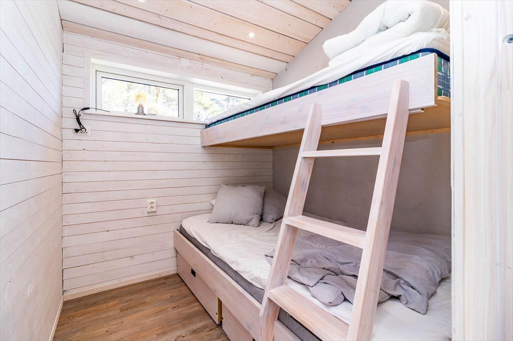 Det nybyggede feriehus fra 2025 med høj standard tilbyder ca. 80 m² boligareal og plads til op til 5 personer. Der er to soveværelser: ét med dobbeltseng (180 cm) og ét med køjeseng (120 cm nederst og 90 cm øverst).