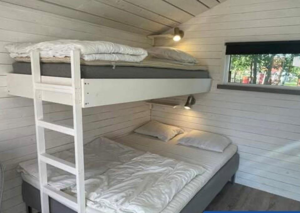 Overfor køkkenet står en køjeseng med dobbeltseng (140 cm) nederst og enkeltseng (90 cm) øverst. Det lille badeværelse har toilet og bruser. Huset opvarmes med el.