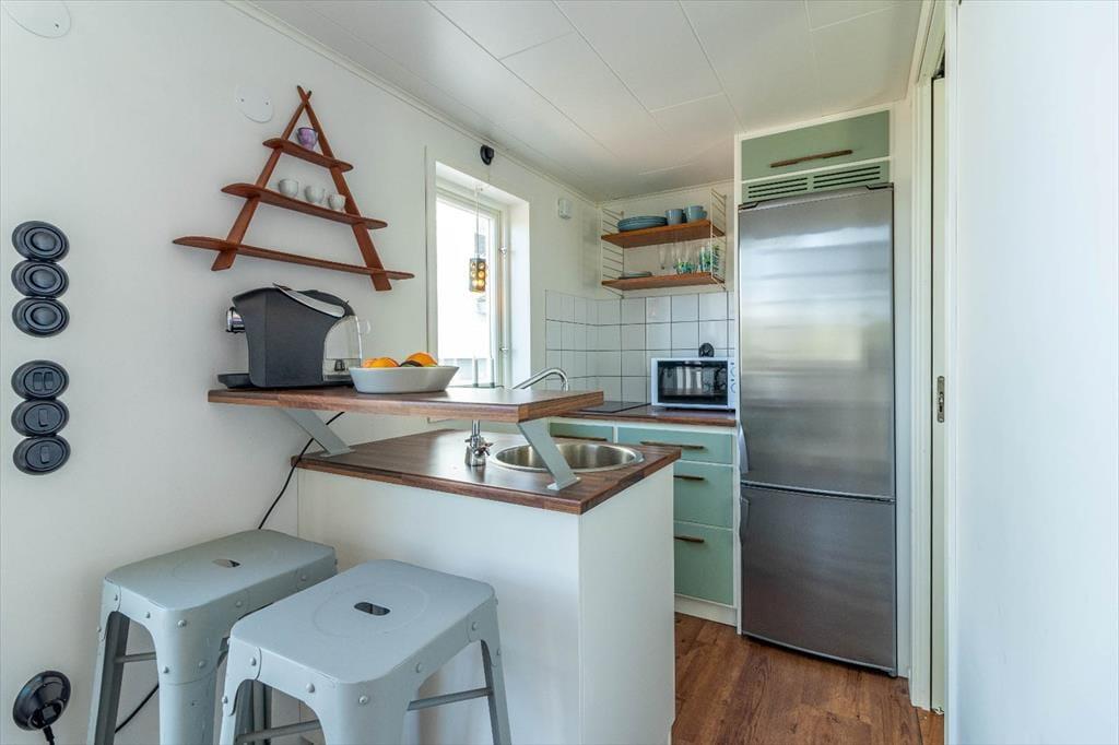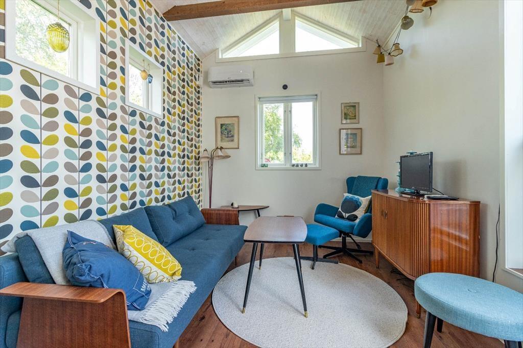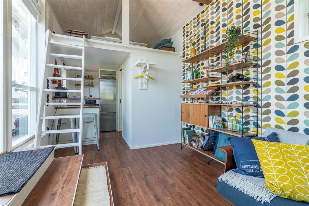 Huset har en boligareal på ca. 28 m² plus en 9 m² stor hems. Der er plads til op til 4 personer. I det åbne opholds- og soveværelse finder du et 32-tommers smart-tv og en sovesofa. På hemsen står der en dobbeltseng med en stor madras. Det åbne køkken er udstyret med alt, hvad du har brug for til selvforplejning: komfur med 2 induktionskogeplader, køle-/fryseskab, mikroovn, kaffemaskine og alle nødvendige køkkenredskaber. Badeværelset har toilet og bruser. En varmepumpe og elektriske radiatorer sørger for varme på køligere dage.