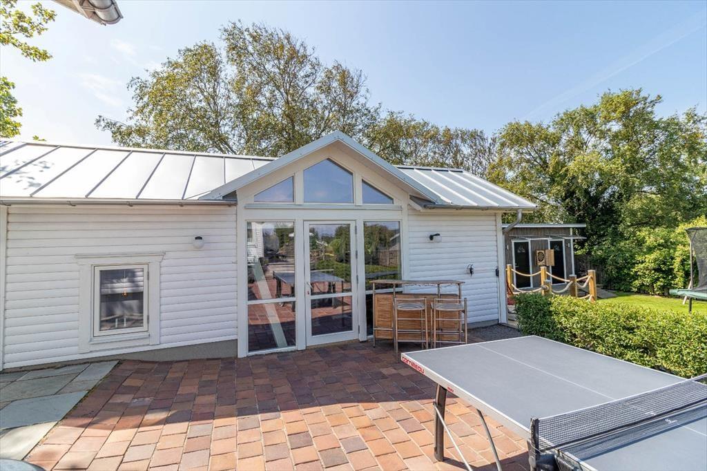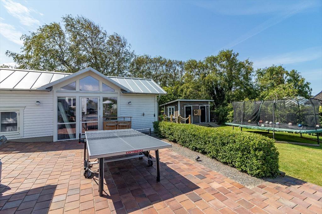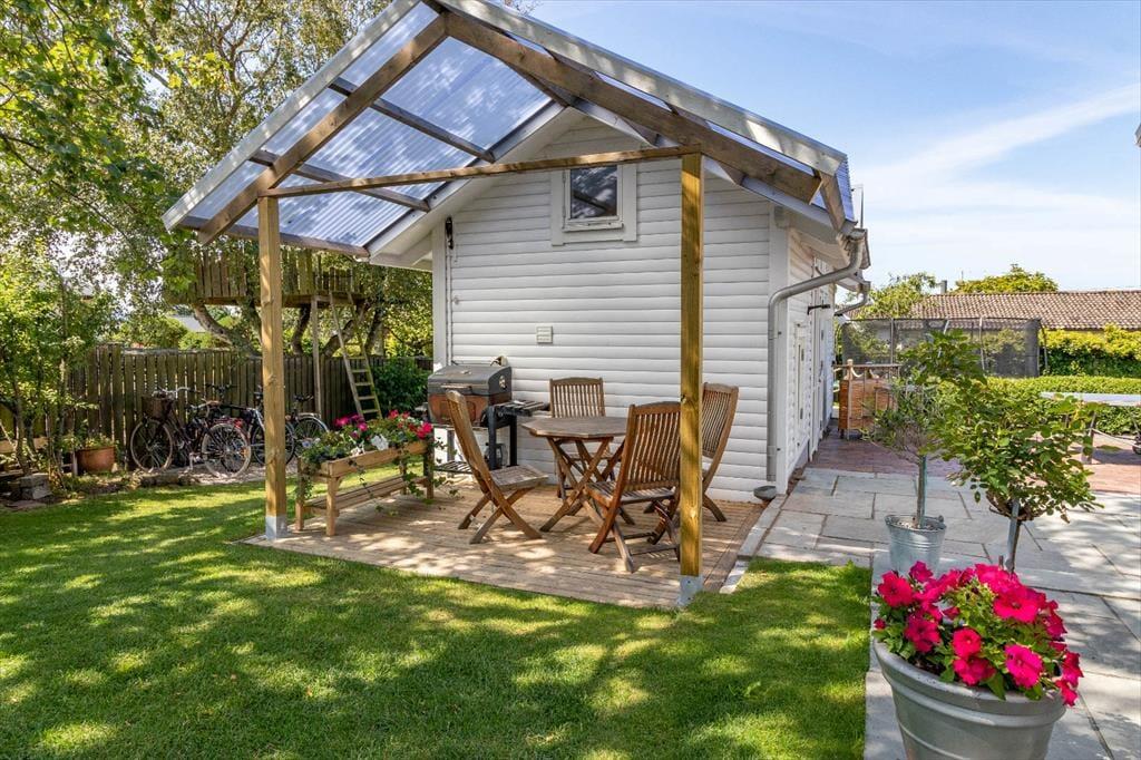 Udenfor inviterer to terrasser – den ene overdækket – med terrasse møbler og grill til afslapning. Der er også trådløst internet og efter forudgående aftale en mobil sauna. Du kan parkere på grunden. For sjov og motion er der bordtennisbord, et lille fodboldmål og en dartskive i haven.