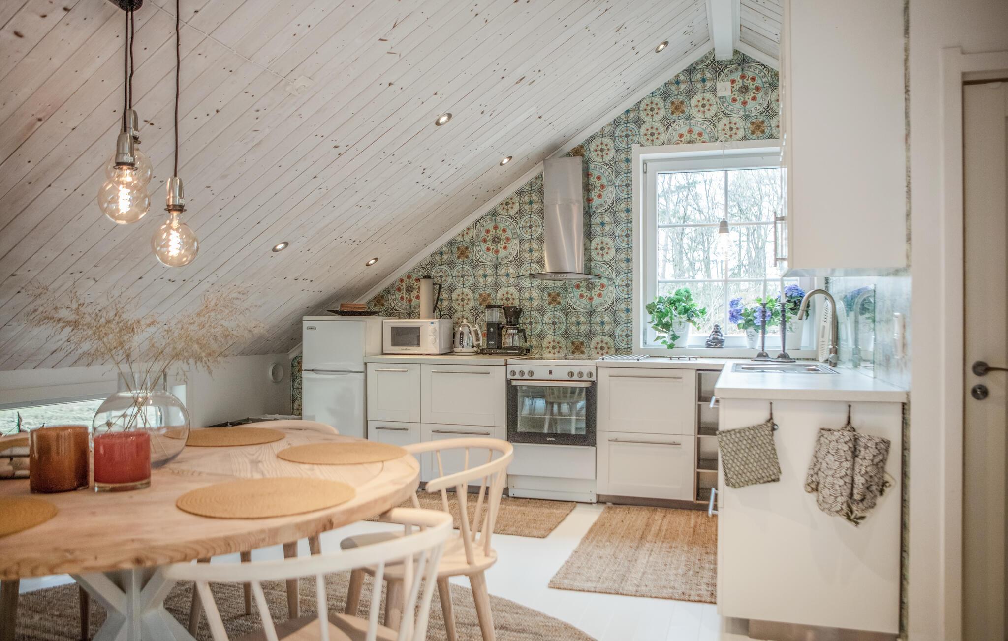 I bor i gangafstand til bade- og fiskesø med rent vand, så det er bare med at huske badetøjet, når feriekufferten skal pakkes. Den hyggelige stue ligger i åbent plan med det veludstyrede køkken. To soveværelser og et indbydende badeværelse. I stueplan er der terrasse og grillplads, og I bor nær skov og mark til afslappende gåture og jagt efter bær og svampe i sensommeren.