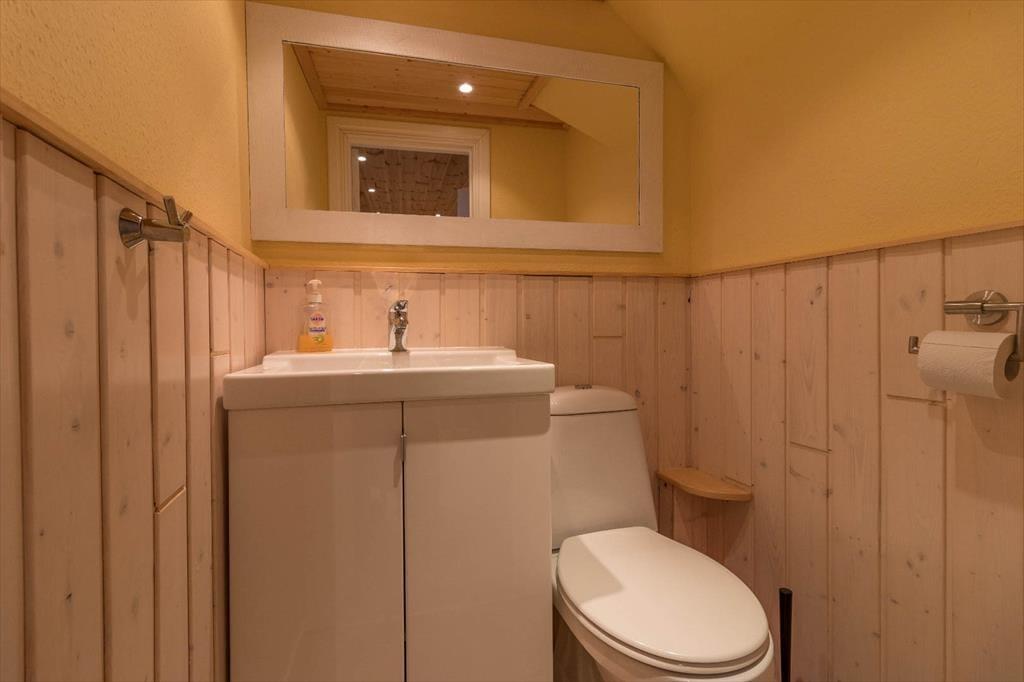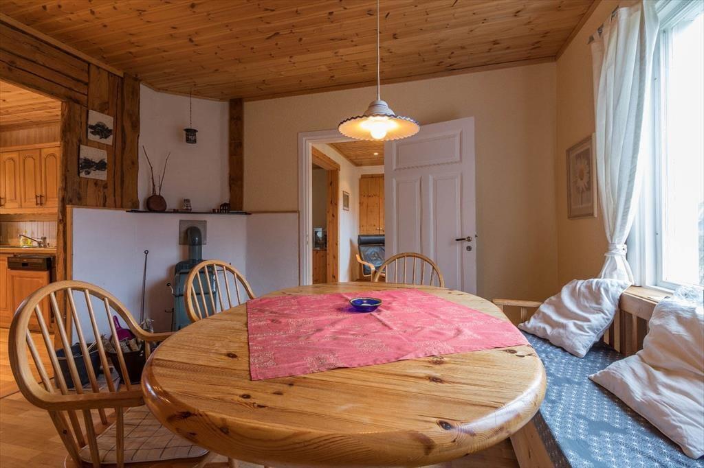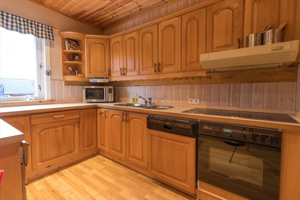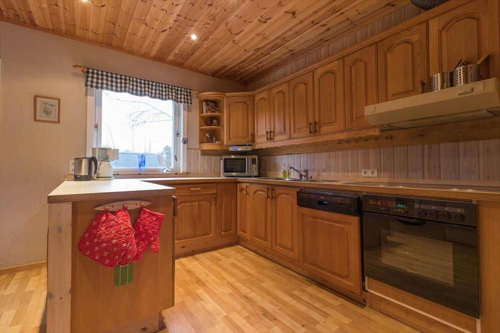Det åbne køkken er fuldt udstyret med komfur (4 keramiske plader), ovn, emhætte, køleskab, fryser, opvaskemaskine, mikroovn og kaffemaskine. Derudover findes en spisestue, 2 badeværelser (et med bruser og toilet i stueetagen og et gæstetoilet ovenpå) samt et vaskerum med vaskemaskine.