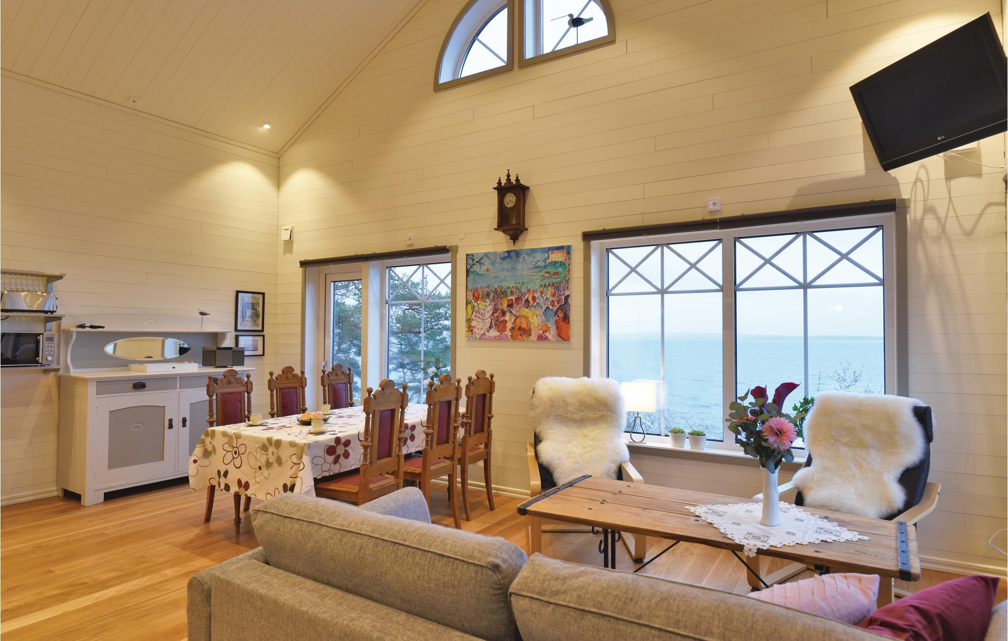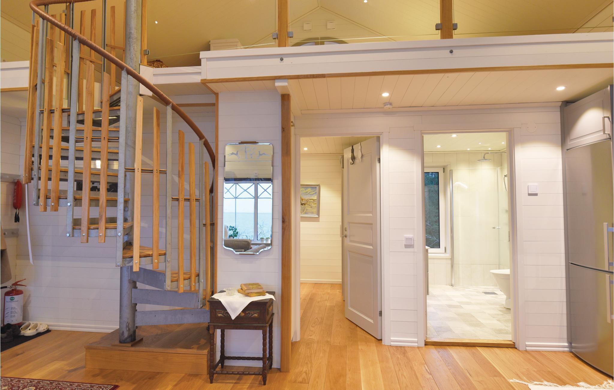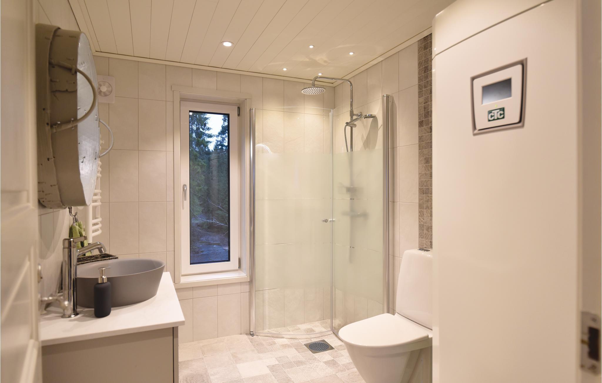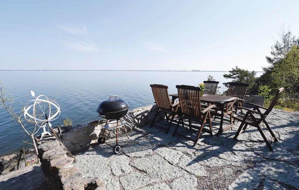 Tag familie eller venner med på en fantastisk ferie her, midt mellem skov, klipper og vand. Træd ind i det lyse og velindrettede køkkenalrum og lad roen sænke sig over jer. Her er højt til loftet og en smuk udsigt til vandet. Nyd morgenkaffen på terrassen, og lad jer indhylle i den storslåede natur omkring jer. Senere kan I samles og lækre grillmiddage og nyde de lyse sommeraftener, mens I venter på at stjernerne dukker op på himlen. Efter en aktiv dag vil det være oplagt med en tur i vildmarksbadet, hvor I kan nyde en kold forfriskning og udsigten over søen. Sten- og klippegrunden skråner mod søen.