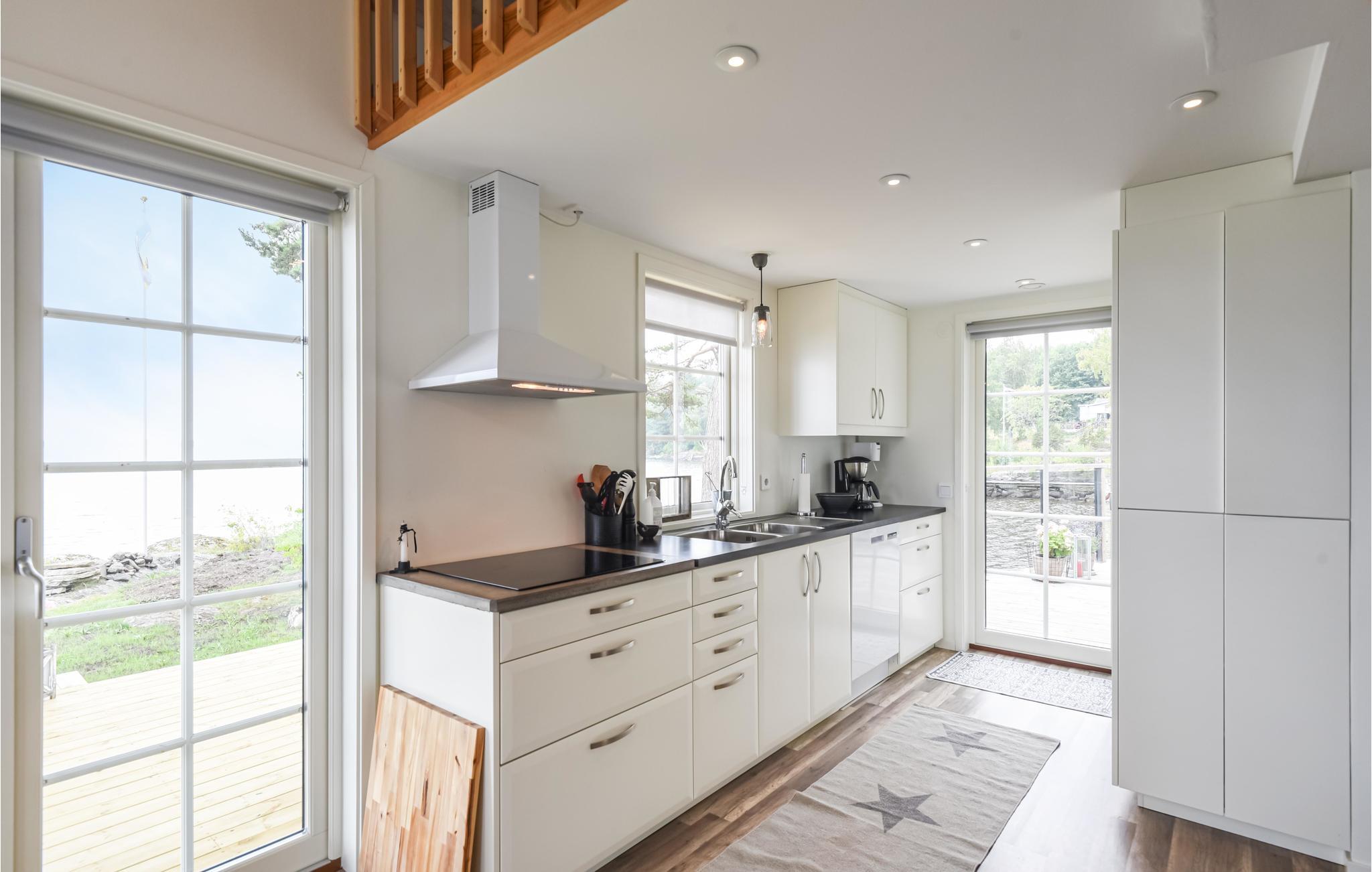 Feriehuset har en dejlig, åben grundplan med store lysindtag i køkken og stue, hvor I kan tilbringe masser af kvalitetstid sammen, mens måltiderne tilberedes. Her er også to soveværelser og en hems til to.