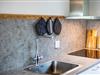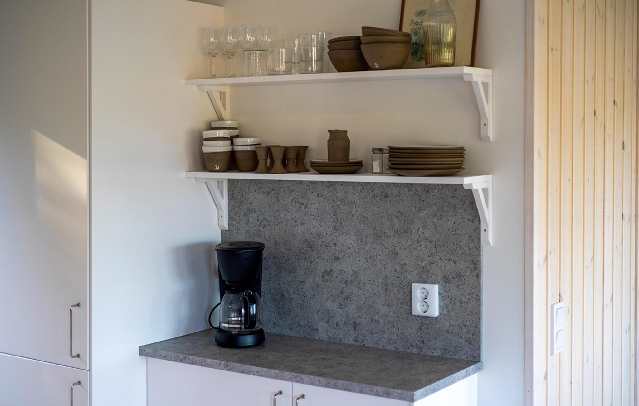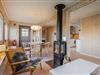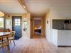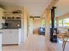 Træd ind i den indbydende stue med de store vinduer, der åbner ud mod det omkringliggende landskab. slå jer ned godt til rette i sofaen og nyd den knitrende ild i den fritstående brændeovn, der fylder rummet med behagelig varme. Spiseområdet med sine lyse træmøbler er perfekt til at dele måltider, mens det moderne køkken giver jer mulighed for at lave mad, selv på ferien.